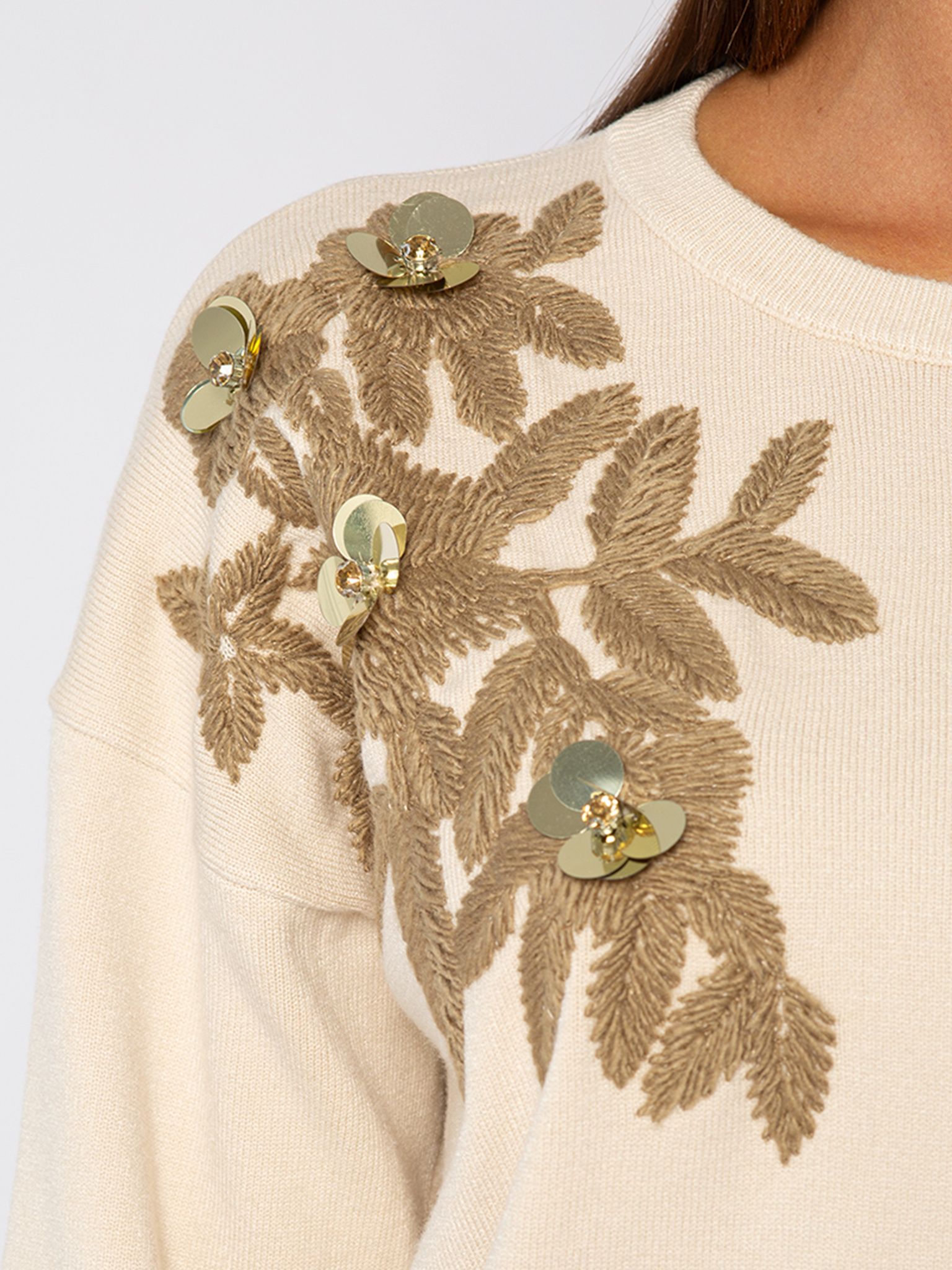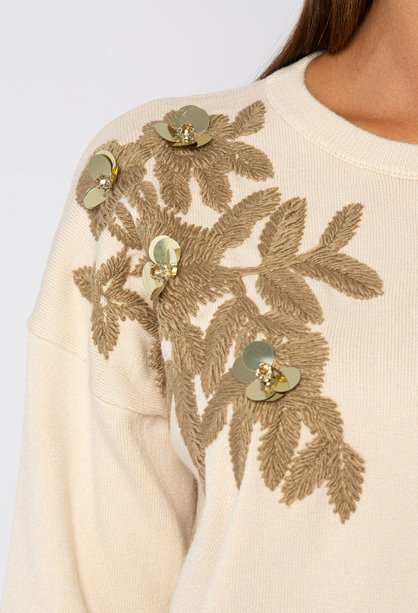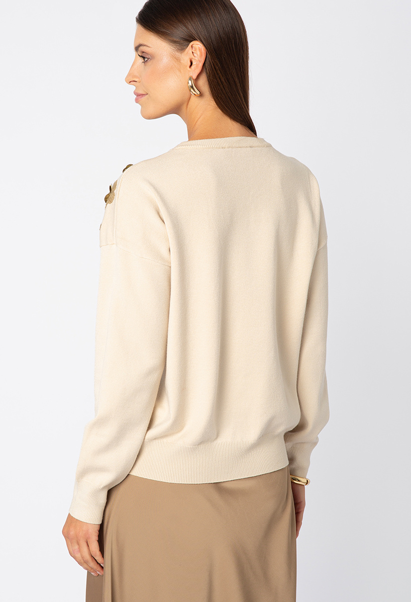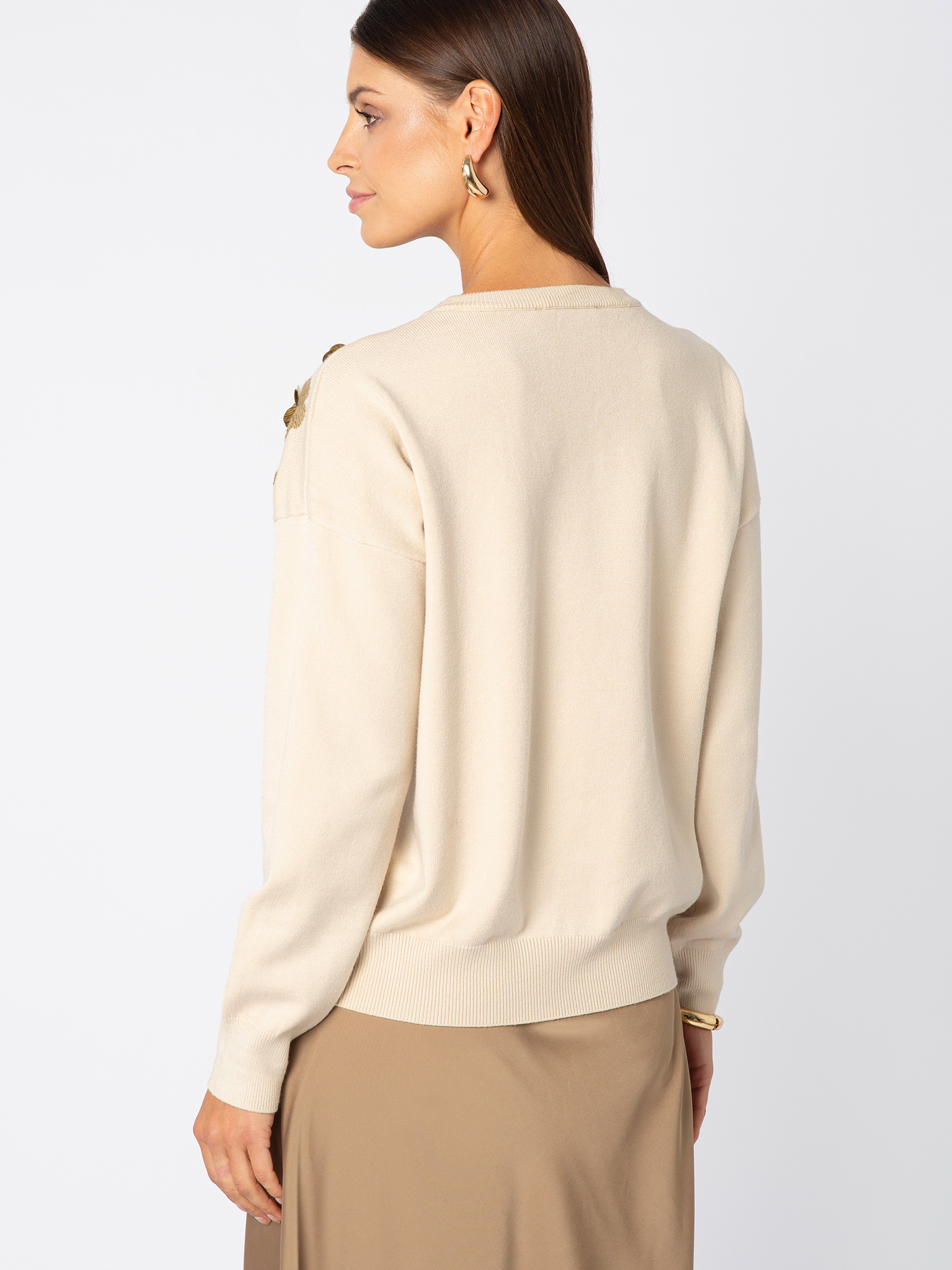 - Otul się miękką elegancją, sweter z aplikacją na ramionach to połączenie wygody i subtelnego wyrafinowania. Elastyczna, przyjemna w dotyku dzianina sprawia, że nosi się go z lekkością, a kontrastowa aplikacja dodaje nowoczesnego charakteru.