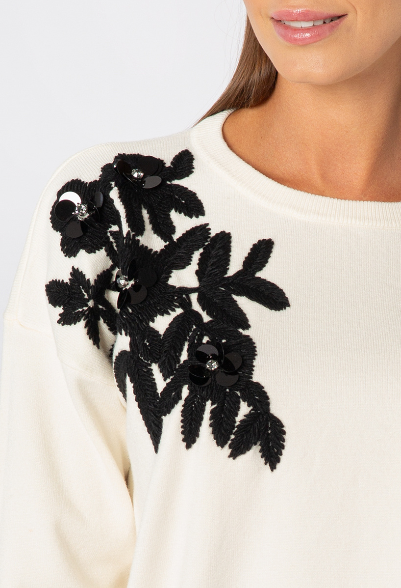 • Otul się miękką elegancją, sweter z aplikacją na ramionach to połączenie wygody i subtelnego wyrafinowania. Elastyczna, przyjemna w dotyku dzianina sprawia, że nosi się go z lekkością, a kontrastowa aplikacja dodaje nowoczesnego charakteru.