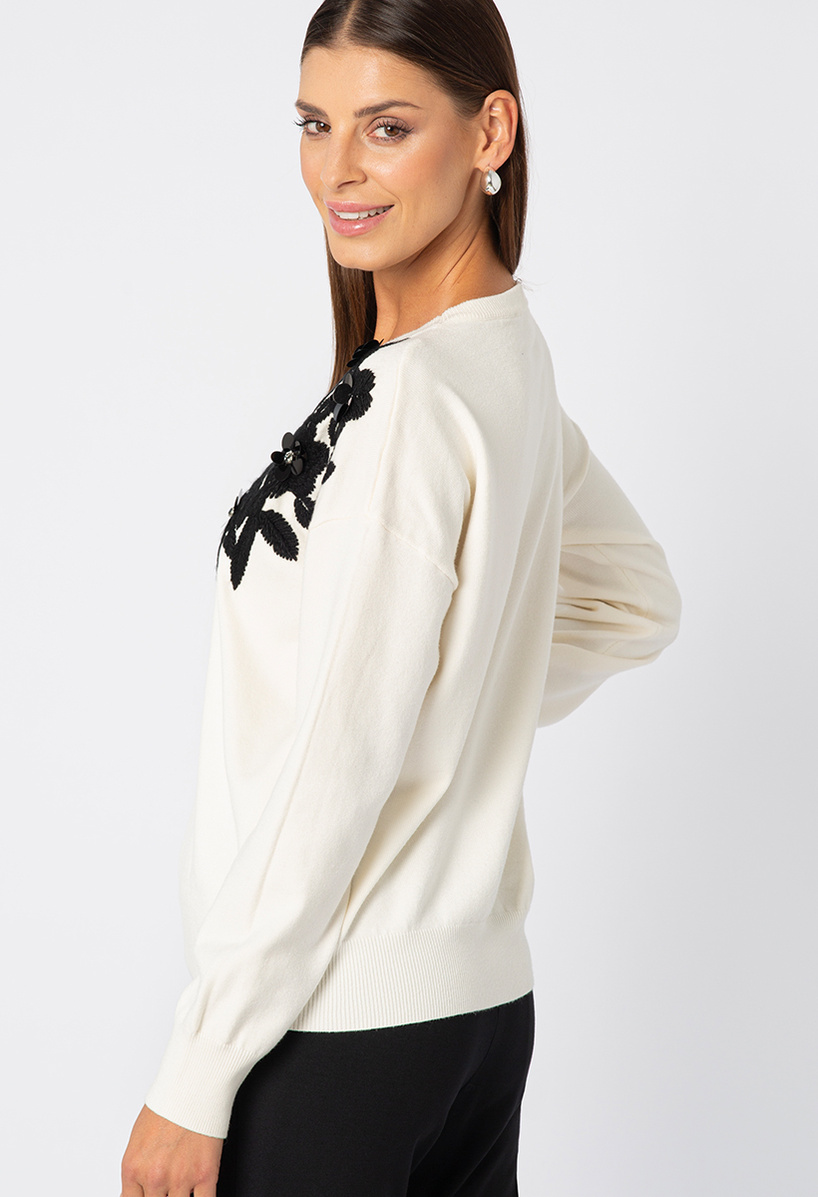 Otul się miękką elegancją – ecru sweter z czarną aplikacją na ramionach to połączenie wygody i subtelnego wyrafinowania. Okrągły dekolt i elastyczna, przyjemna w dotyku dzianina sprawiają, że nosi się go z prawdziwą lekkością, a kontrastowa aplikacja na ramionach dodaje nowoczesnego charakteru. Dzięki rozmiarowi one size sweter dopasowuje się do sylwetek od S do L, gwarantując komfort i swobodę ruchów. Idealny do jeansów, eleganckich spodni czy spódnicy – tworzy stylizacje, które łączą klasyczny styl z nutą artystycznego sznytu.