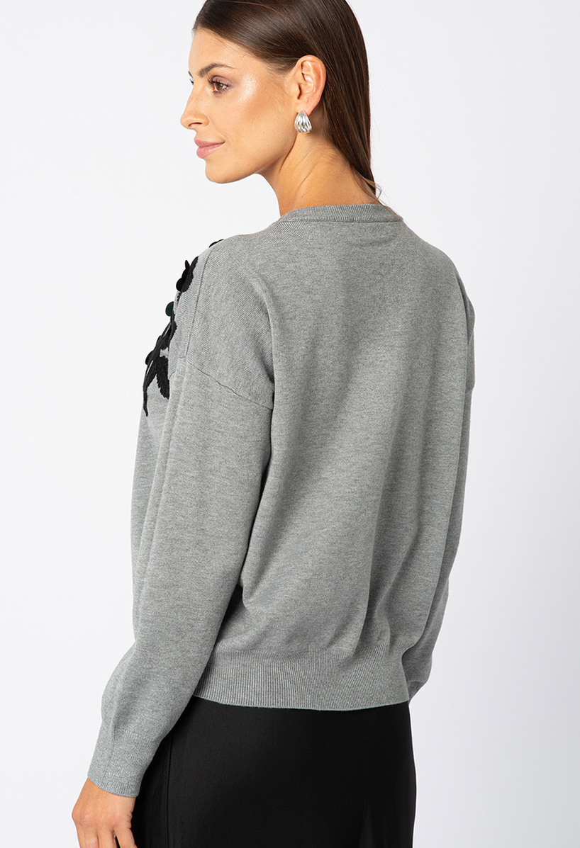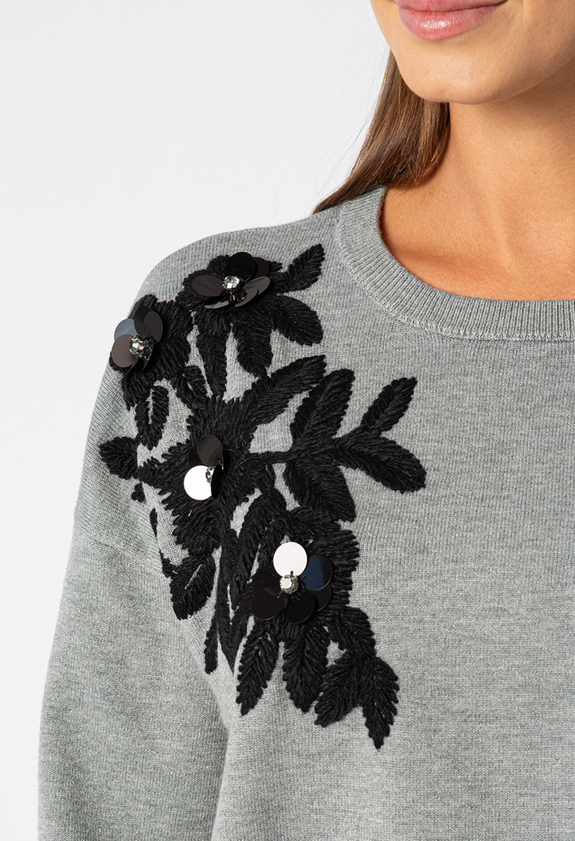 Szary sweter z czarną aplikacją na ramionach