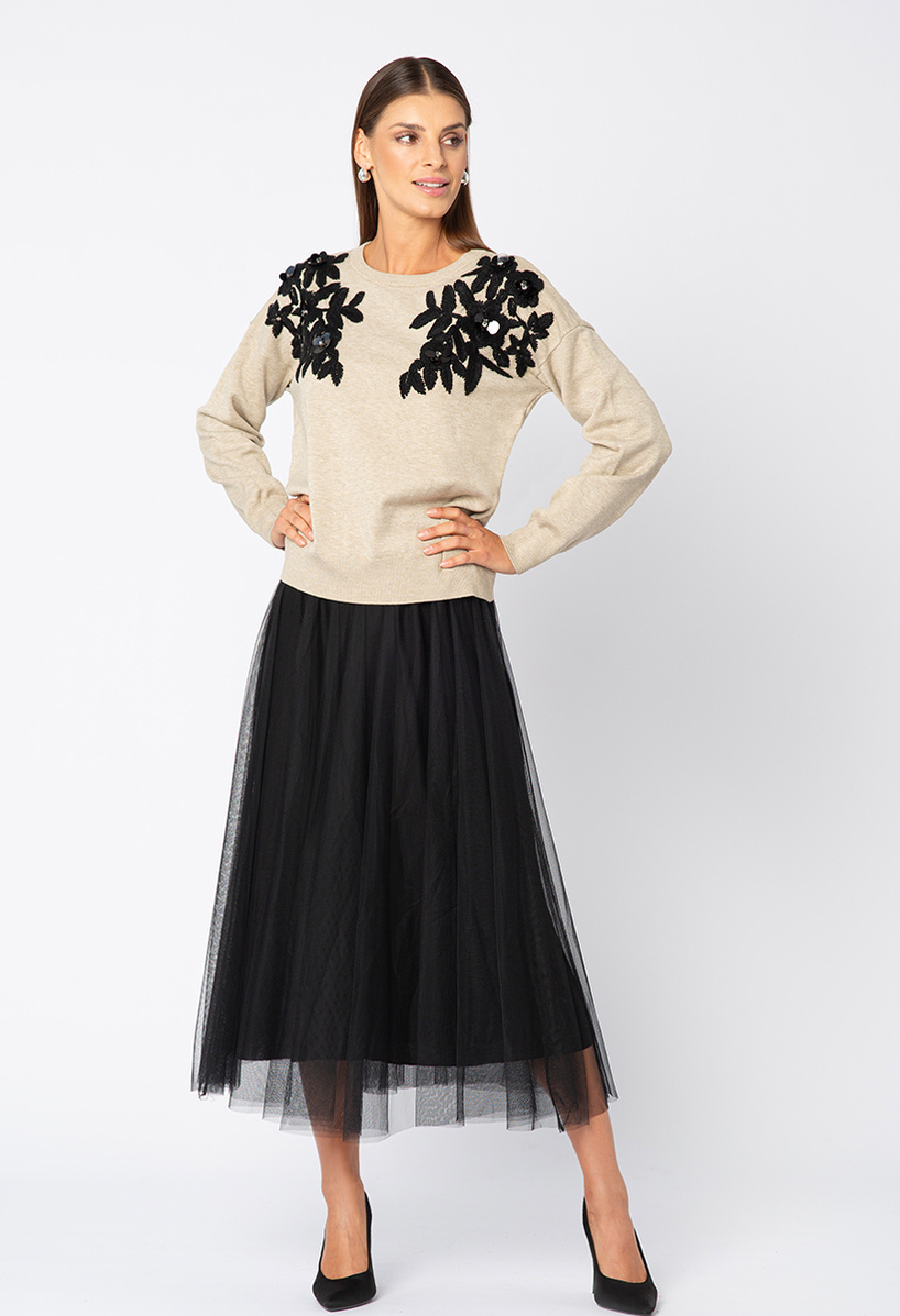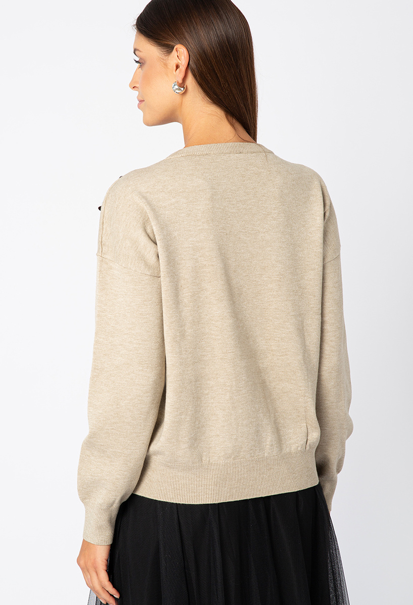 - Otul się miękką elegancją, sweter z aplikacją na ramionach to połączenie wygody i subtelnego wyrafinowania. Elastyczna, przyjemna w dotyku dzianina sprawia, że nosi się go z lekkością, a kontrastowa aplikacja dodaje nowoczesnego charakteru.