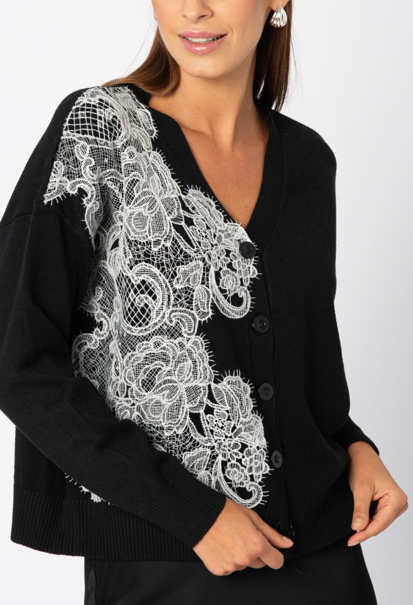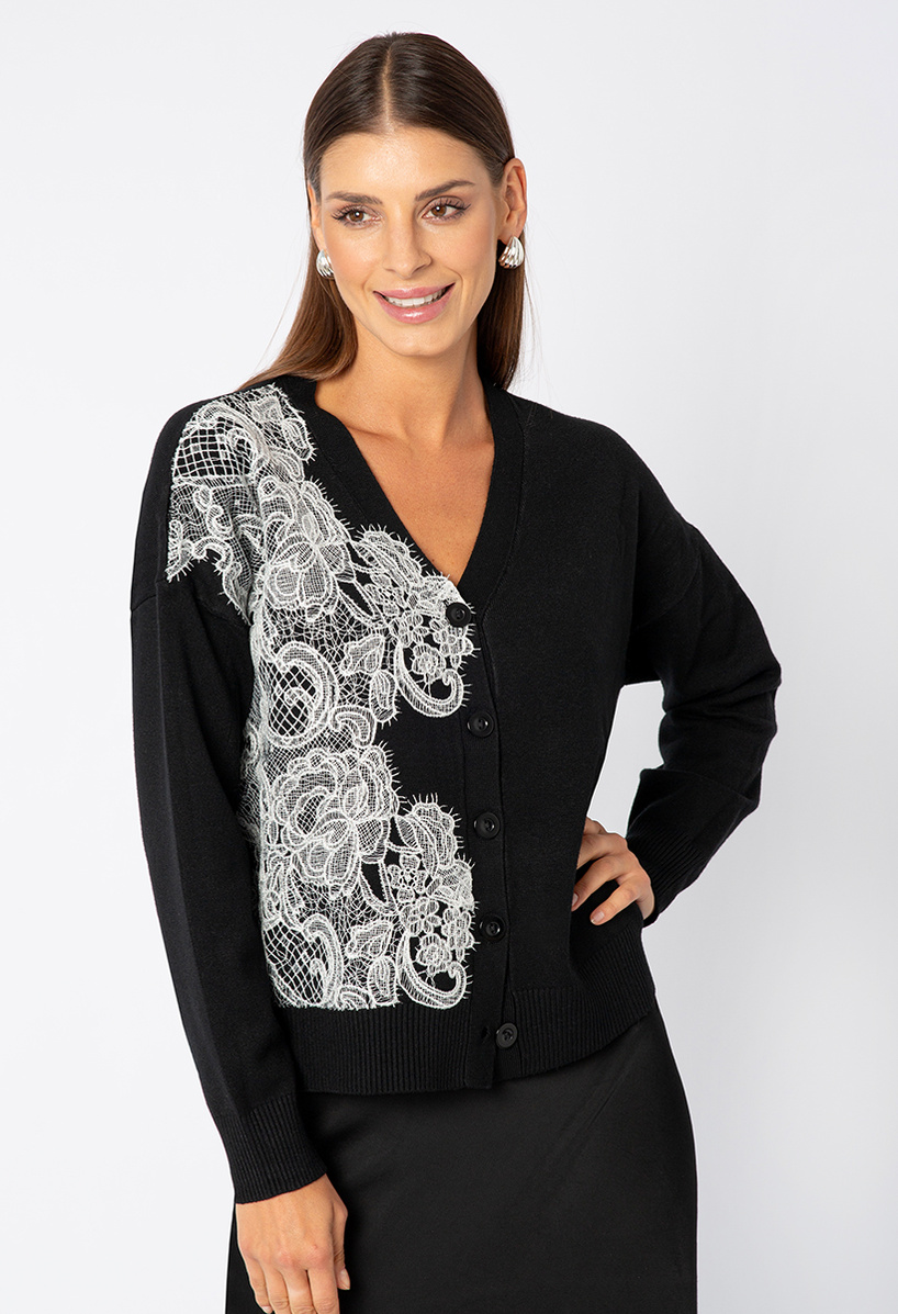 Subtelna elegancja w codziennym wydaniu — sweter zapinany na guziki łączy w sobie wygodę i kobiecy detal. Delikatna koronka umieszczona po boku nadaje mu lekkości i wyjątkowego charakteru, dzięki czemu klasyczny fason staje się nieoczywisty. Wersja one size idealnie dopasowuje się do sylwetek od S do XL, oferując komfort noszenia i uniwersalność w stylizacjach — od casualowych po bardziej wyrafinowane.