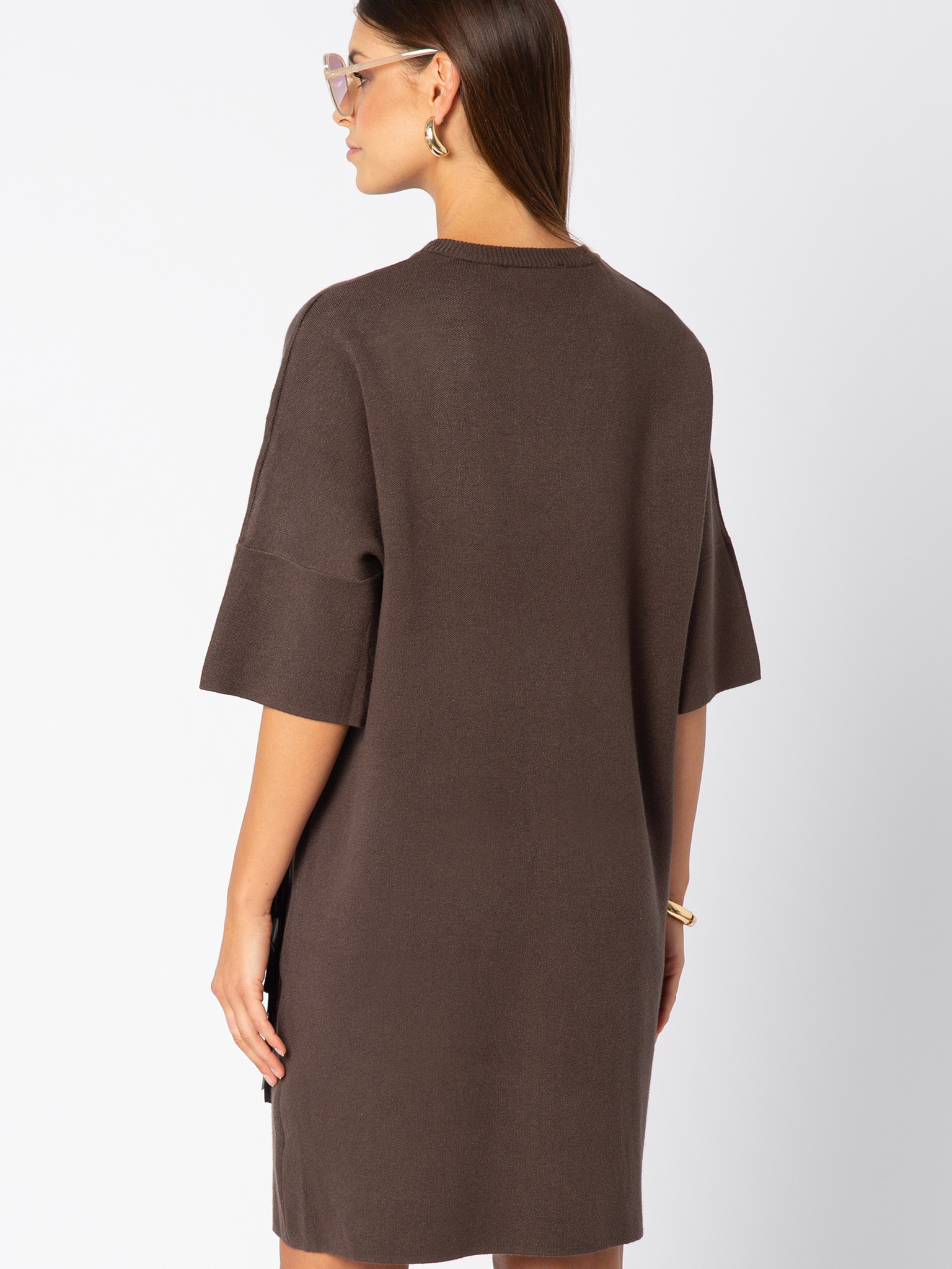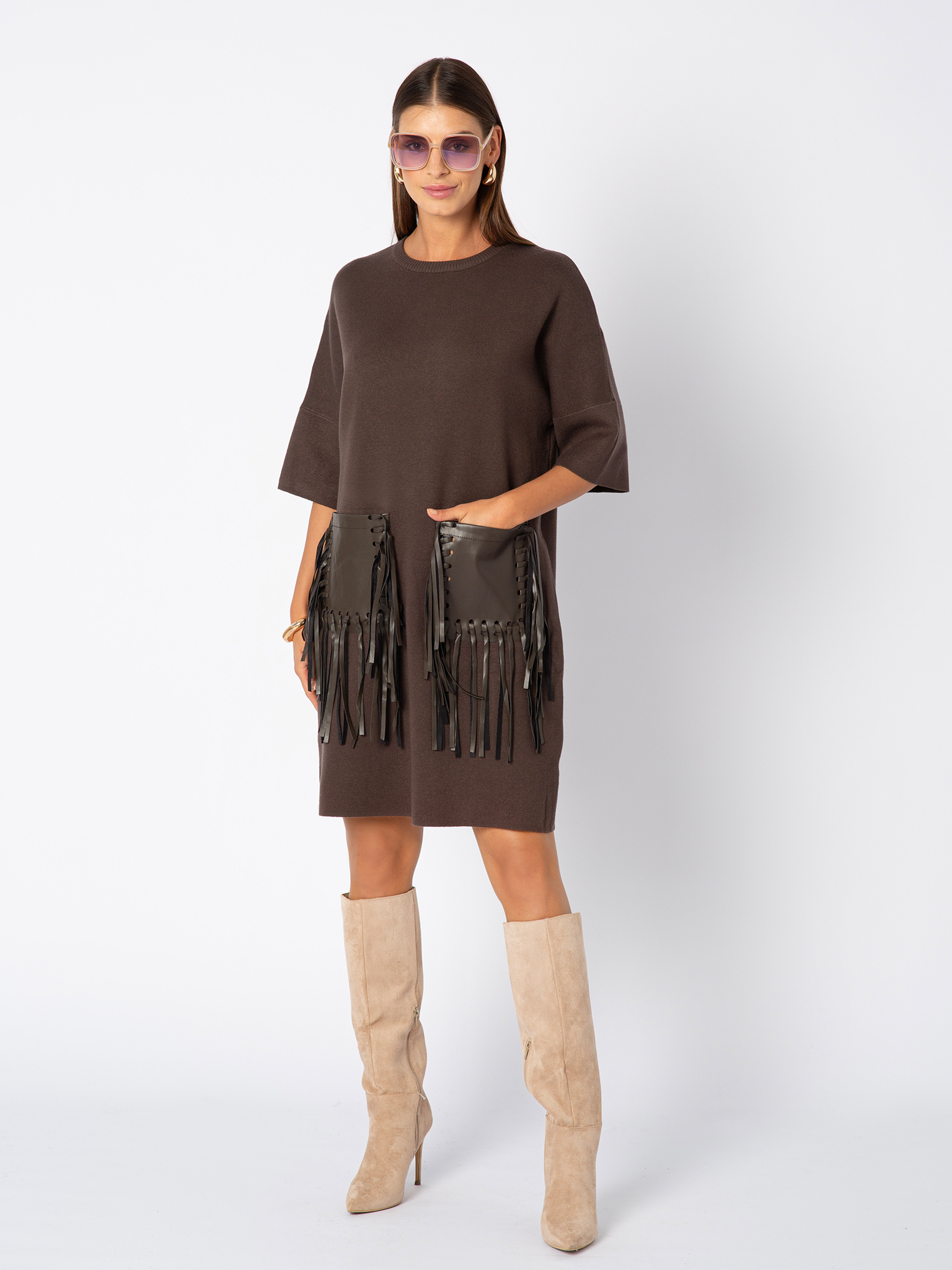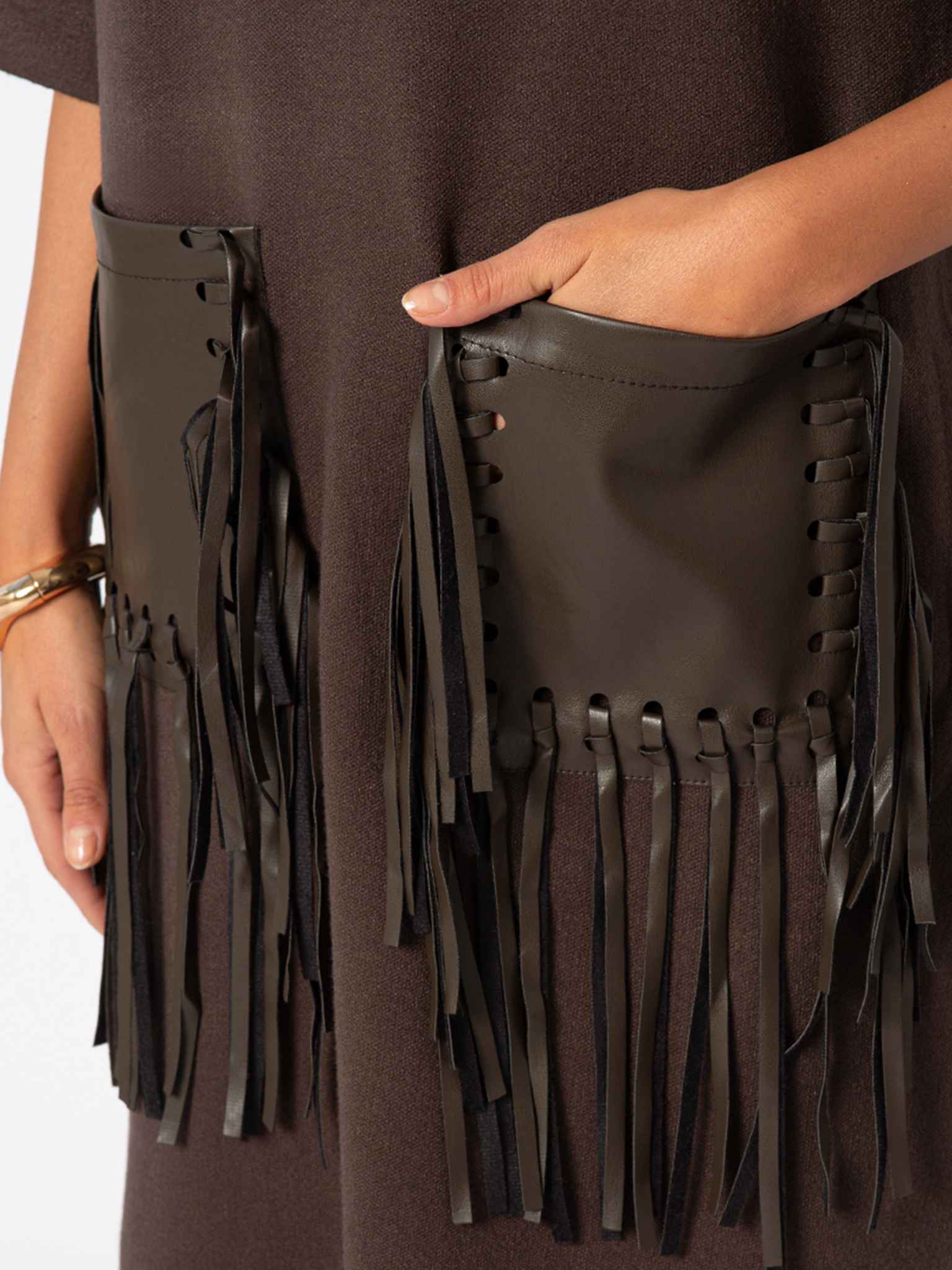Subtelna i pełna charakteru — brązowa sukienka z krótkim rękawem to połączenie komfortu i nowoczesnego stylu. Wykonana z przyjemnej dzianiny, miękko otula sylwetkę, a długość przed kolano nadaje całości lekkości. Charakterystycznym akcentem są kieszenie wykończone frędzlami, która dodaje sukience dynamiki i niebanalnego uroku.