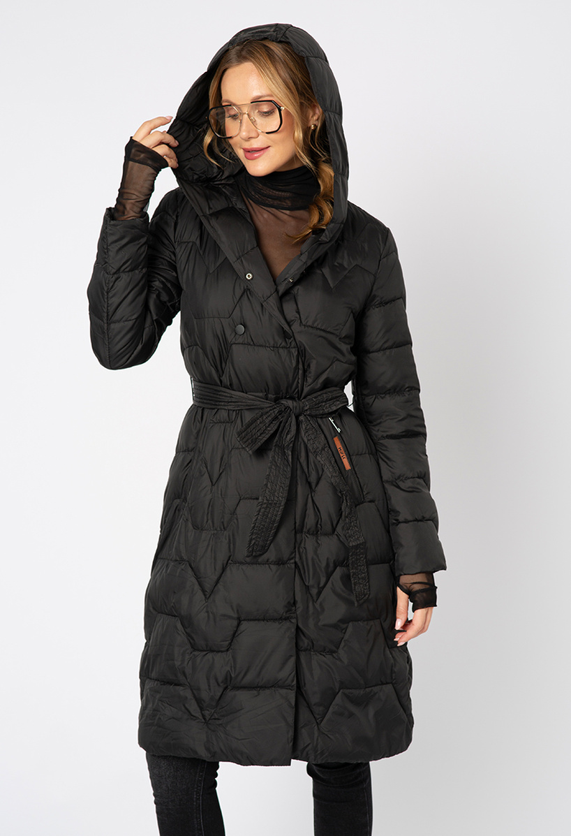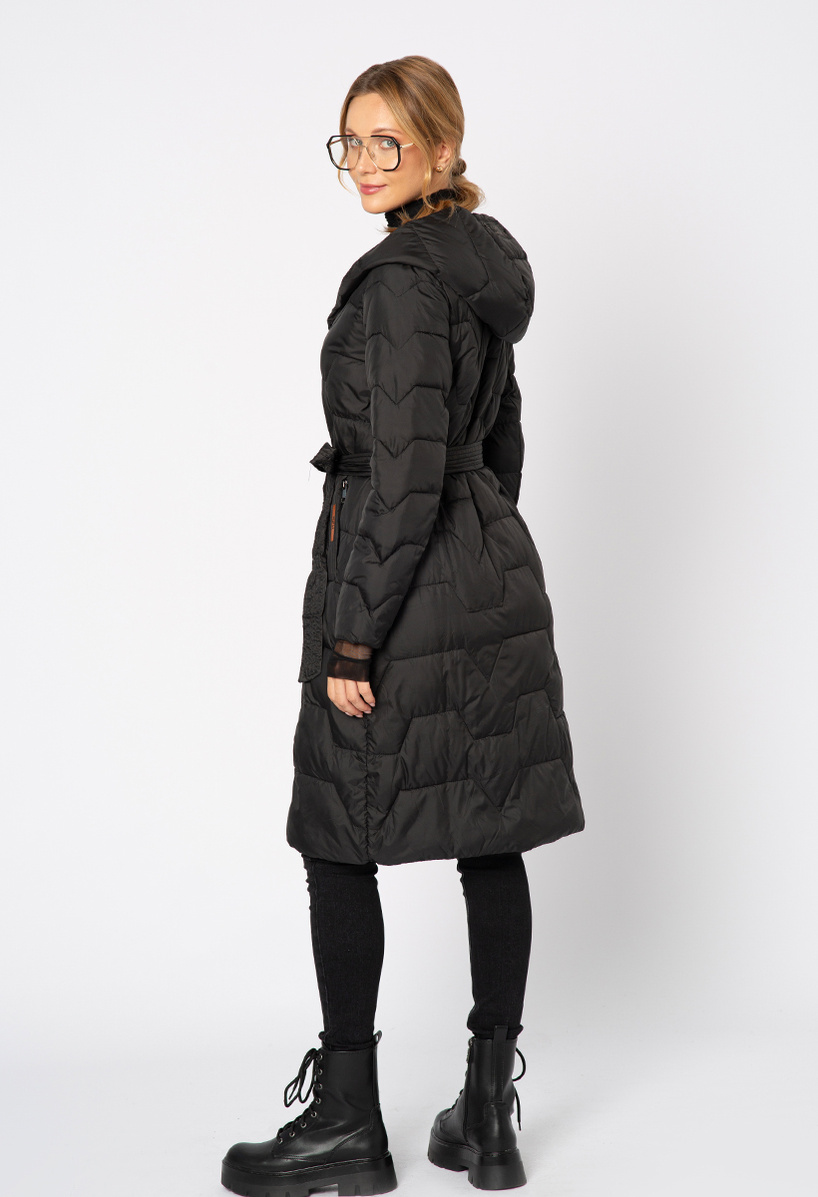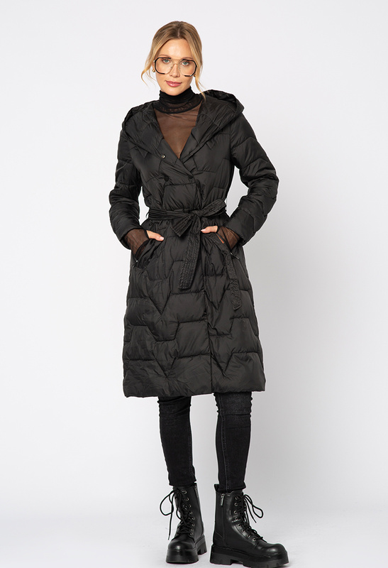Otulający i pełen szyku — czarny, wiązany płaszcz z pikowanej tkaniny to kwintesencja elegancji w nowoczesnym wydaniu. Obszerny kaptur dodaje mu charakteru i funkcjonalności, a długość za kolano sprawia, że całość prezentuje się niezwykle harmonijnie i kobieco. Zapinany na ukryte zatrzaski. Pasek przewiązywany w talii pozwala idealnie dopasować płaszcz do sylwetki, podkreślając jej proporcje. To model, który łączy wygodę z wyrafinowanym stylem — idealny na chłodne dni, kiedy chcesz czuć się jednocześnie komfortowo i wyjątkowo.