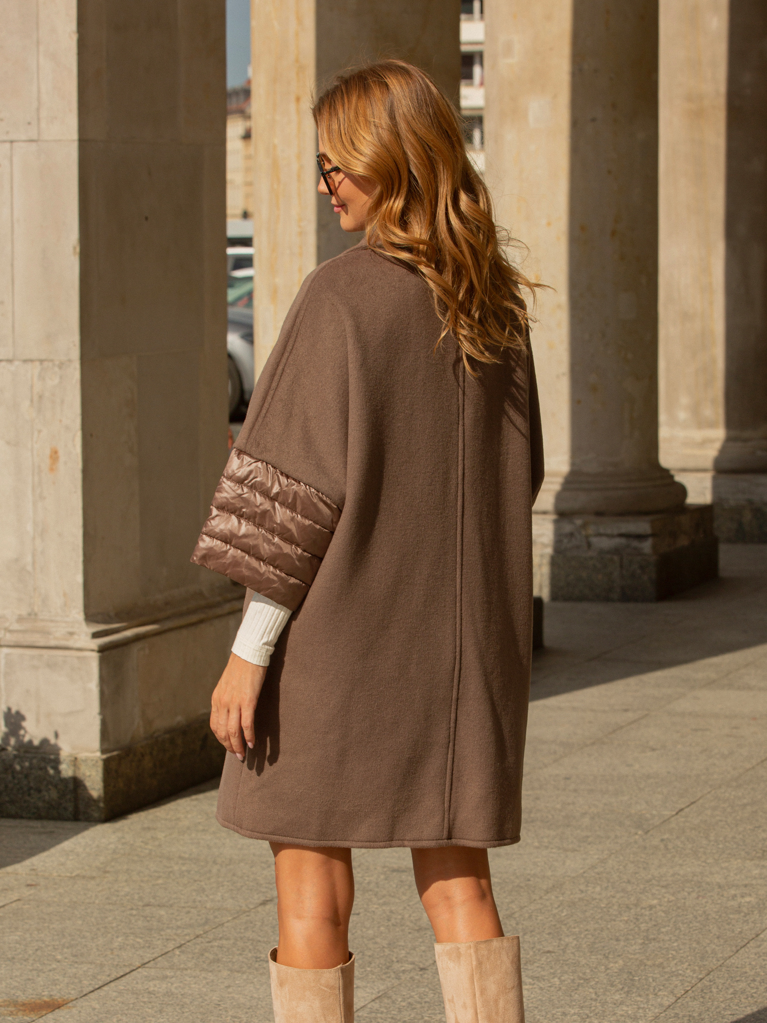 Beżowy szeroki płaszcz z pikowanym kołnierzem i rękawem