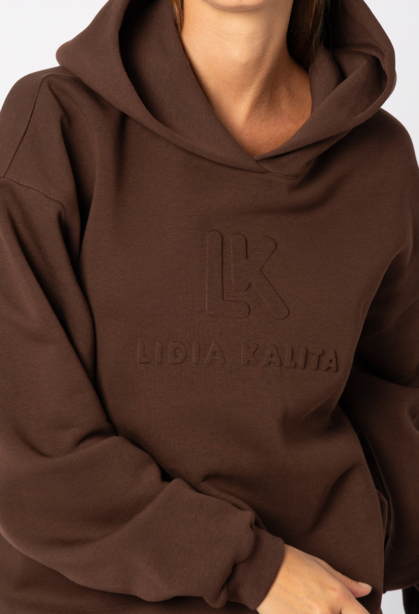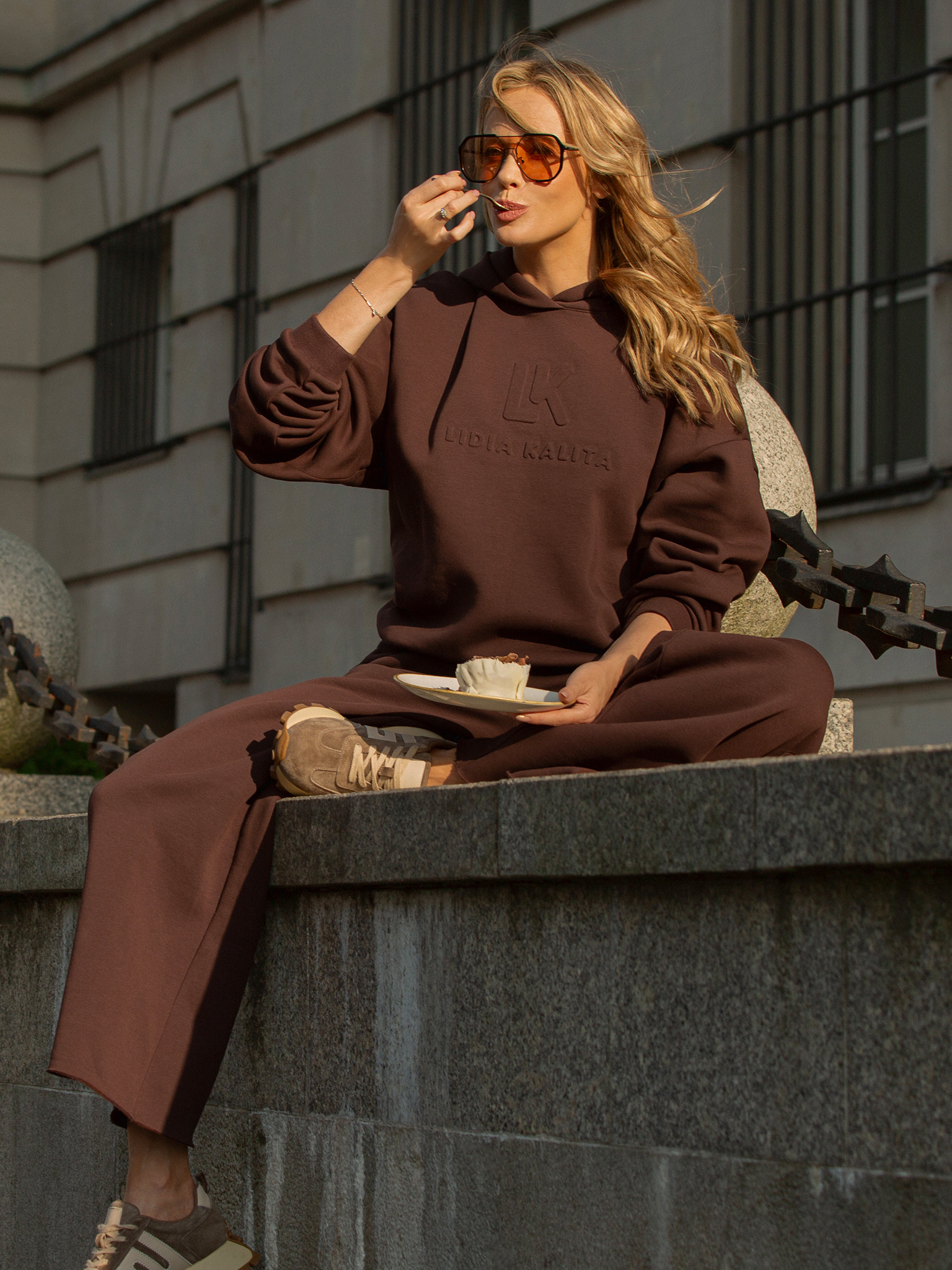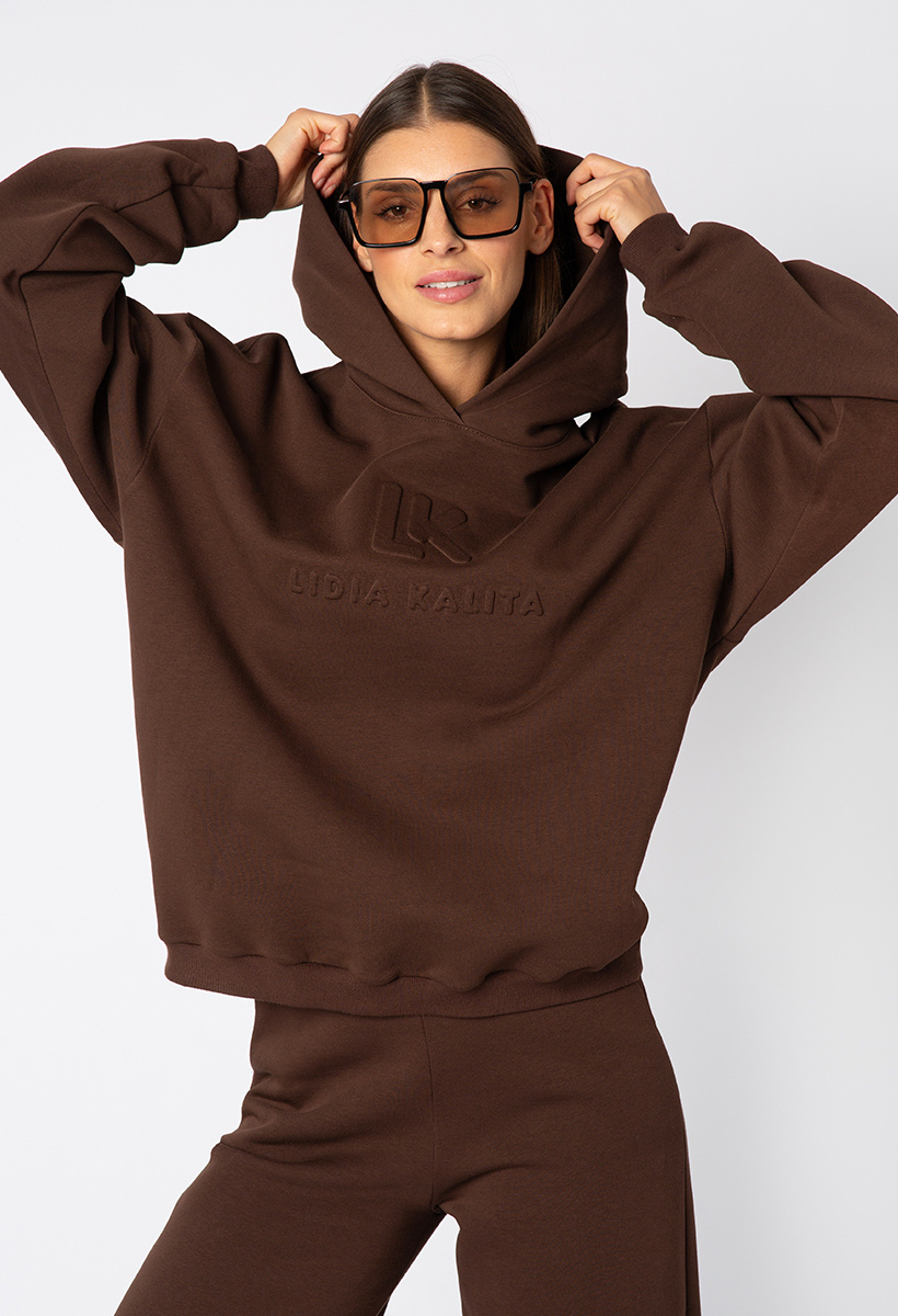 Słodka i wciągająca jak filiżanka gorącej czekolady — czekoladowa bluza Choco z kolekcji Coffee in Paris to esencja przytulnego luksusu. Klasyczny fason z kapturem, subtelne tłoczenie z logo Lidia Kalita z przodu i elegancki, czekoladowy odcień sprawiają, że to model, po który będziesz sięgać każdego dnia.