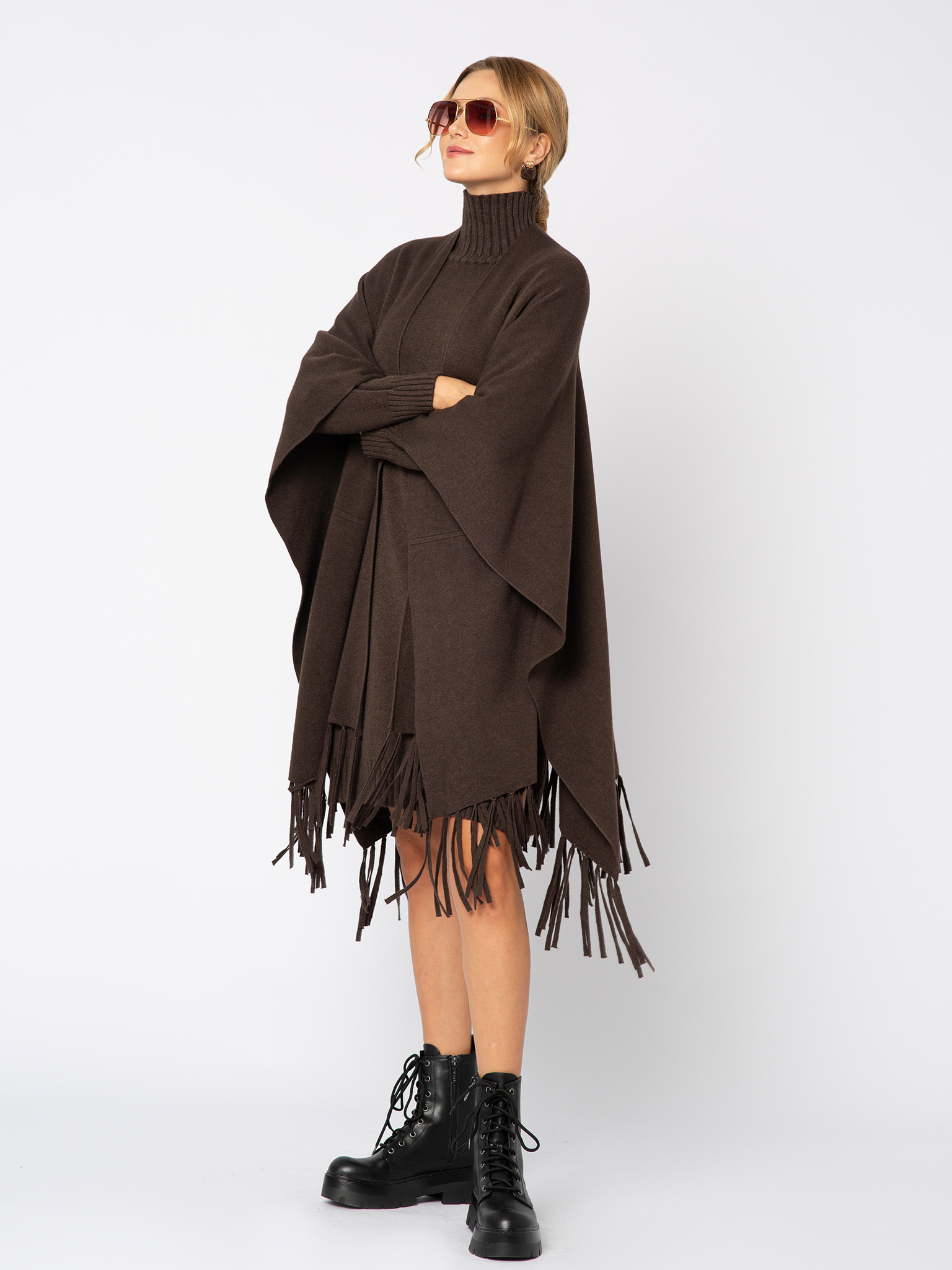 Otulający i pełen lekkości — sweter ponczo to kwintesencja jesiennego komfortu w stylowym wydaniu. Luźna forma z frędzlami wykańczającymi dół nadaje mu nonszalanckiego charakteru i subtelnie nawiązuje do boho estetyki. To model, który z łatwością zestawisz z dopasowanymi spodniami czy sukienką, tworząc look w duchu effortless chic. Idealny na chłodniejsze dni, kiedy chcesz czuć się swobodnie, ale nadal wyjątkowo.
