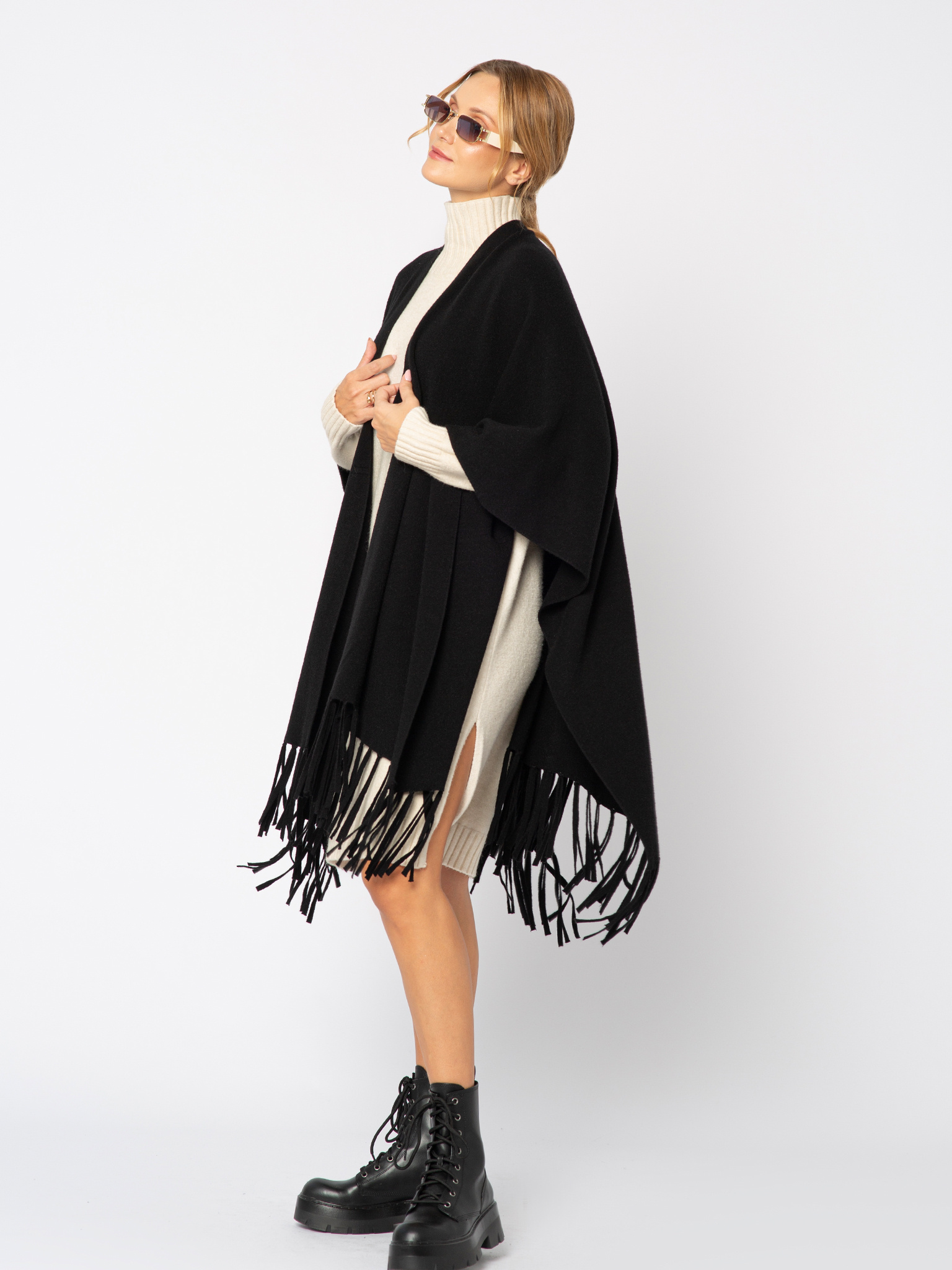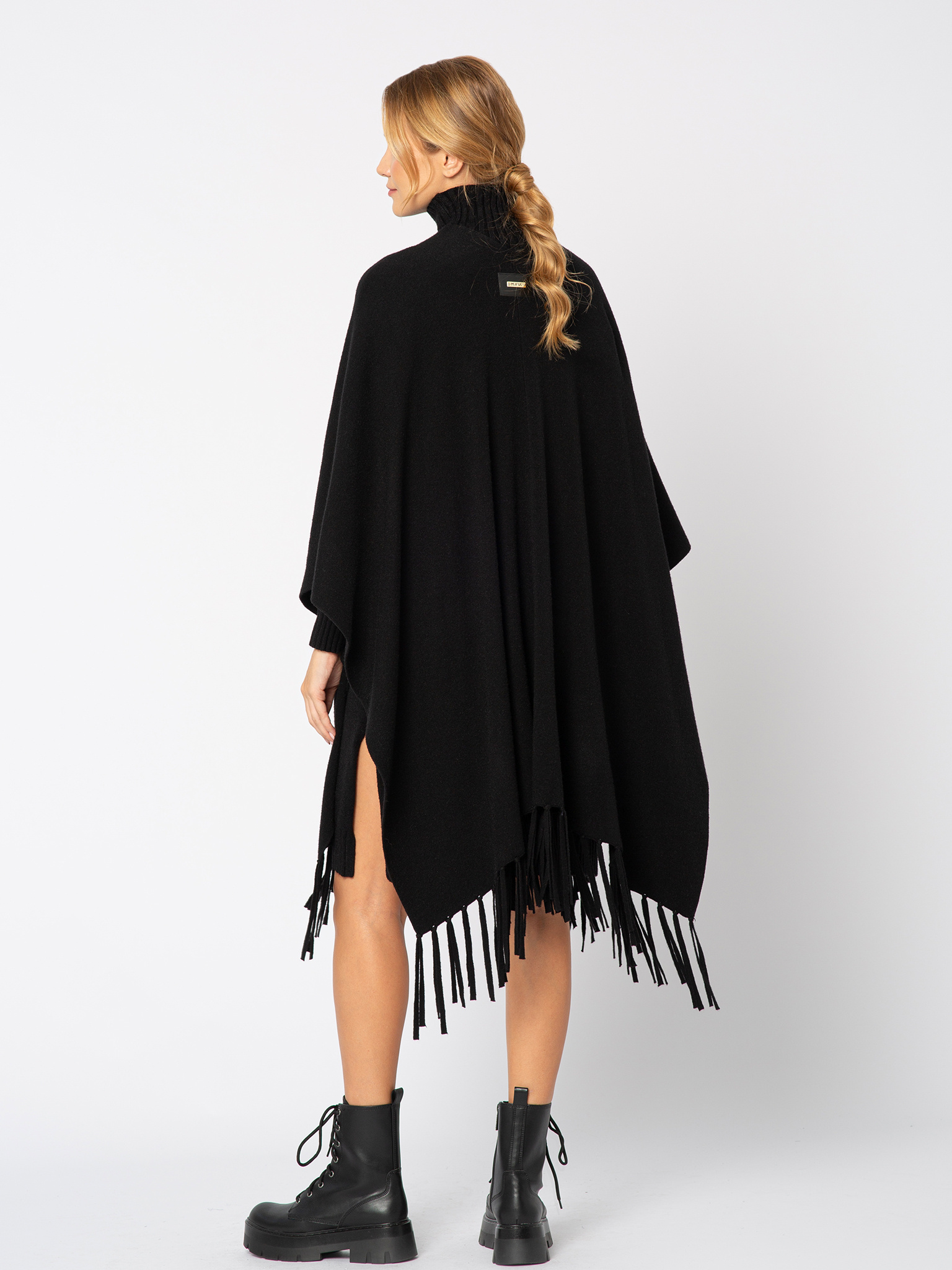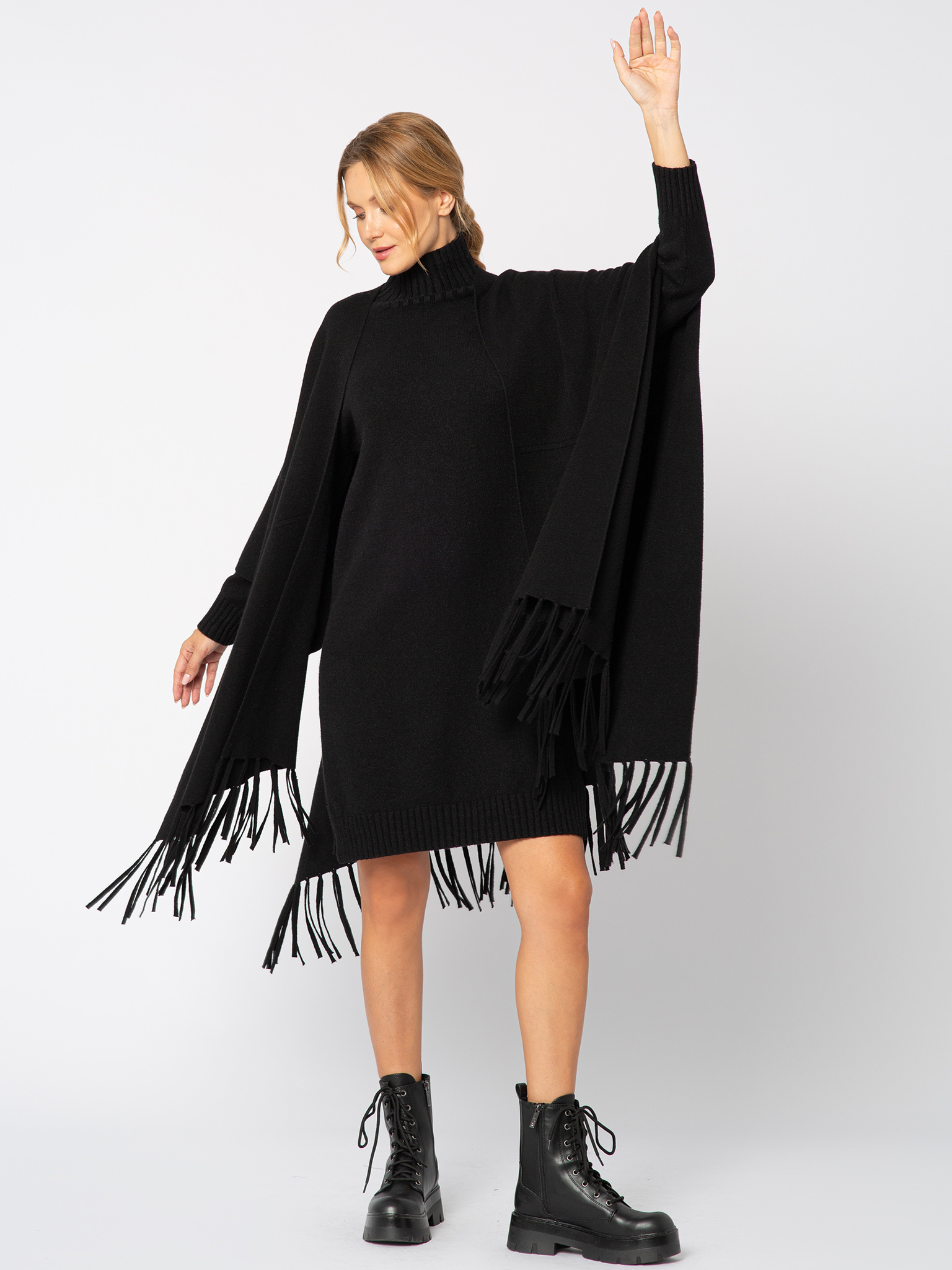 Czarny sweter ponczo z frędzlami