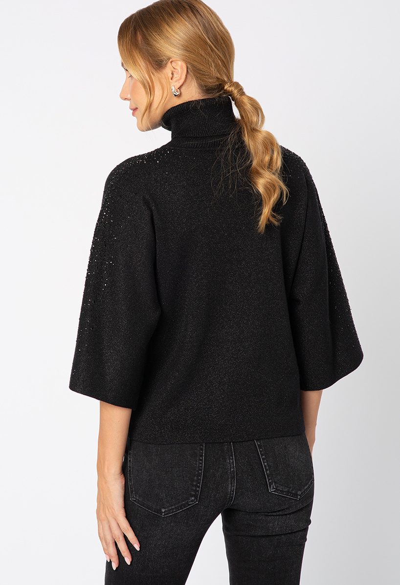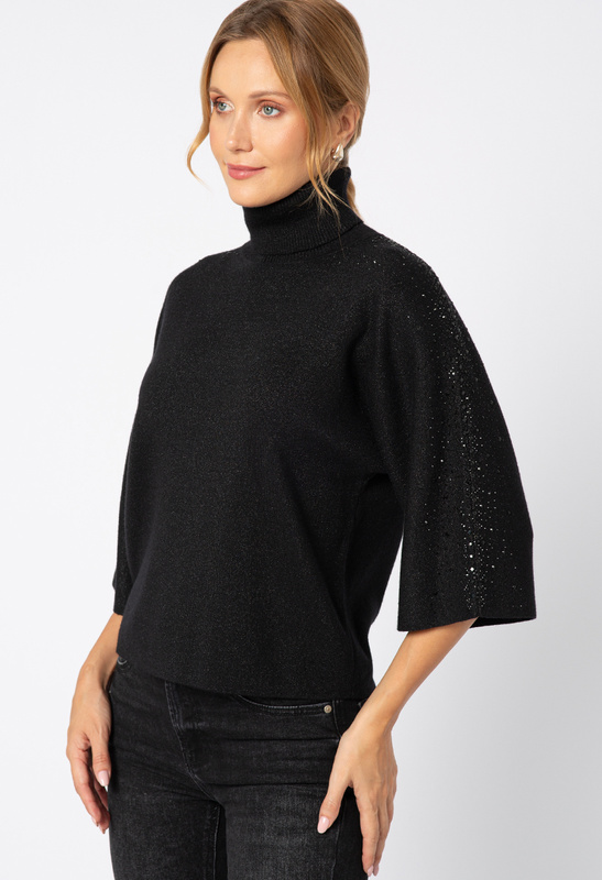 Miękkość, komfort i odrobina magii — sweter z golfem o prostym kroju zachwyca subtelnym detalem, który czyni go wyjątkowym. Trapezowe, lekko rozszerzające się rękawy zostały ozdobione pasmem delikatnych, iskrzących się kryształków biegnących od ramienia aż do końca ich długości. To nieoczywiste połączenie codziennej wygody z nutą luksusu, które sprawia, że sweter staje się czymś więcej niż bazowym elementem garderoby. Idealny zarówno na co dzień, jak i na wieczór, gdy chcesz poczuć się wyjątkowo w prosty, ale wyrafinowany sposób.