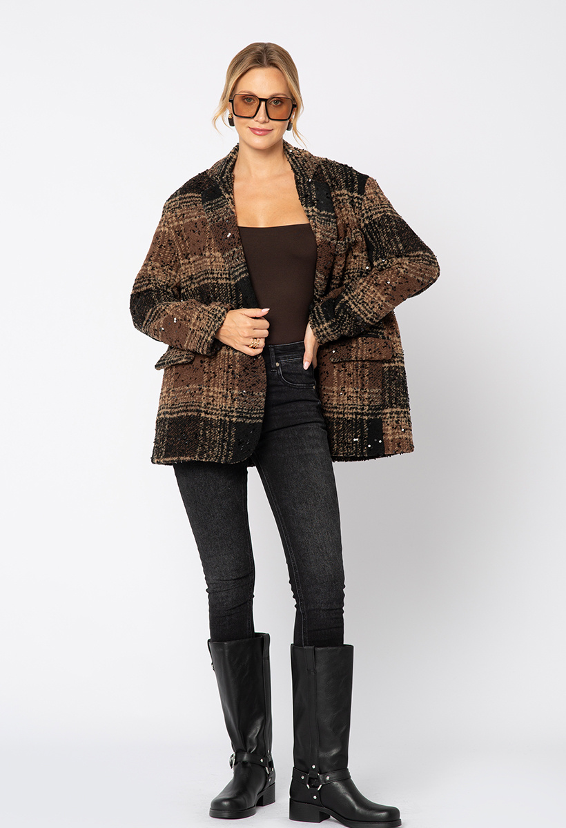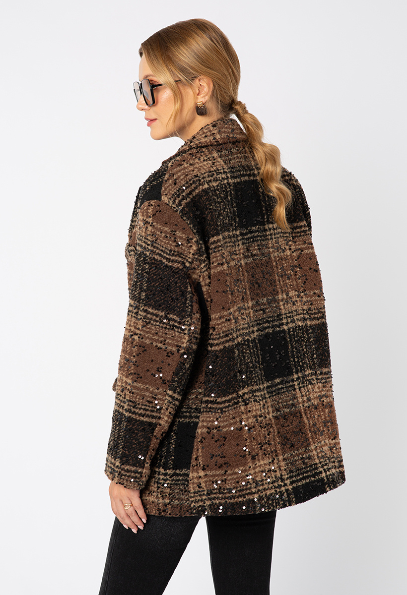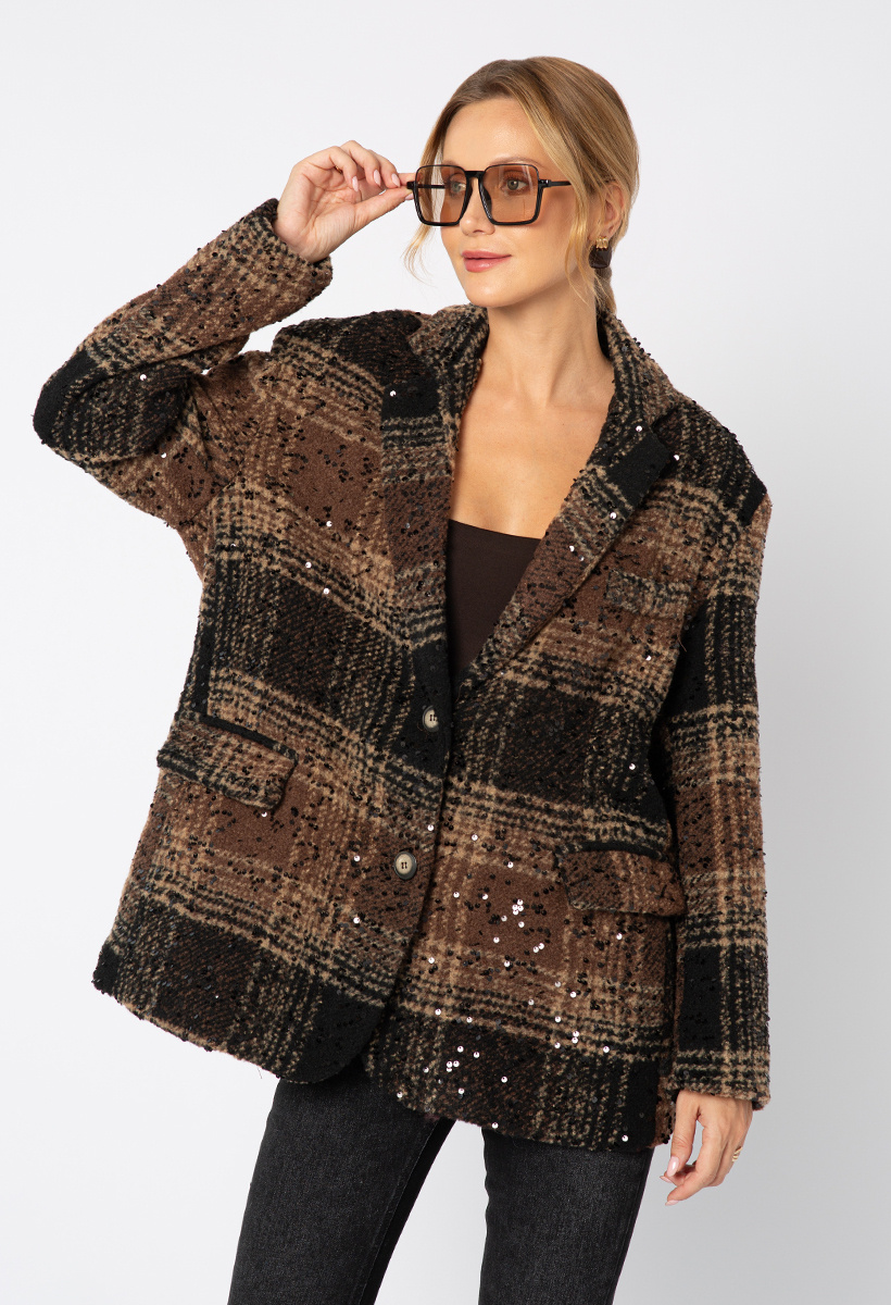 Klasyka z nieoczywistym twistem — oversizowa marynarka w brązową kratkę została subtelnie ozdobiona delikatnymi cekinami, które w świetle tworzą efekt miękkiego, dyskretnego blasku. Jej luźny krój dodaje stylizacji lekkości i nowoczesnej nonszalancji, a ponadczasowy wzór w kratę zyskuje nową, glamour odsłonę. To model, który sprawdzi się zarówno w ciągu dnia, jak i wieczorem, gdy chcesz wyglądać elegancko, ale z charakterem.