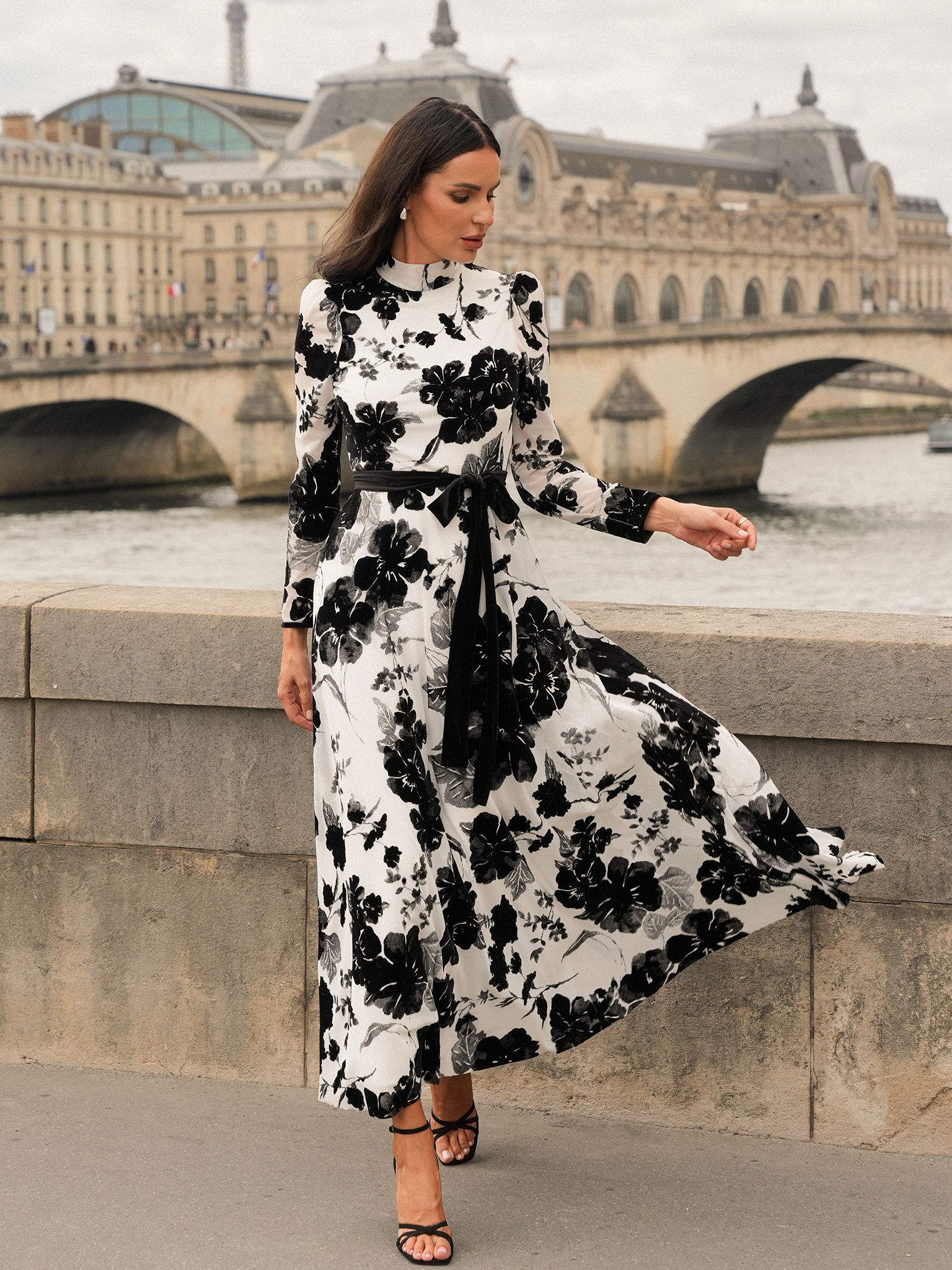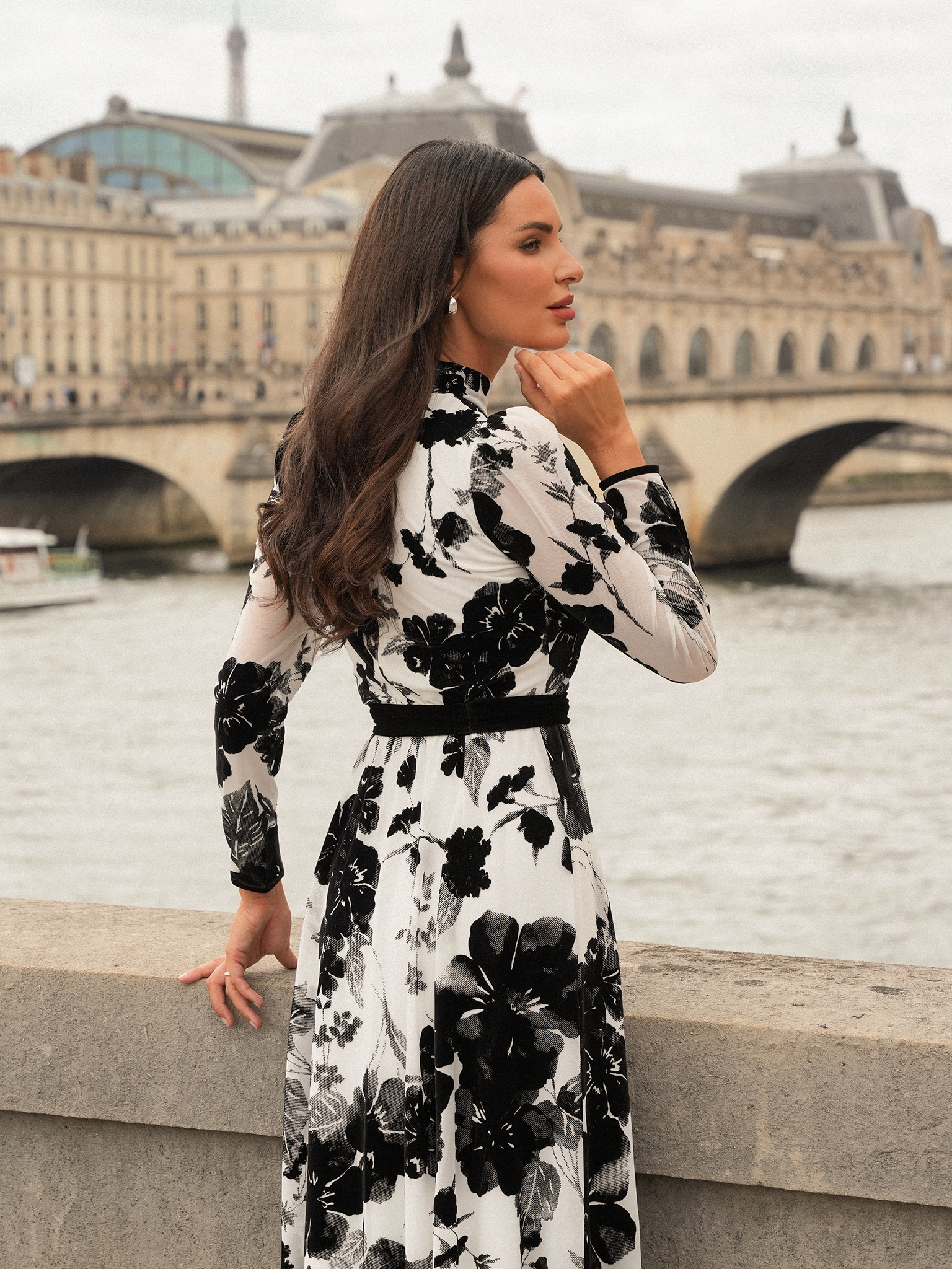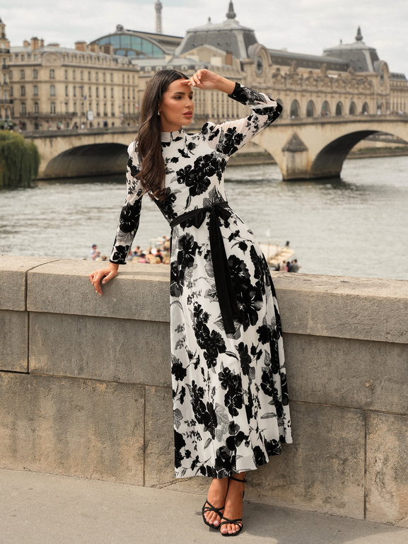 Spektakularna i pełna ponadczasowej elegancji – Aida w wersji ecru z czarnym flockiem to prawdziwa aria mody. Długość maxi i rozkloszowany dół nadają jej lekkości przy każdym kroku, podczas gdy dopasowana góra subtelnie rzeźbi sylwetkę. Mini golf i dopasowane rękawy z delikatnymi bufkami na ramionach wprowadzają romantyczny, wręcz operowy akcent – charakterystyczny dla całej kolekcji L’Opéra. Welurowy pasek w talii nie tylko podkreśla proporcje, ale i dodaje całości teatralnego wykończenia. To kreacja dla kobiety, która pragnie czuć się wyjątkowo i zostawić po sobie niezapomniane wrażenie – niczym bohaterka na wielkiej scenie Opery Garnier.