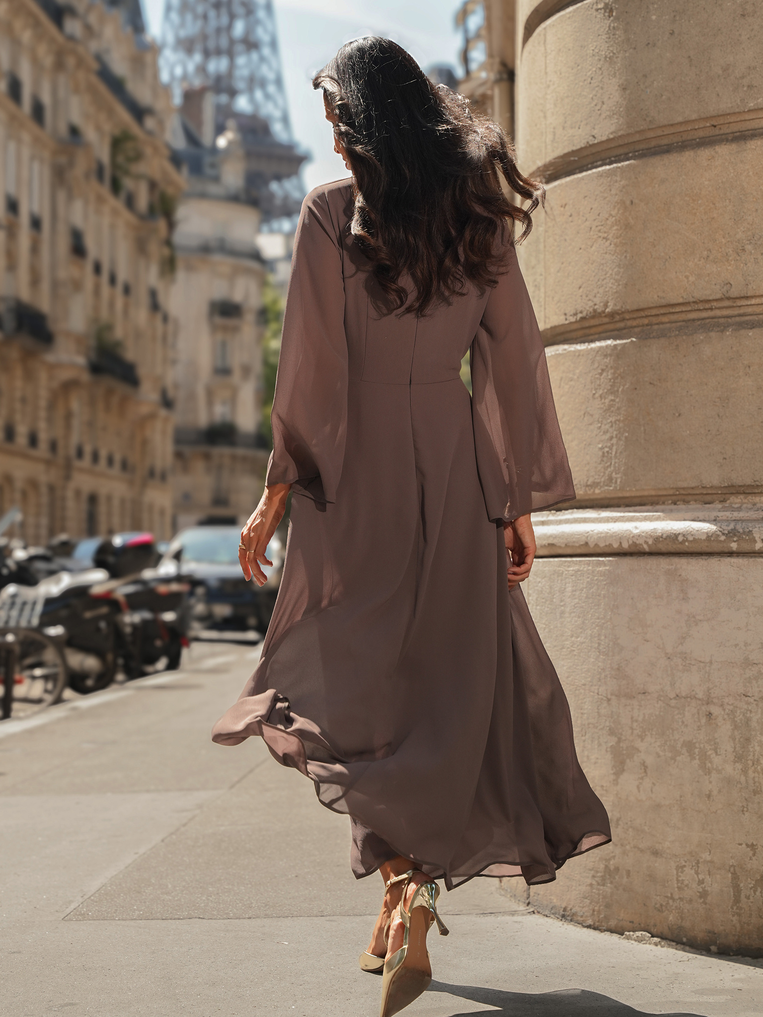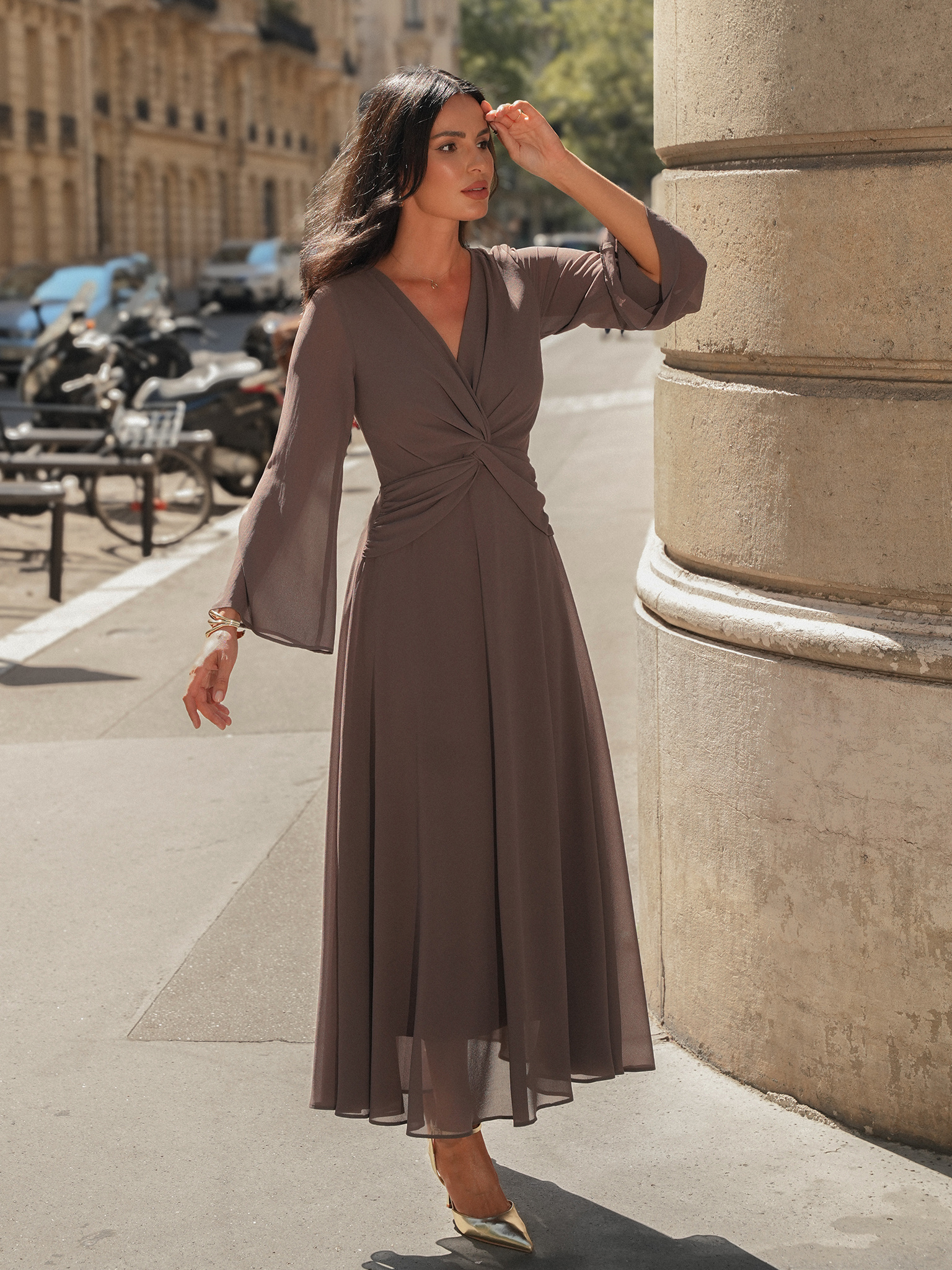 Sukienka w kolorze mocha z ozdobną talią i szerszym rękawem Magdalene