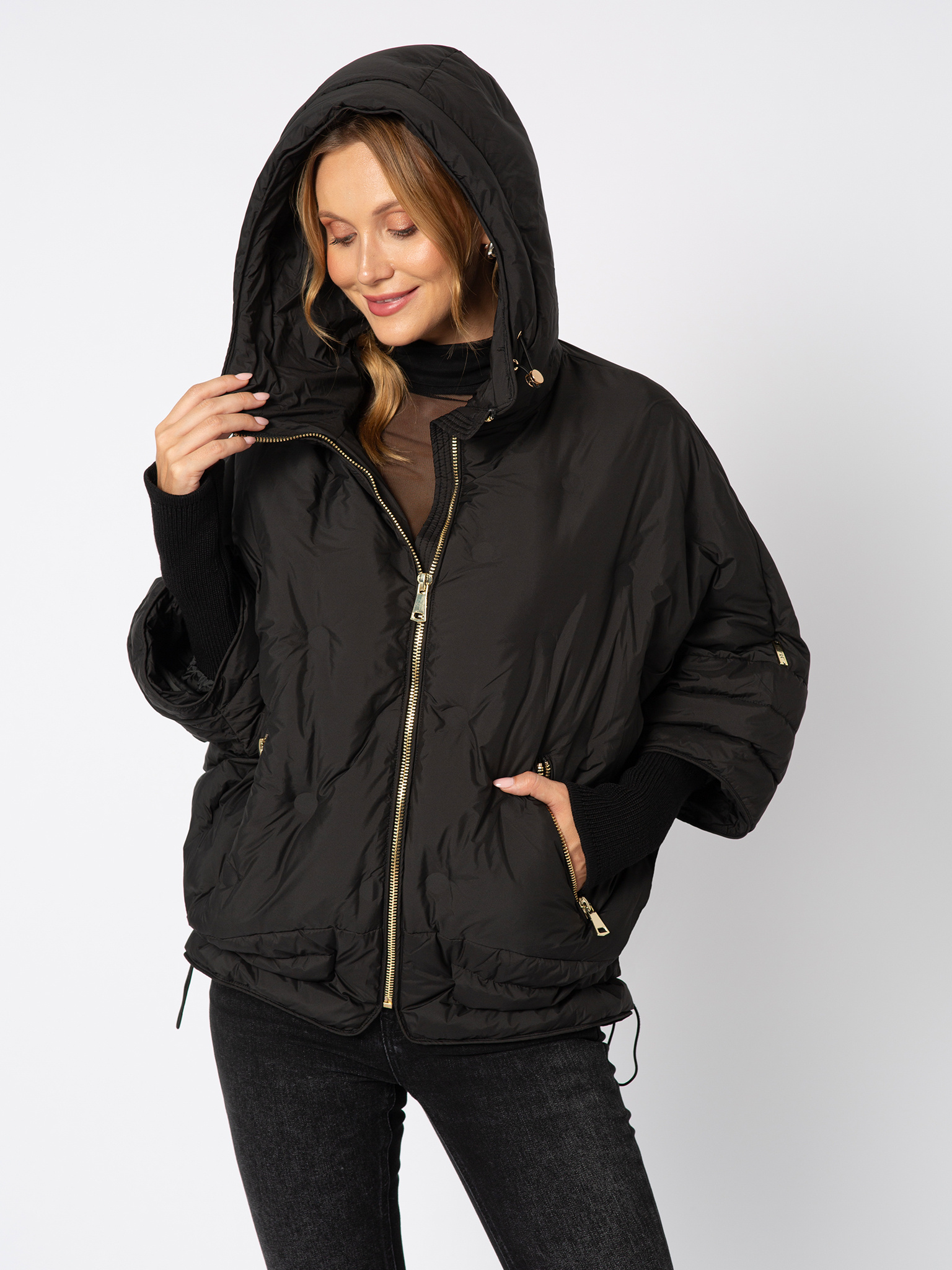 Otulająca i stylowa — czarna puchowa kurtka z kapturem to idealny balans między komfortem a nowoczesnym designem. Jej lekko oversize’owy krój nadaje sylwetce swobodny charakter, a złoty suwak i detale dodają luksusowego wykończenia. Rękawy zaprojektowane zostały w wyjątkowy sposób: od ramienia do łokcia puchowe, a od łokcia po nadgarstek elastyczne, dzianinowe, co zapewnia wygodę i pełną swobodę ruchów. Dzięki regulowanemu dołowi możesz dopasować kurtkę do sylwetki i skutecznie chronić się przed wiatrem. To model, który łączy w sobie funkcjonalność i miejski szyk — idealny na chłodne dni, gdy nie chcesz rezygnować ze stylu.