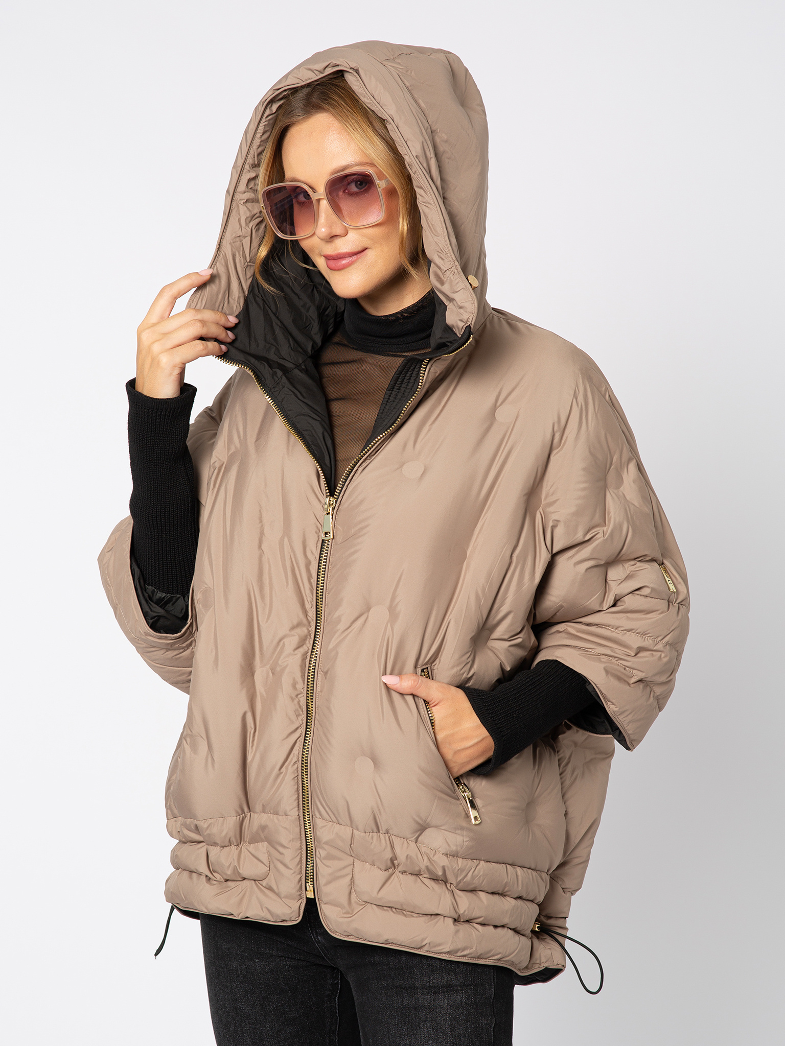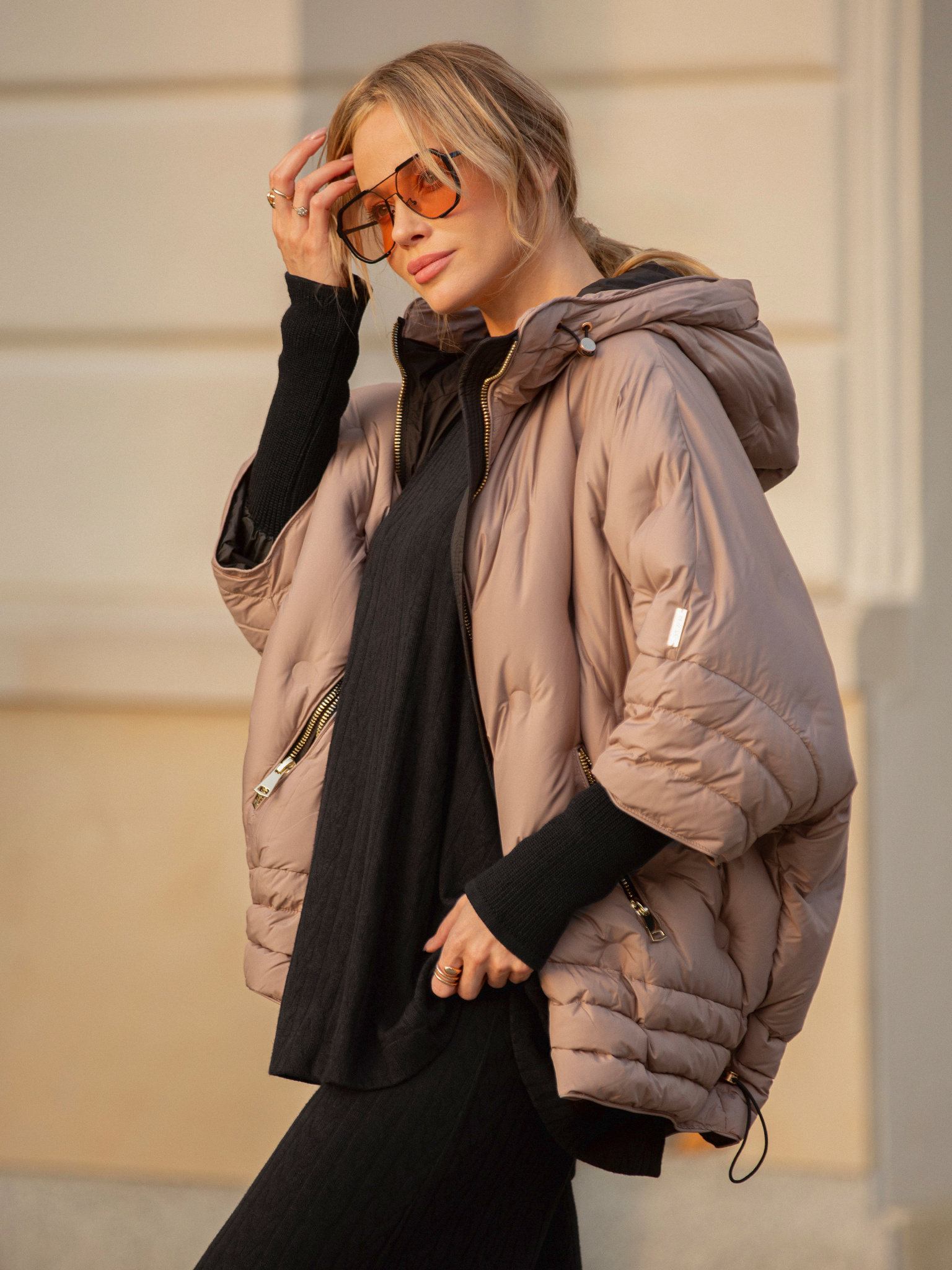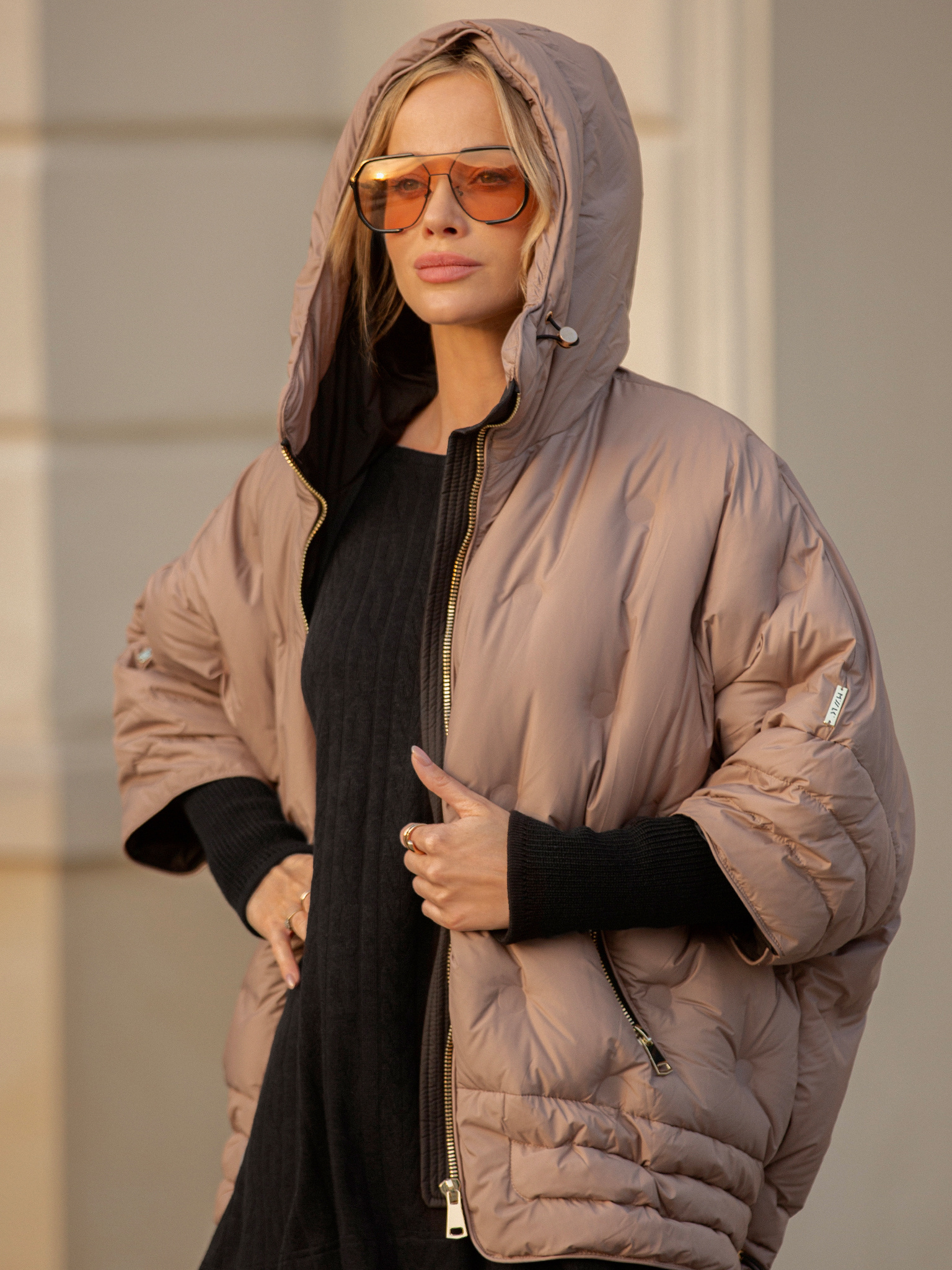 Otulająca i stylowa — beżowa puchowa kurtka z kapturem to idealny balans między komfortem a nowoczesnym designem. Jej lekko oversize’owy krój nadaje sylwetce swobodny charakter, a złoty suwak i detale dodają luksusowego wykończenia. Rękawy zaprojektowane zostały w wyjątkowy sposób: od ramienia do łokcia puchowe, a od łokcia po nadgarstek elastyczne, dzianinowe, co zapewnia wygodę i pełną swobodę ruchów. Dzięki regulowanemu dołowi możesz dopasować kurtkę do sylwetki i skutecznie chronić się przed wiatrem. To model, który łączy w sobie funkcjonalność i miejski szyk — idealny na chłodne dni, gdy nie chcesz rezygnować ze stylu.