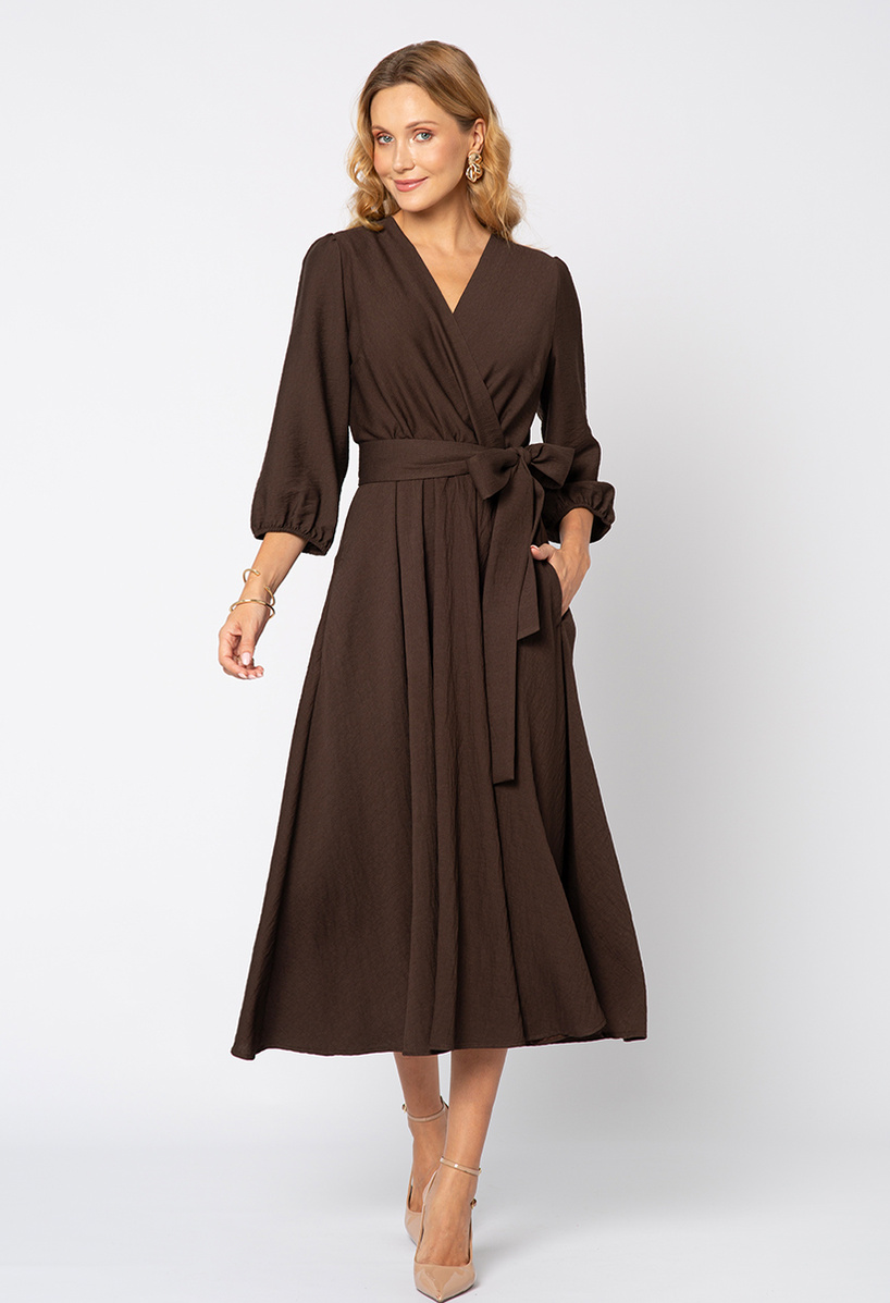 Kwintesencja stylu i ponadprzeciętnej elegancji. Jeśli lubisz ponadczasowe, uniwersalne fasony i kolory to ta sukienka jest właśnie dla Ciebie. Klasyczny krój, kopertowy dekolt, rozkloszowana spódnica, pięknie zachowująca się w ruchu. Wyjątkowym atutem tej sukienki są umieszone po bokach kieszenie, które każda z nas uwielbia. W talii przewiązywana jest paskiem z tego samego materiału, dzięki czemu idealnie podkreślona zostaje kobieca sylwetka. Pasek można uformować w kokardę, bądź tylko przewiązać. Wykonana z bardzo przyjemnego dla ciała materiału, 85% wiskoza, 15% nylon, wręcz wydaje się płynąć w ruch, dodatkowo pięknie odbija światło. Amelie to sukienka baza, która uzupełniona o odpowiednie dodatki zapewni Ci kreację zarówno na wieczór, ale do pracy, czy na spotkanie z przyjaciółmi.