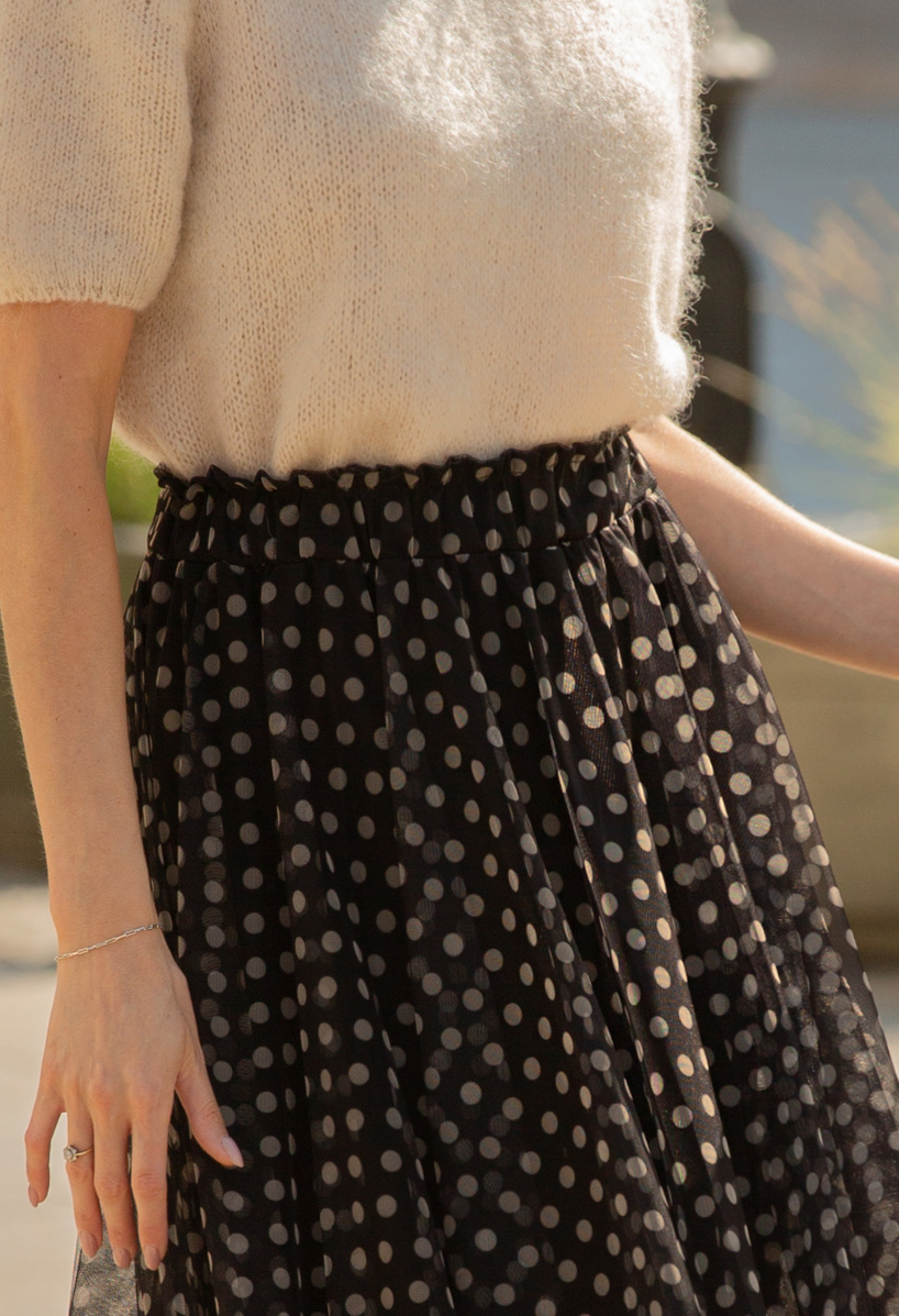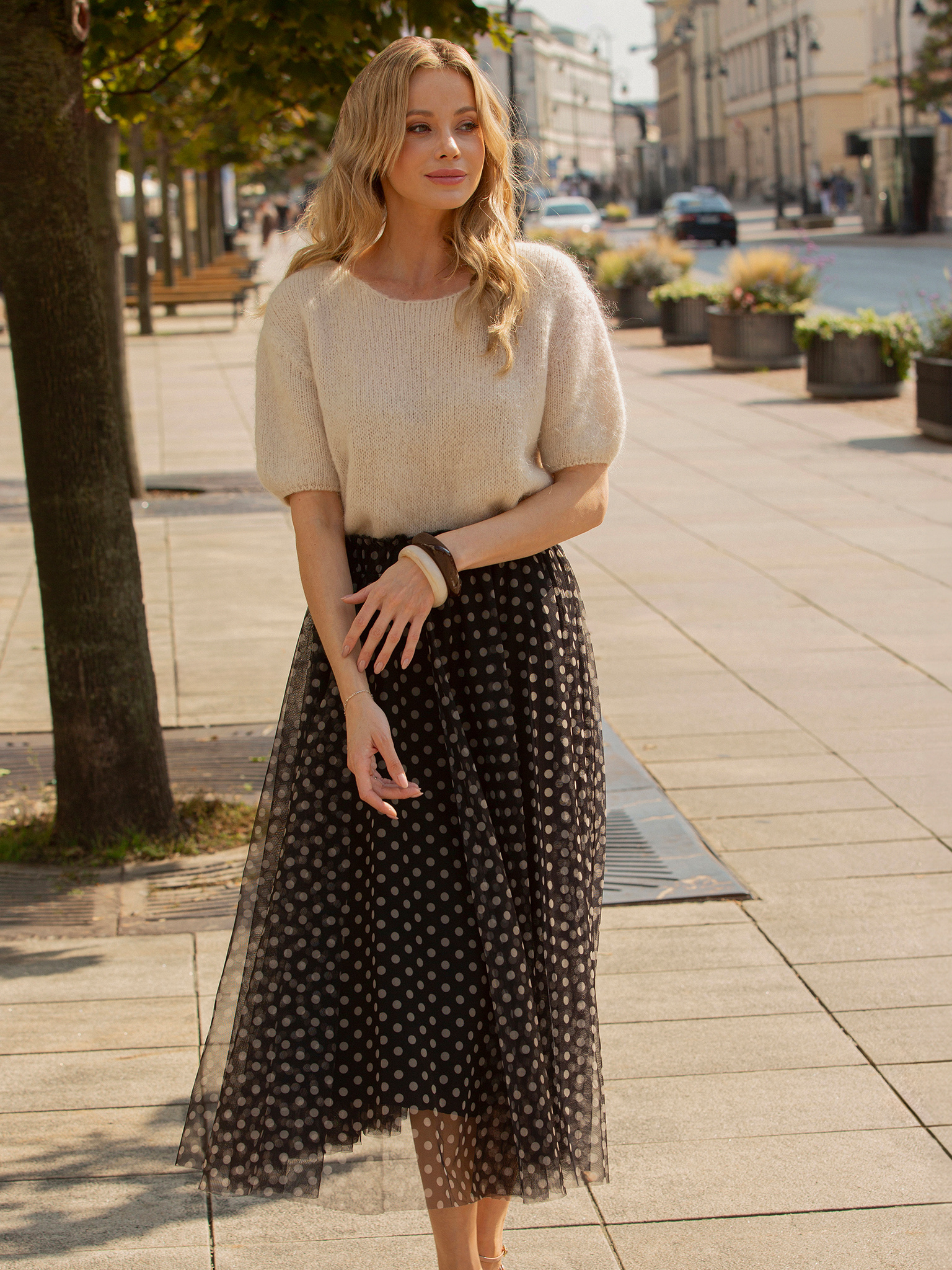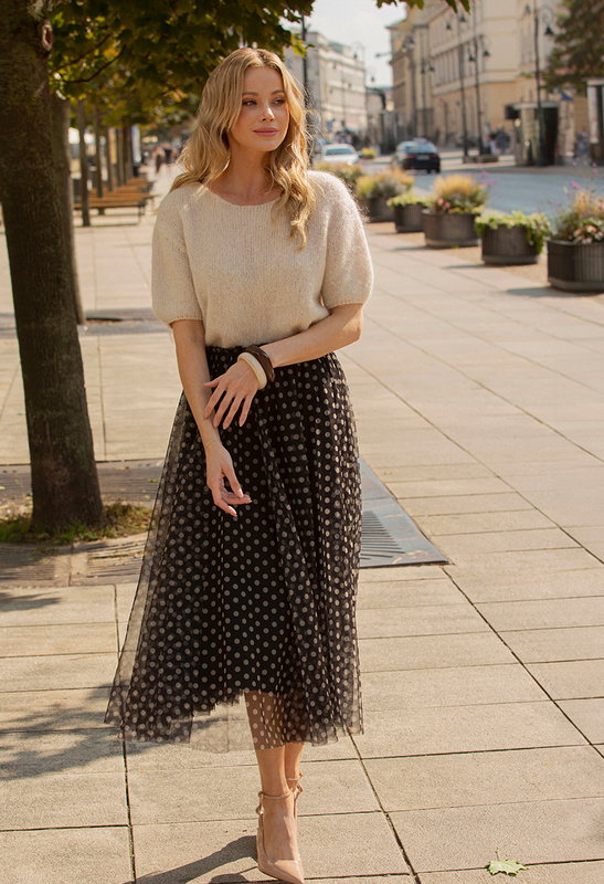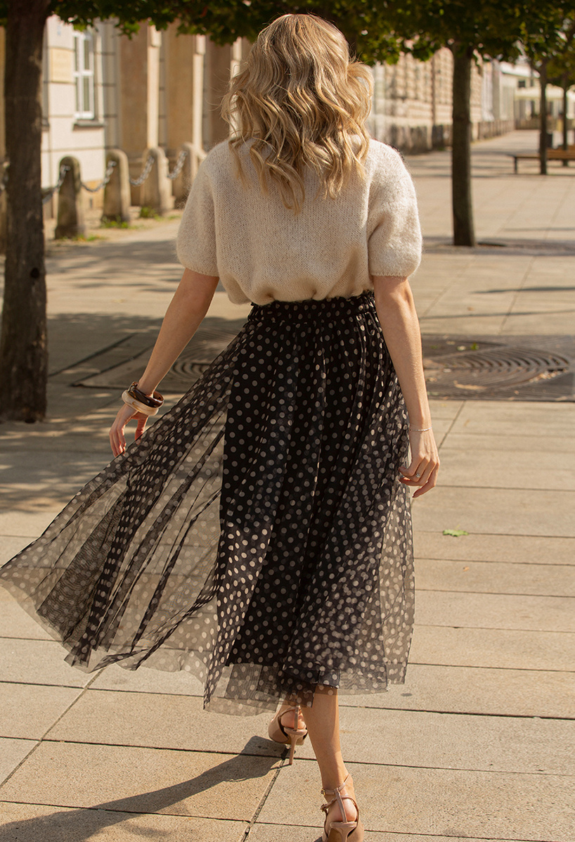 - Lekkość i dziewczęcy urok w miejskim wydaniu – tiulowa spódnica w groszki sprawia, że każdy krok nabiera romantycznego charakteru. Rozkloszowany krój i długość midi pięknie układają się na sylwetce, a gumka w talii zapewnia wygodę i idealne dopasowanie.