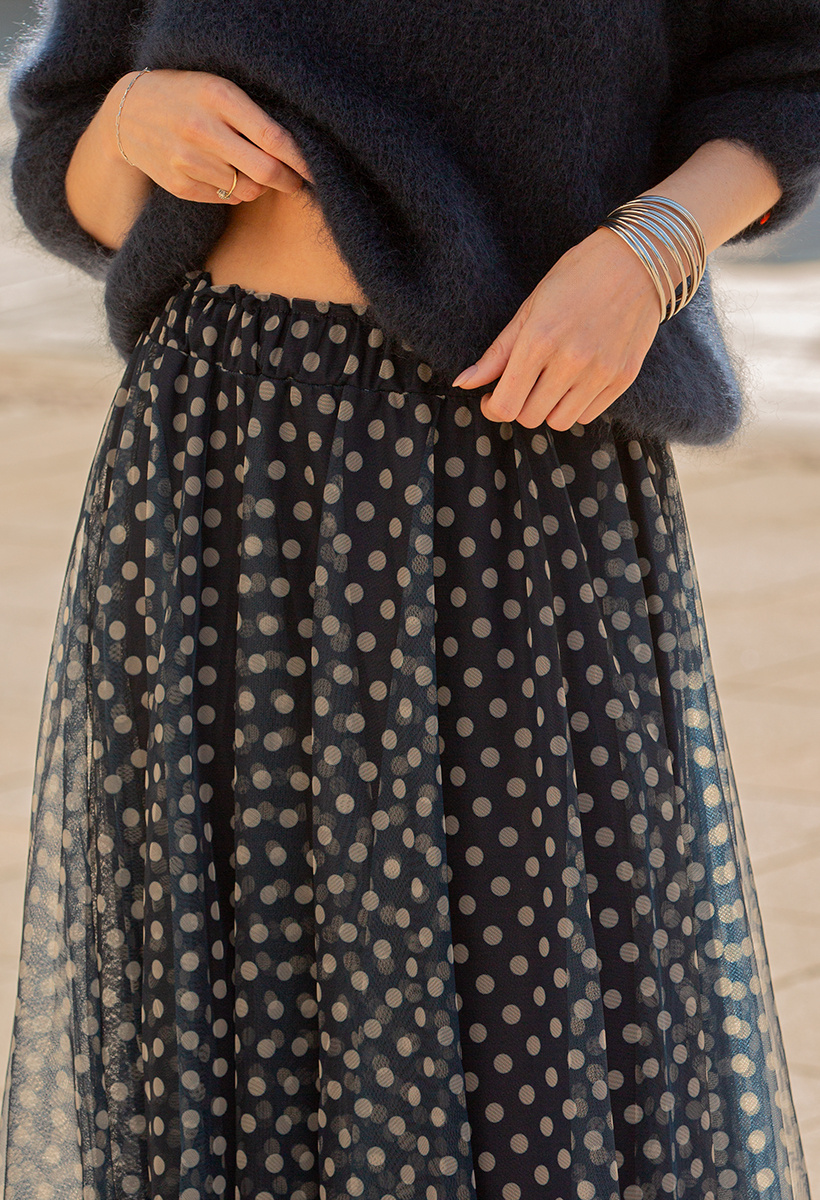 - Lekkość i dziewczęcy urok w miejskim wydaniu – tiulowa spódnica w groszki sprawia, że każdy krok nabiera romantycznego charakteru. Rozkloszowany krój i długość midi pięknie układają się na sylwetce, a gumka w talii zapewnia wygodę i idealne dopasowanie.