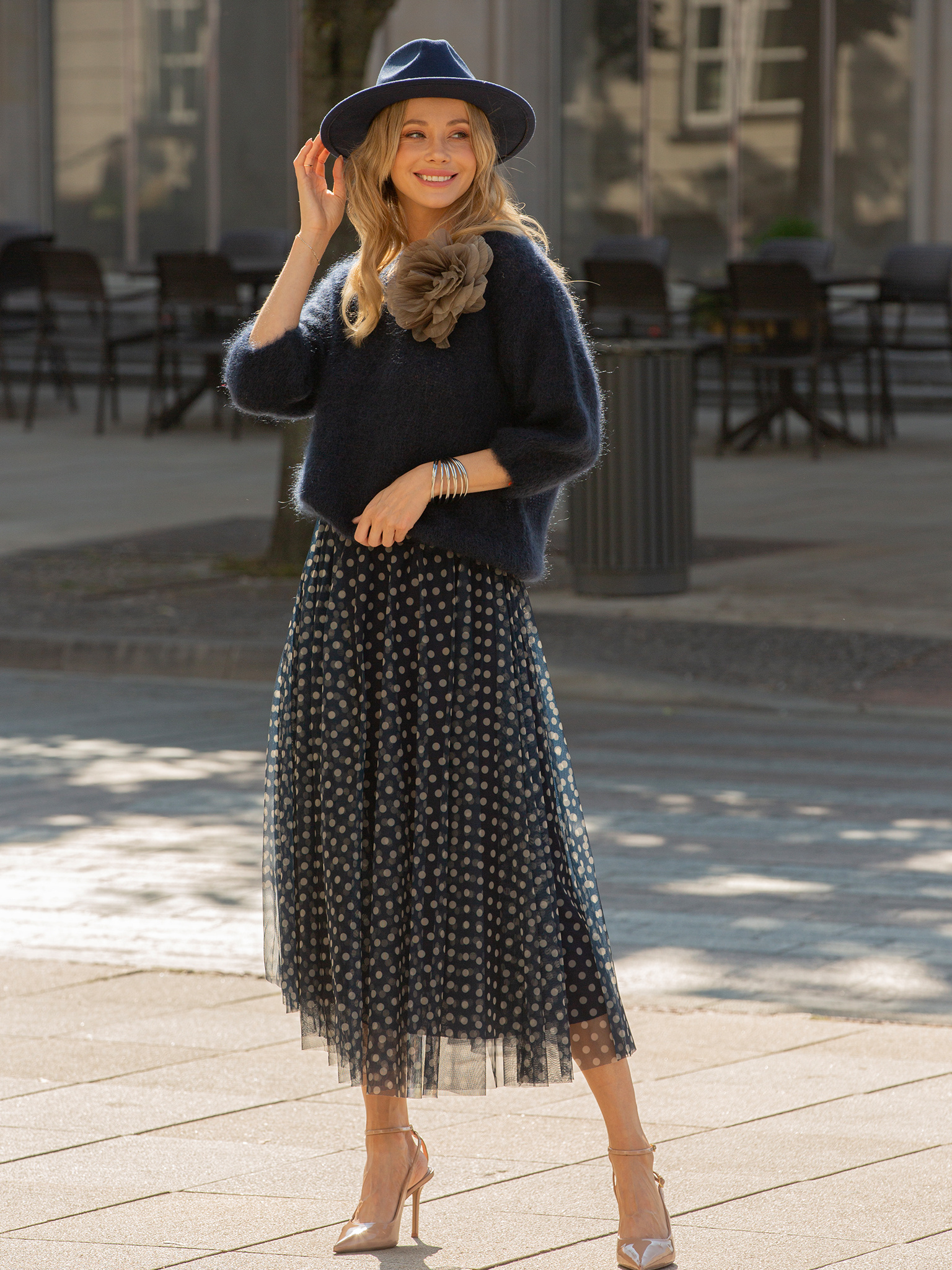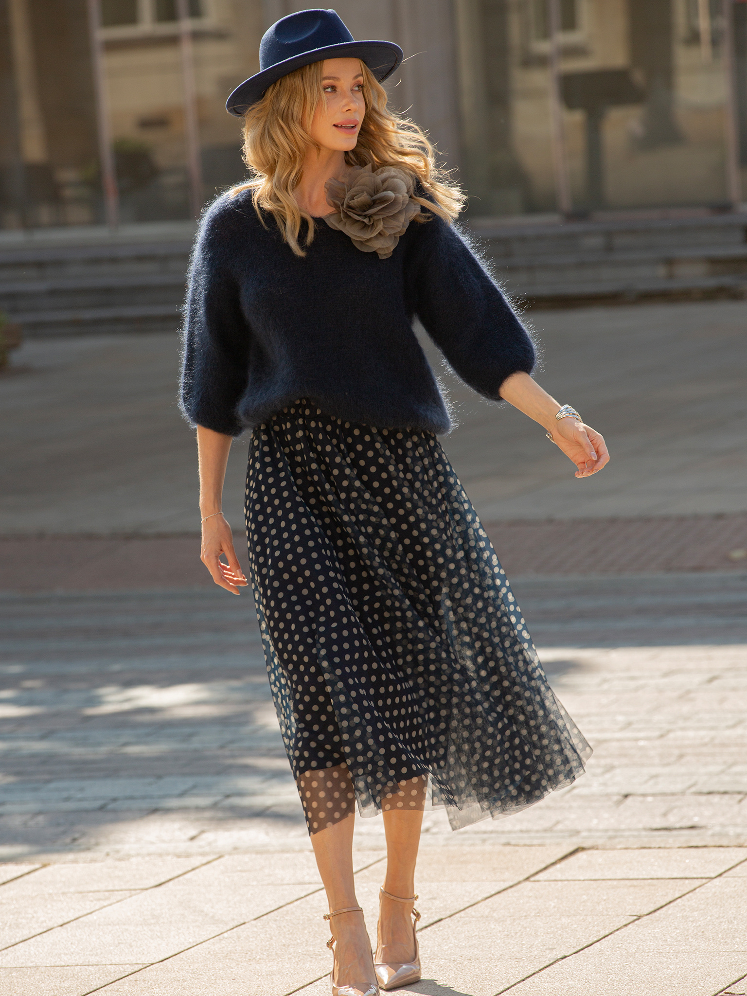 Lekkość i dziewczęcy urok w miejskim wydaniu – tiulowa spódnica w groszki sprawia, że każdy krok nabiera romantycznego charakteru. Rozkloszowany krój i długość midi pięknie układają się na sylwetce, a gumka w talii zapewnia wygodę i idealne dopasowanie. Subtelne beżowe groszki na granatowym tle dodają całości ponadczasowej elegancji z nutą retro. Dzięki rozmiarowi one size spódnica doskonale leży na sylwetkach od S do L, podkreślając talię i nadając stylizacjom lekkości. To model, który z łatwością połączysz z miękkim, moherowym swetrem, koszulą czy prostym topem – zawsze tworząc perfekcyjny look.