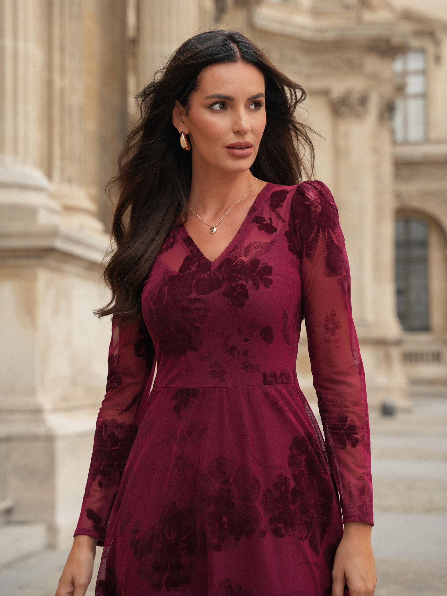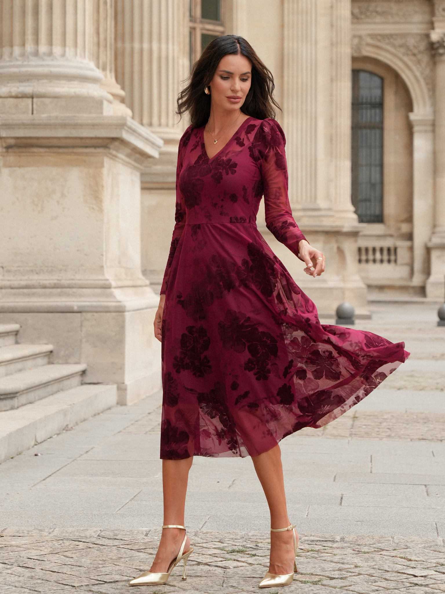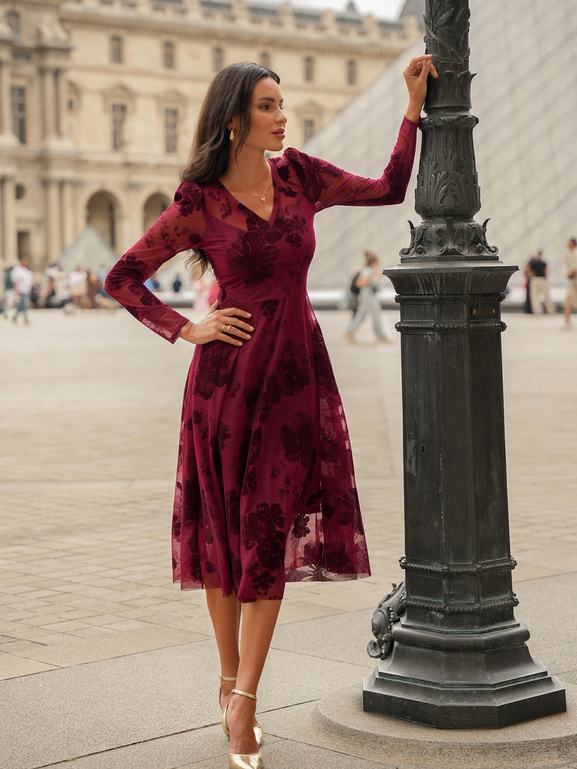 Wieczorna aria w najczystszym wydaniu – Traviata w tonacji czerwonego wina hipnotyzuje głębią barwy i szlachetnym charakterem. Dopasowana góra z dekoltem w serek i cienkim welurowym wykończeniem otula sylwetkę niczym operowa melodia, a delikatne bufki i długie rękawy dodają romantycznego tonu. Rozkloszowany dół midi miękko porusza się w rytm kroków. Flokowany, kwiatowy wzór w odcieniu bordo tworzy subtelną grę faktur, dodając całości zmysłowości i niepowtarzalnego szyku.
