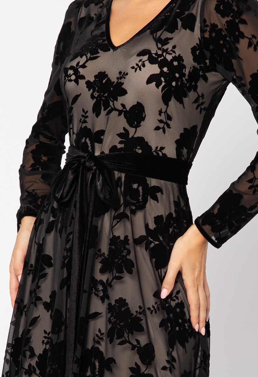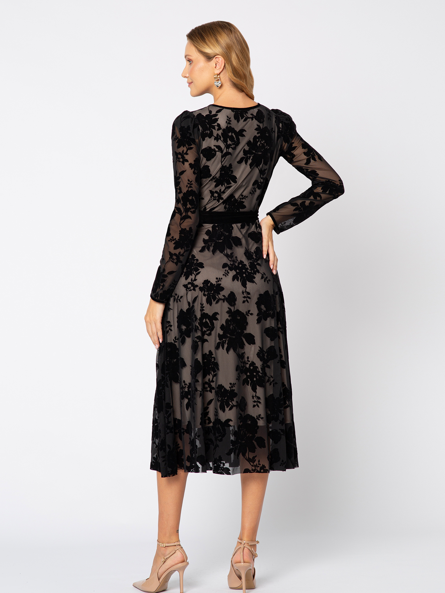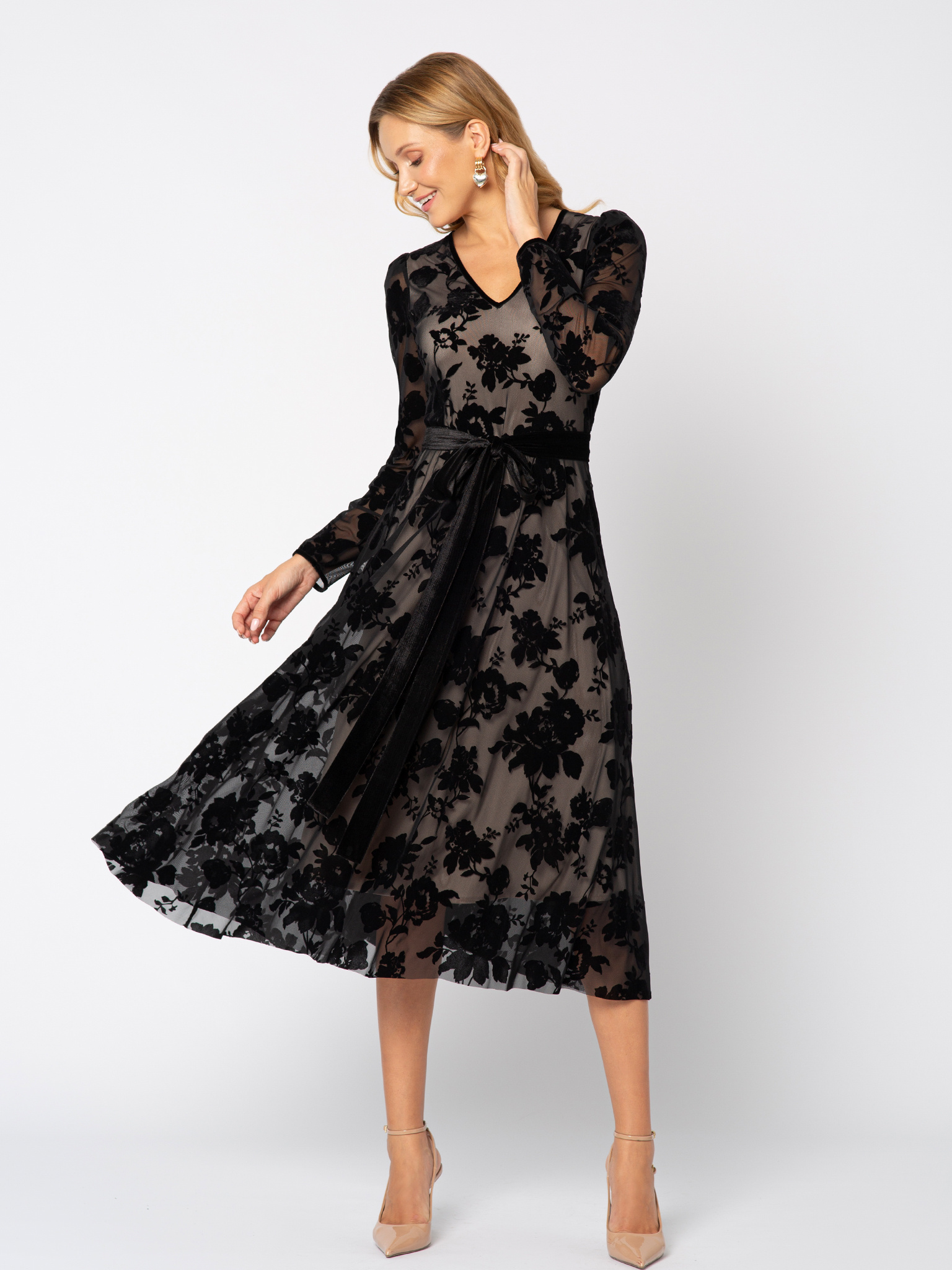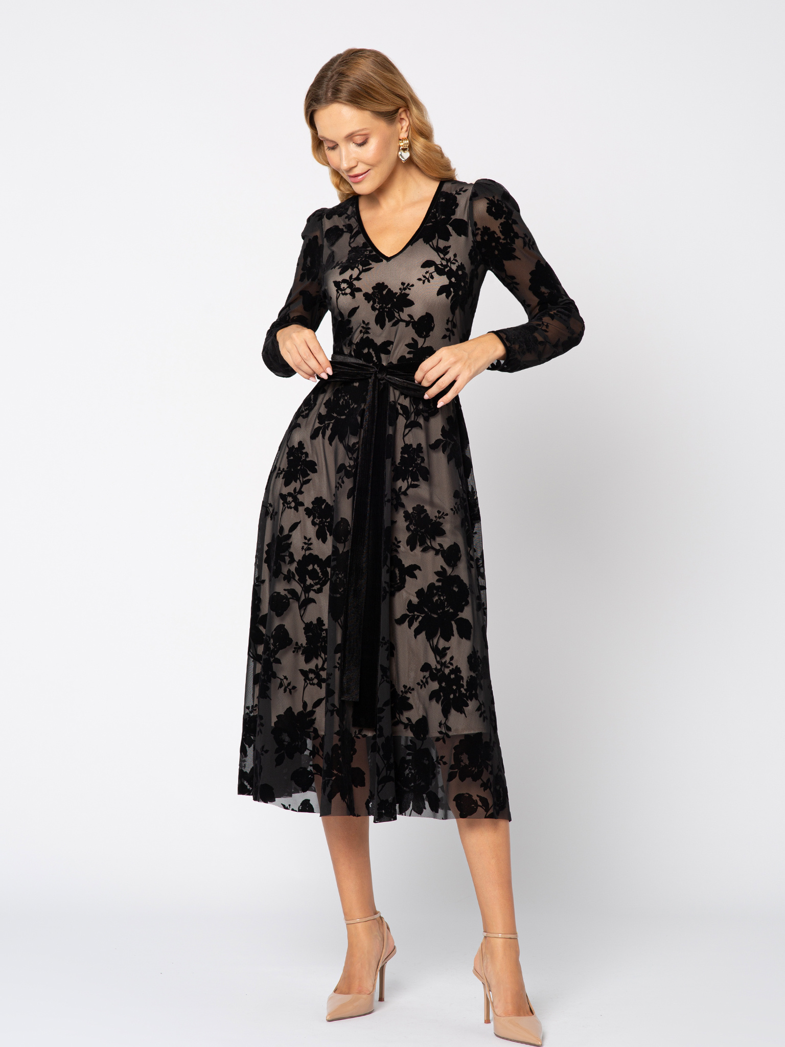 Wyrafinowana i pełna subtelności – Traviata w czerni to kwintesencja paryskiej elegancji. Flokowany wzór w odcieniu głębokiej czerni delikatnie odcina się na tle beżowej podszewki, która jedynie subtelnie przebija spod tkaniny, nadając całości lekkości i głębi. Dekolt w serek z welurowym wykończeniem, romantyczne bufki na ramionach oraz długie, dopasowane rękawy podkreślają finezję projektu. Talia zaakcentowana welurowym paskiem i rozkloszowany dół midi sprawiają, że każdy ruch staje się eleganckim gestem – jak spokojny krok po marmurowych schodach Opery Garnier.