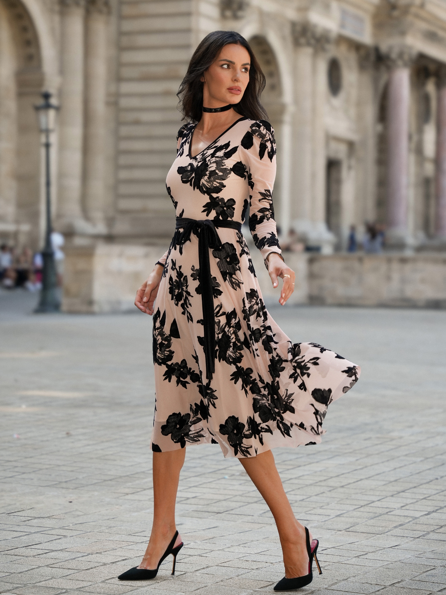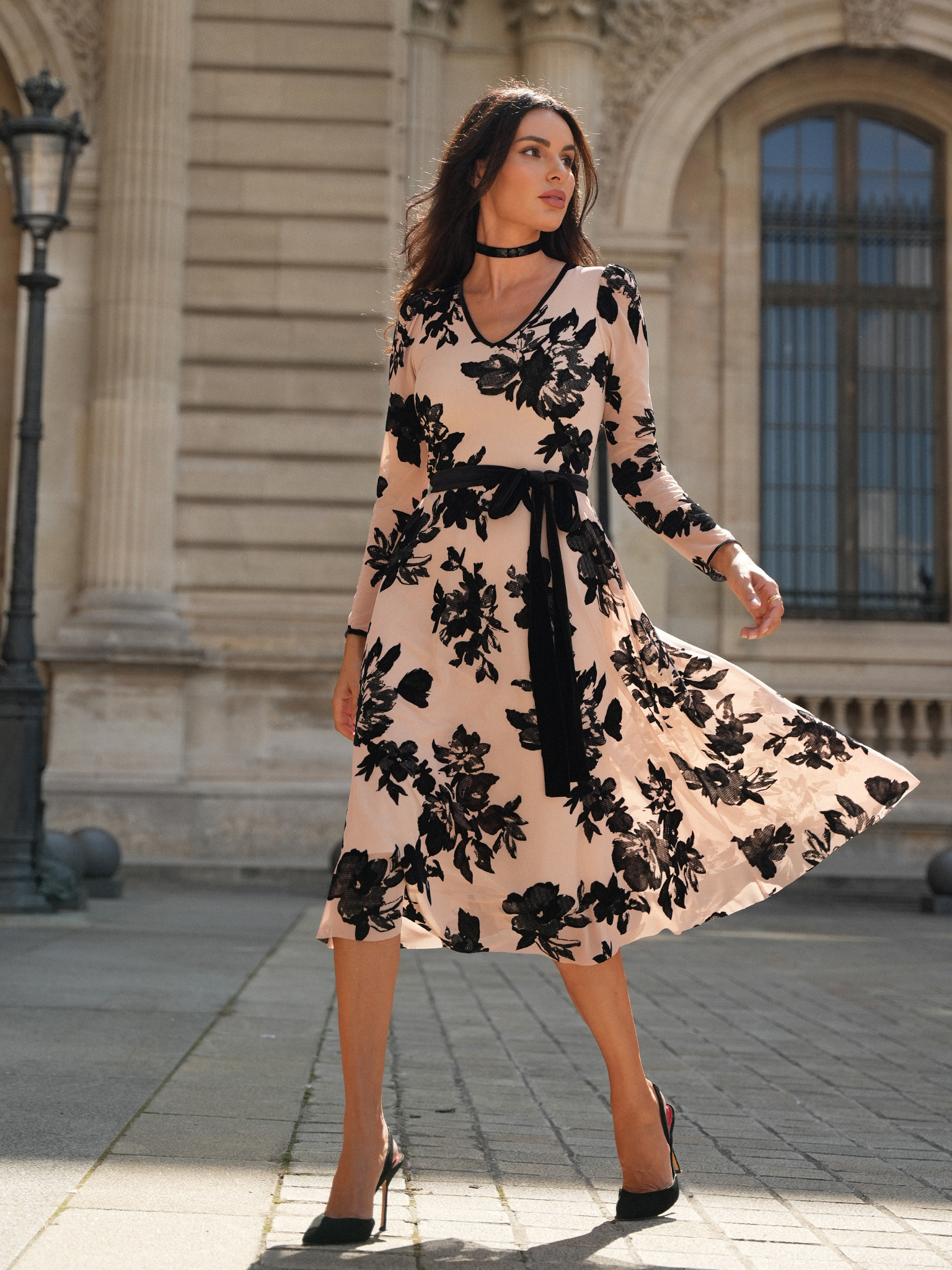 Traviata to oda do kobiecości – subtelna, a jednocześnie pełna charakteru. Jej dopasowana góra z dekoltem w serek, wykończonym cienkim welurowym paskiem, przyciąga spojrzenia elegancją w najczystszej formie. Delikatne bufki na ramionach i długie, dopasowane rękawy dodają romantycznego uroku, podczas gdy welurowy pasek w talii pięknie podkreśla sylwetkę. Rozkloszowany dół o długości midi nadaje całości lekkości i miękkości ruchu – jak taniec na scenie Opery Garnier. Flockowany wzór w kwiaty w odcieniu głębokiej czerni kontrastuje z pudrowo-beżową tkaniną, tworząc efekt pełen wyrafinowania. To kreacja, w której poczujesz się wyjątkowo – jak bohaterka własnego spektaklu.