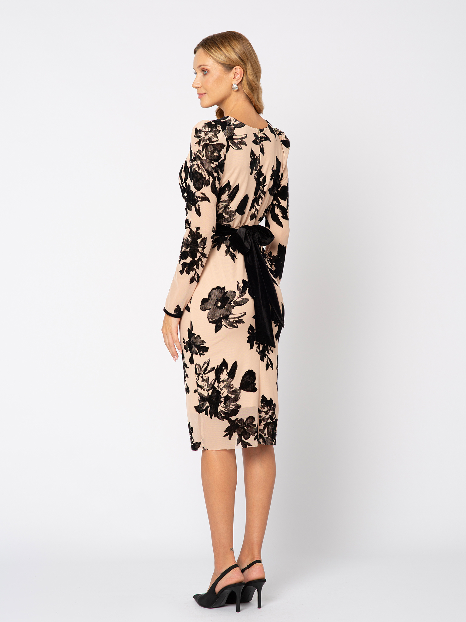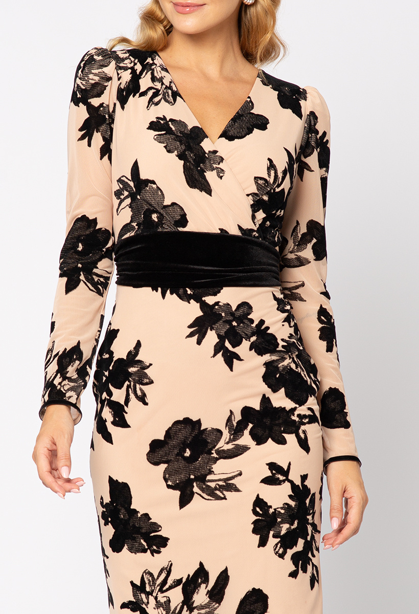 Beżowa sukienka z czarnym flokowanym wzorem Tosca