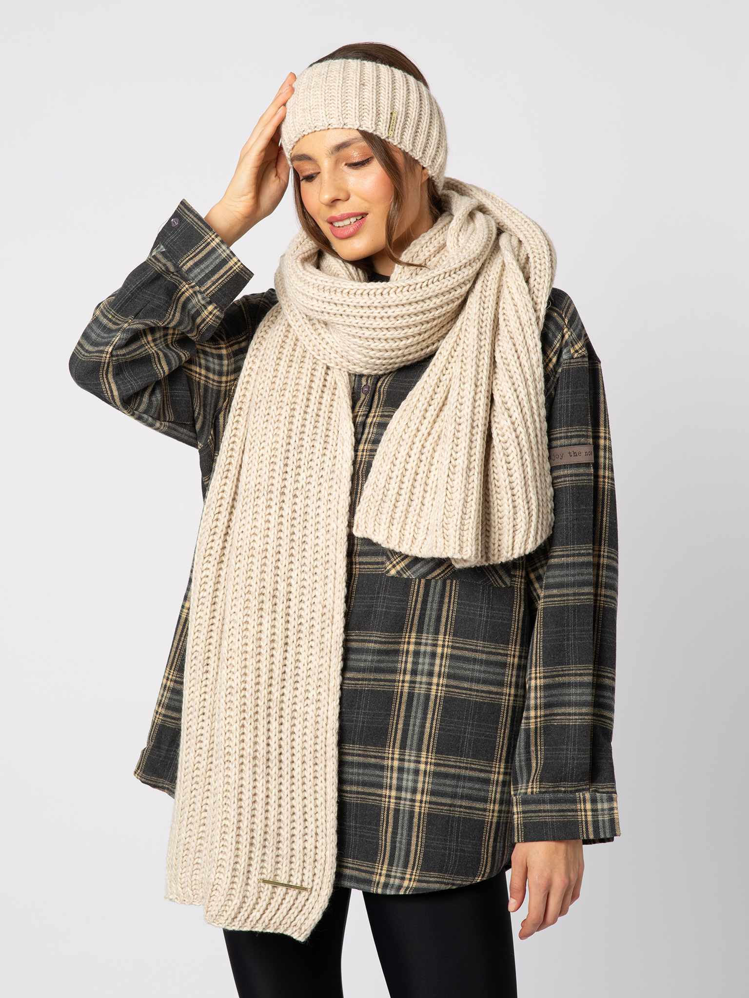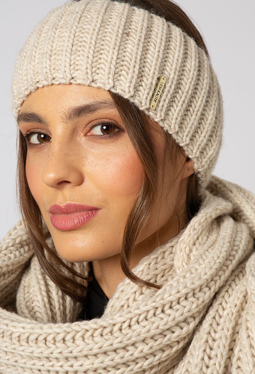 Ciepło, miękkość i ponadczasowa elegancja. Ten wyjątkowy komplet – szeroki, długi szal i stylowa opaska – to must-have w zimowej garderobie. Wykonany z przyjemnej w dotyku dzianiny w odcieniu beżu, doskonale rozświetla twarz i nadaje stylizacji subtelnego, kobiecego charakteru.