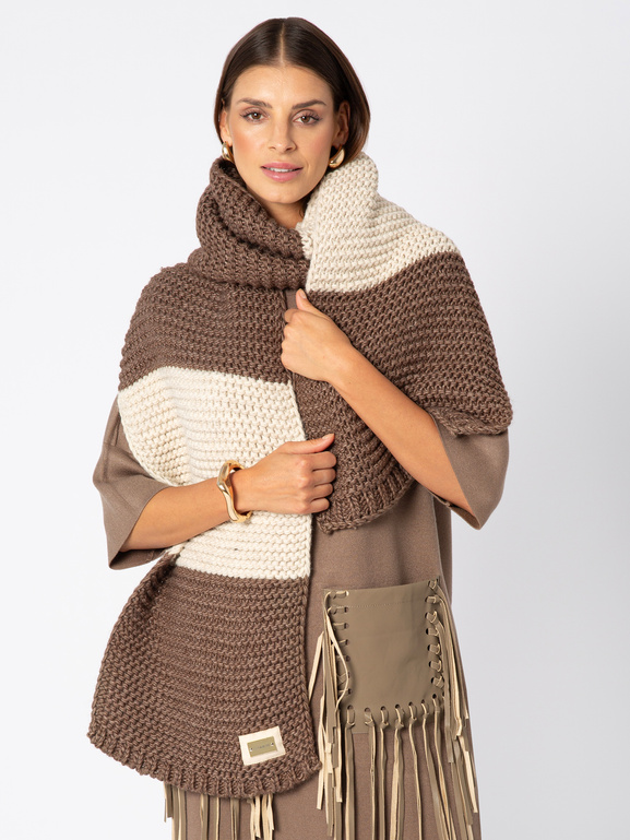 Ciepło, miękkość i naturalna elegancja. Ten szeroki, długi szal w beżowo-brązowe pasy to idealny dodatek na chłodne dni, który otuli Cię niczym miękki koc, a jednocześnie doda stylizacji wyrafinowanego charakteru.