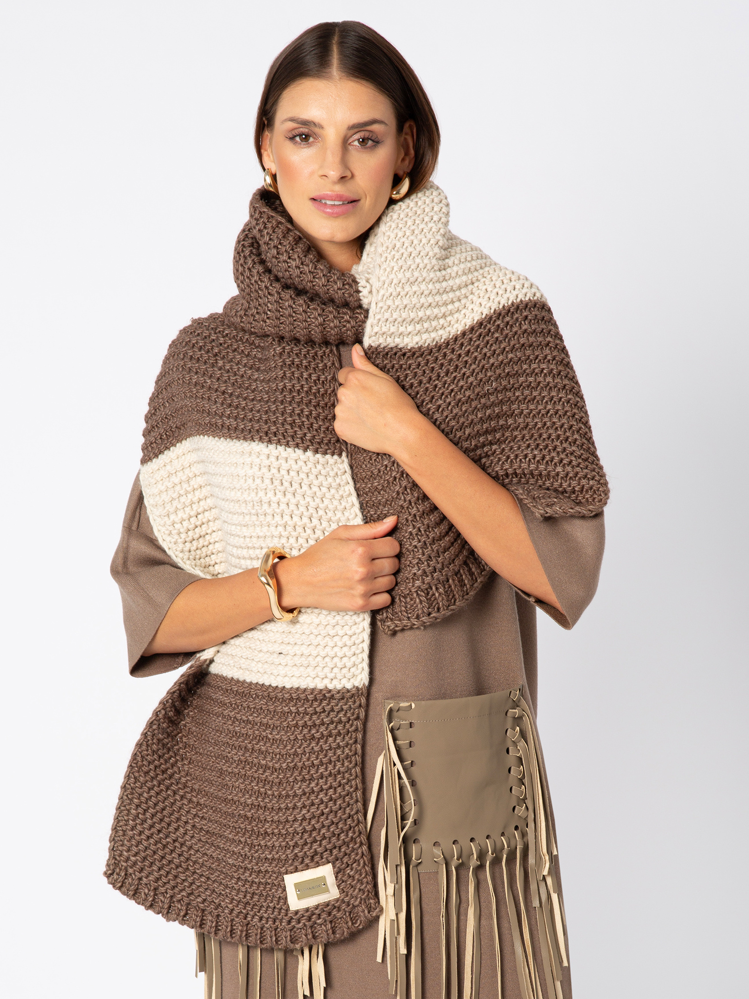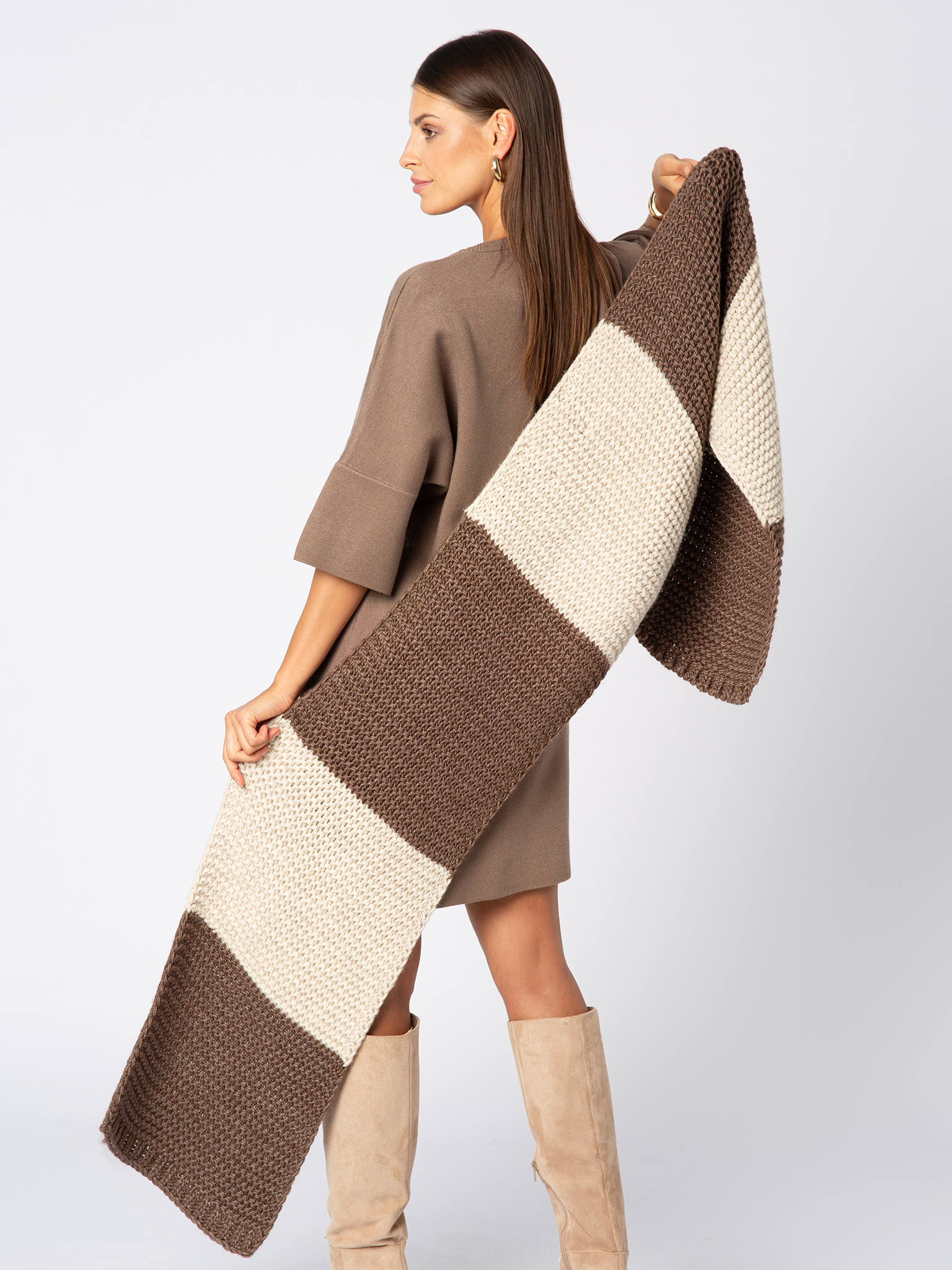 Wykonany z przyjemnej w dotyku dzianiny, pięknie się układa i pasuje do płaszczy w odcieniach karmelu, ecru czy czerni. Dzięki swojej długości i szerokości możesz nosić go na wiele sposobów – owinięty wokół szyi lub przerzucony przez ramiona.