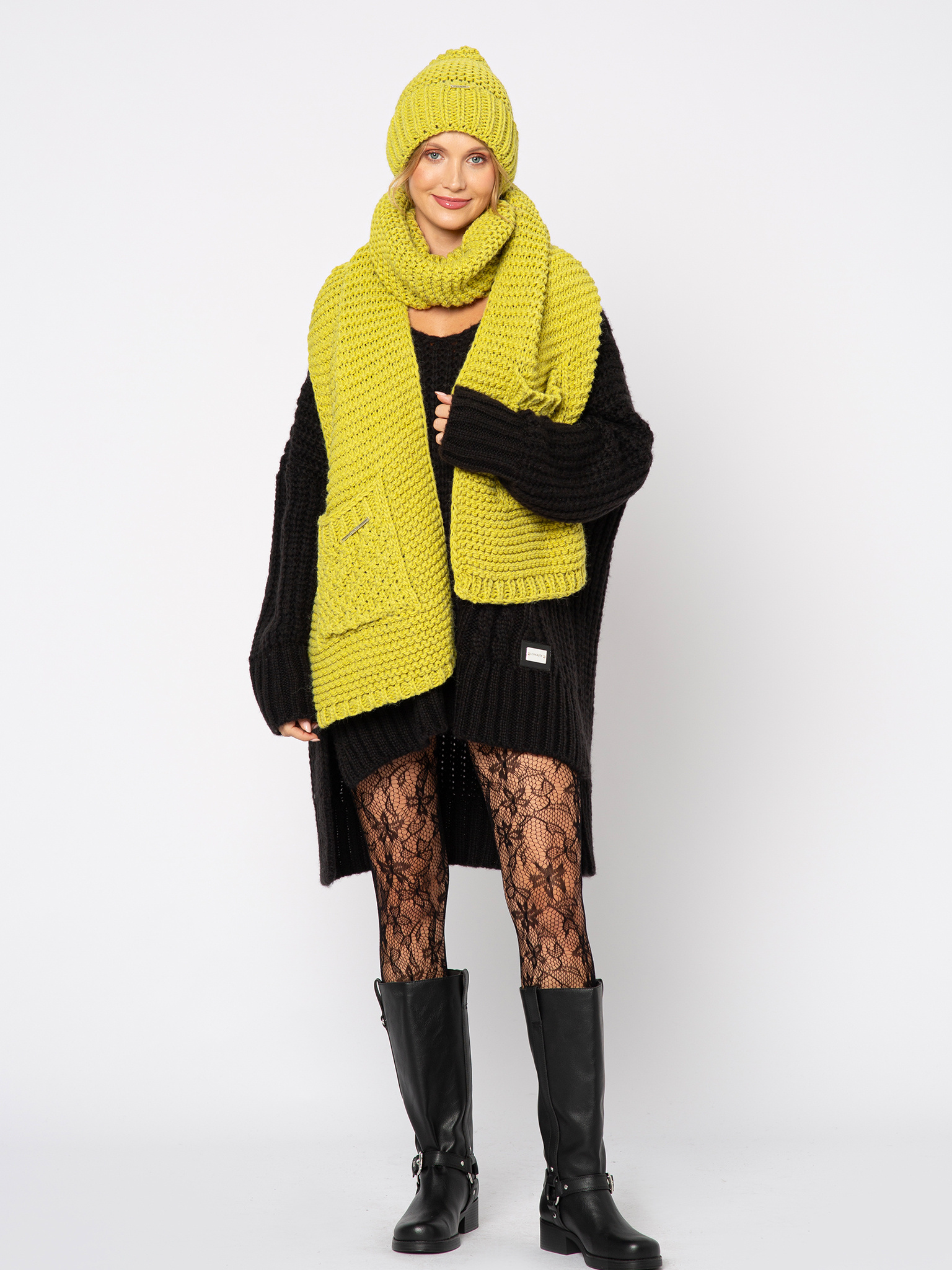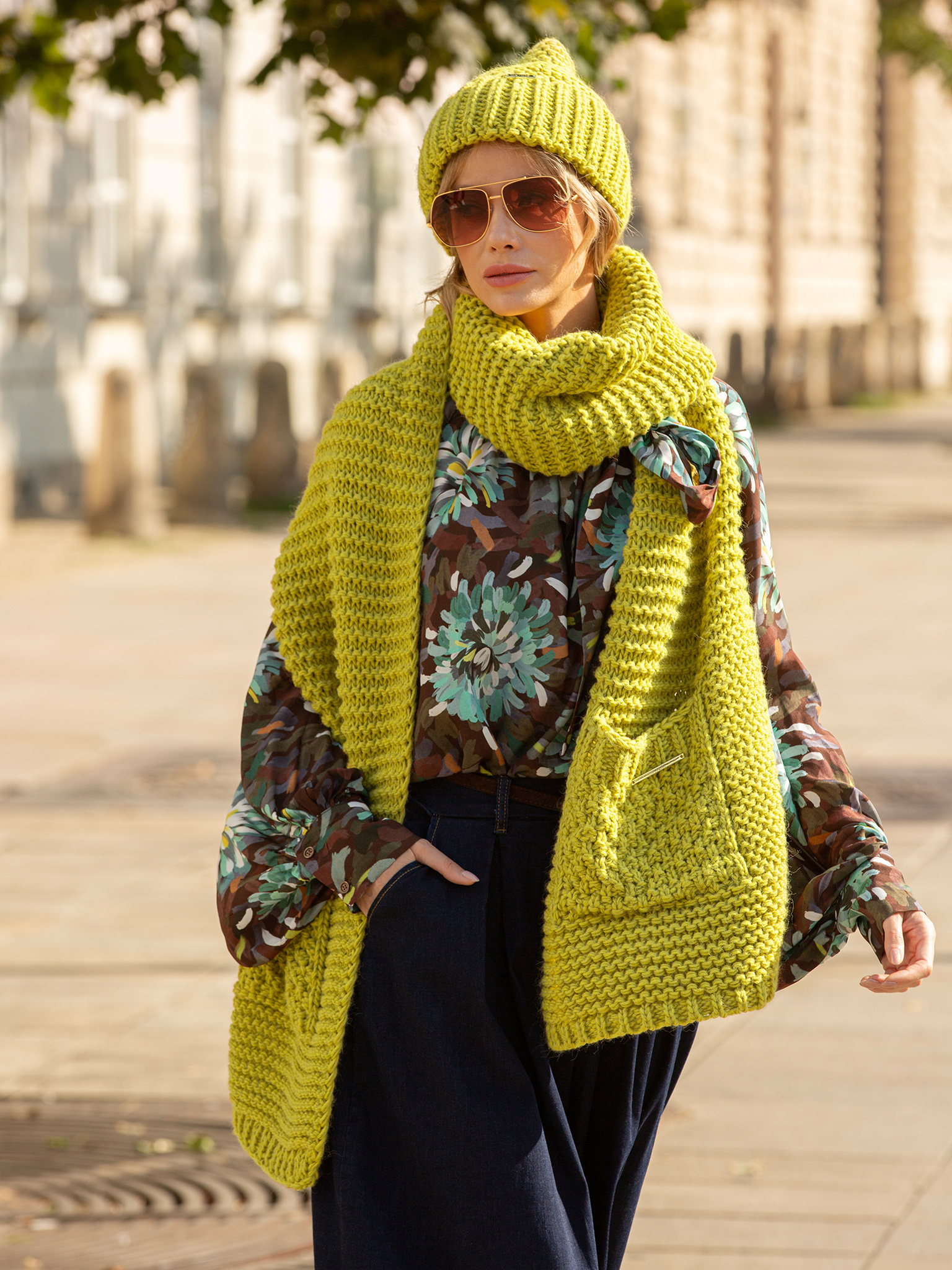 • Styl, ciepło i odrobina luksusu na co dzień. Ten wyjątkowy komplet to idealne połączenie funkcjonalności i elegancji. Szal w oliwkowym odcieniu zachwyca nie tylko miękkością i ciepłem, ale też oryginalnymi kieszeniami umieszczonymi na jego końcach.
