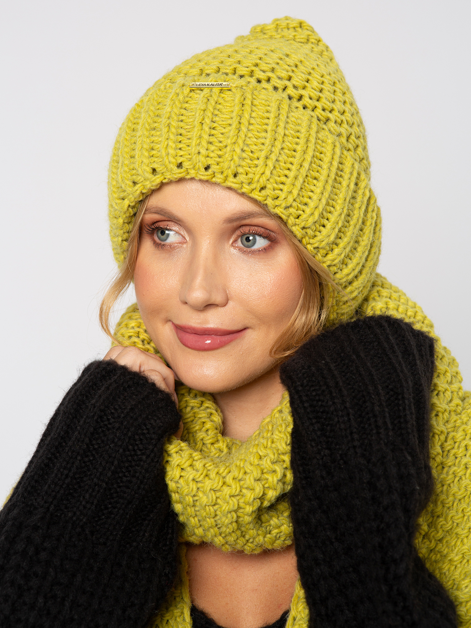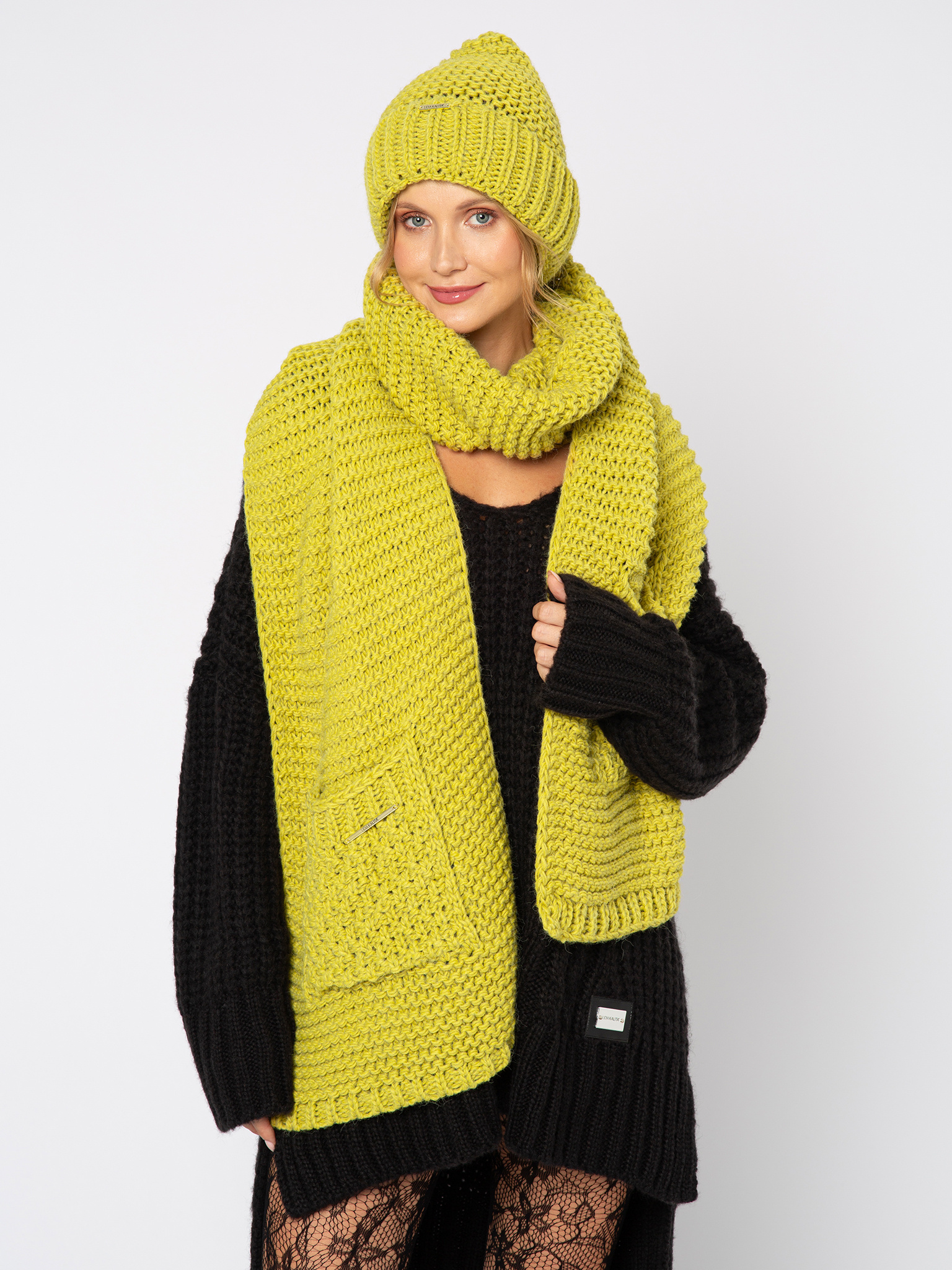 Szal w pięknym oliwkowym odcieniu zachwyca nie tylko miękkością i ciepłem, ale też oryginalnymi kieszeniami umieszczonymi na jego końcach. Możesz schować w nich dłonie w chłodny dzień lub po prostu cieszyć się ich wyjątkowym, designerskim charakterem. Ciepła czapka z wywiniętym mankietem dopełnia całość, tworząc zestaw, który doda szyku każdej zimowej stylizacji.
