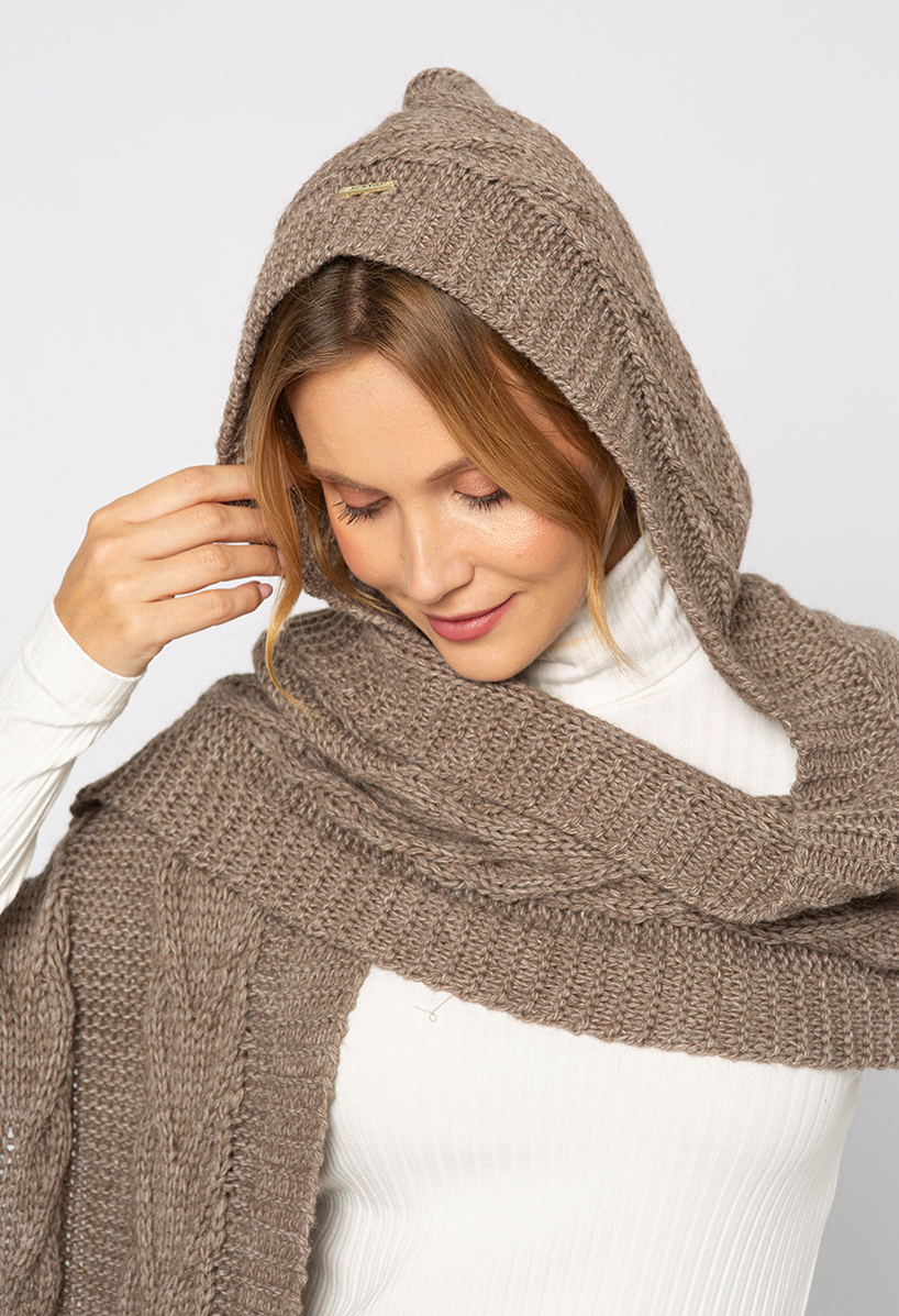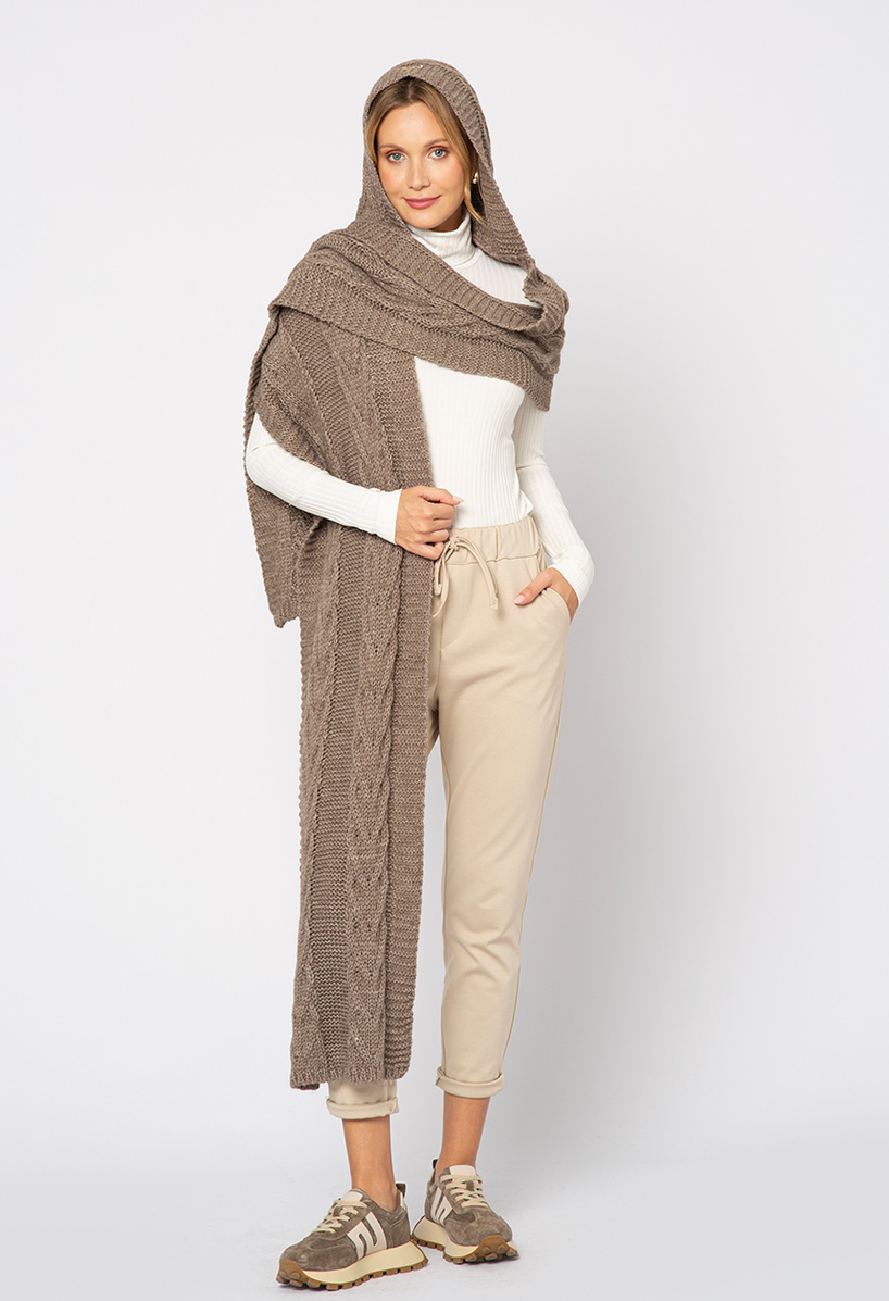 • Otul się ciepłem i stylem – długi szal z kapturem to must have każdej jesieniary. Miękki, dekoracyjny splot o strukturze warkocza dodaje mu charakteru, a kaptur sprawia, że jest nie tylko efektowny, ale też niezwykle praktyczny.