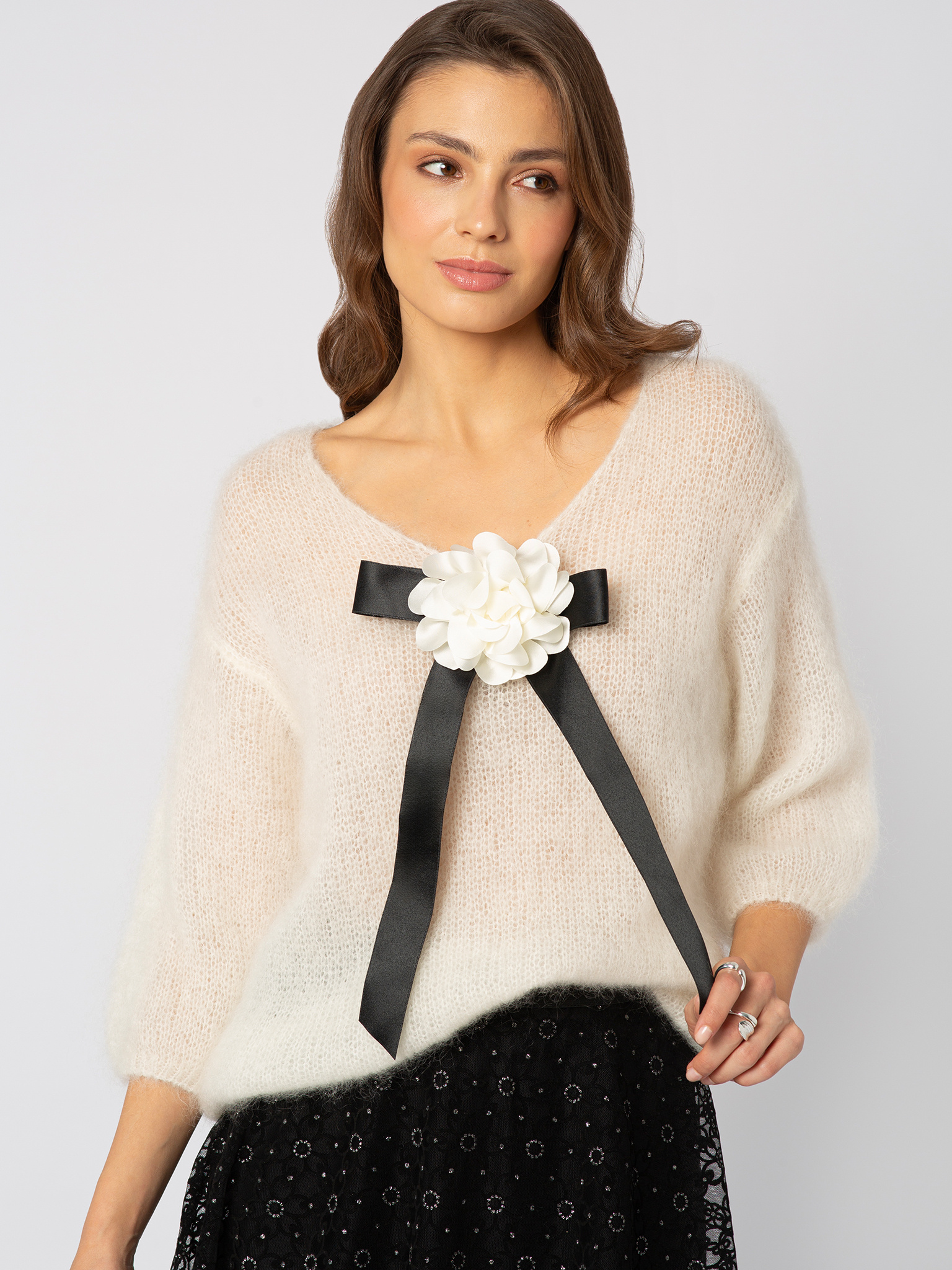 Czarna broszka kokardka z ecru kwiatkiem