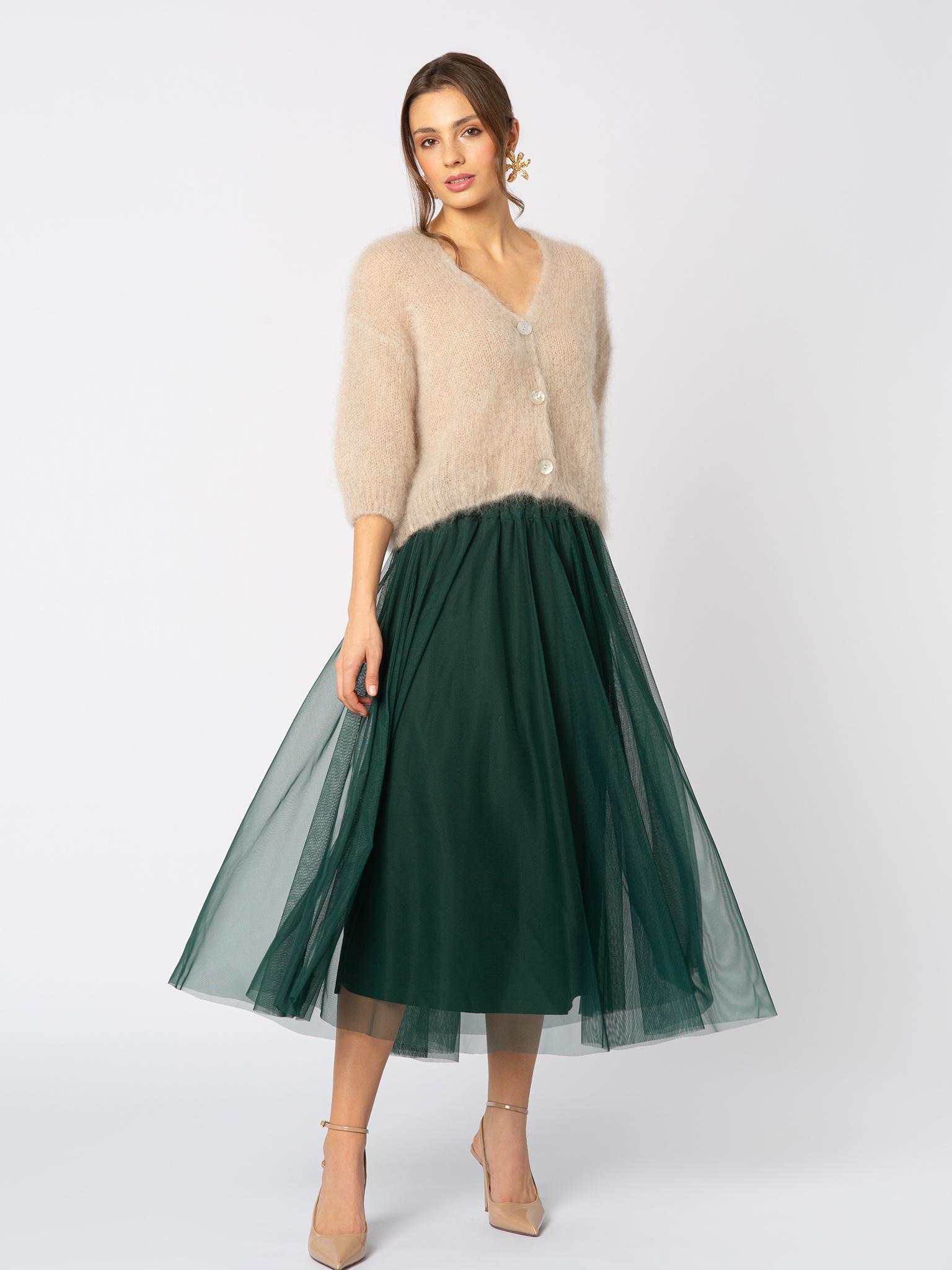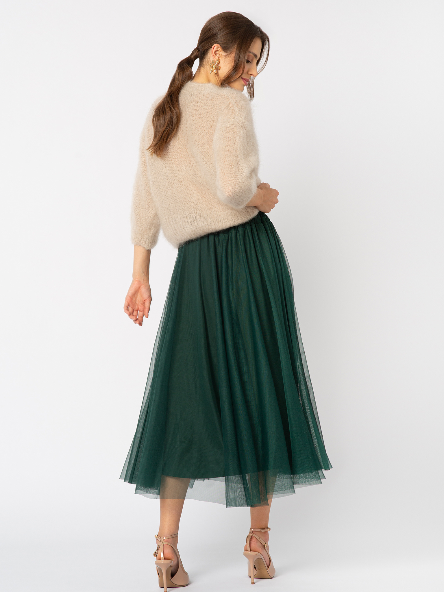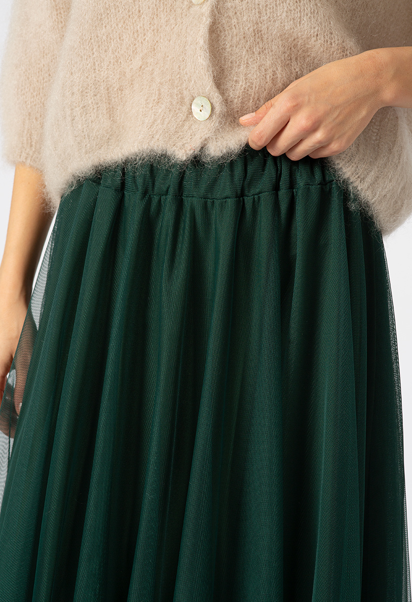 Lekka jak powietrze i pełna ruchu. Ta tiulowa spódnica ma rozkloszowany krój, który pięknie podkreśla sylwetkę i nadaje jej miękkości przy każdym kroku. Elastyczna gumka w talii sprawia, że spódnica dopasowuje się do figury i jest komfortowa przez cały dzień. Podszewka została idealnie dobrana kolorystycznie, dzięki czemu całość wygląda spójnie, elegancko i bardzo kobieco. Długość za kolano dodaje klasy i lekko romantycznego charakteru.