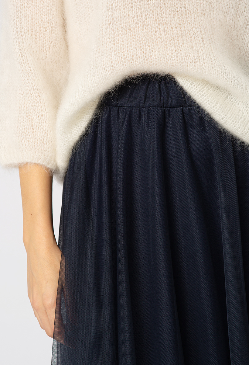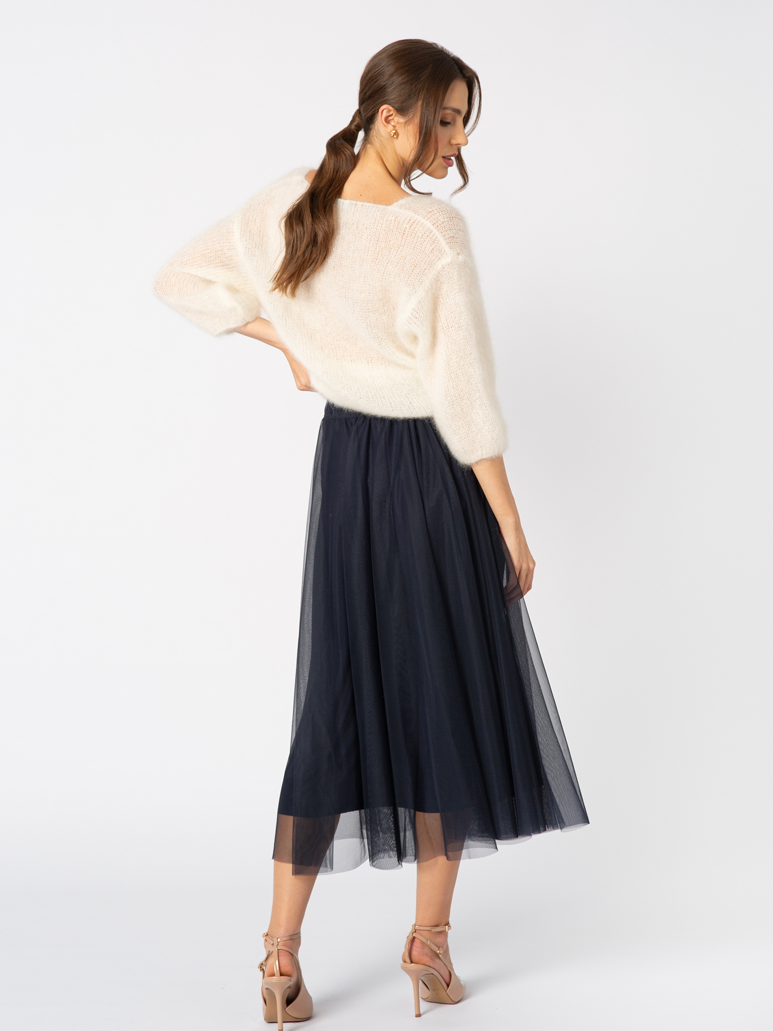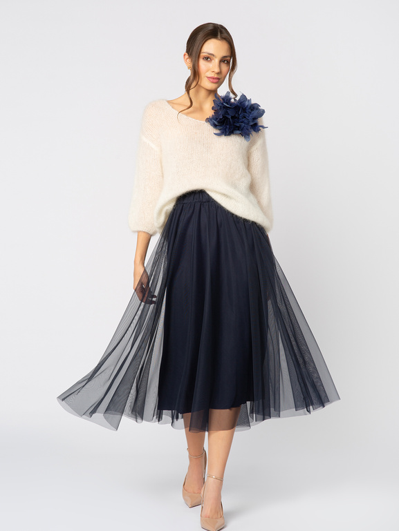 Lekka jak powietrze i pełna ruchu. Ta tiulowa spódnica ma rozkloszowany krój, który pięknie podkreśla sylwetkę i nadaje jej miękkości przy każdym kroku. Elastyczna gumka w talii sprawia, że spódnica dopasowuje się do figury i jest komfortowa przez cały dzień. Podszewka została idealnie dobrana kolorystycznie, dzięki czemu całość wygląda spójnie, elegancko i bardzo kobieco. Długość za kolano dodaje klasy i lekko romantycznego charakteru.