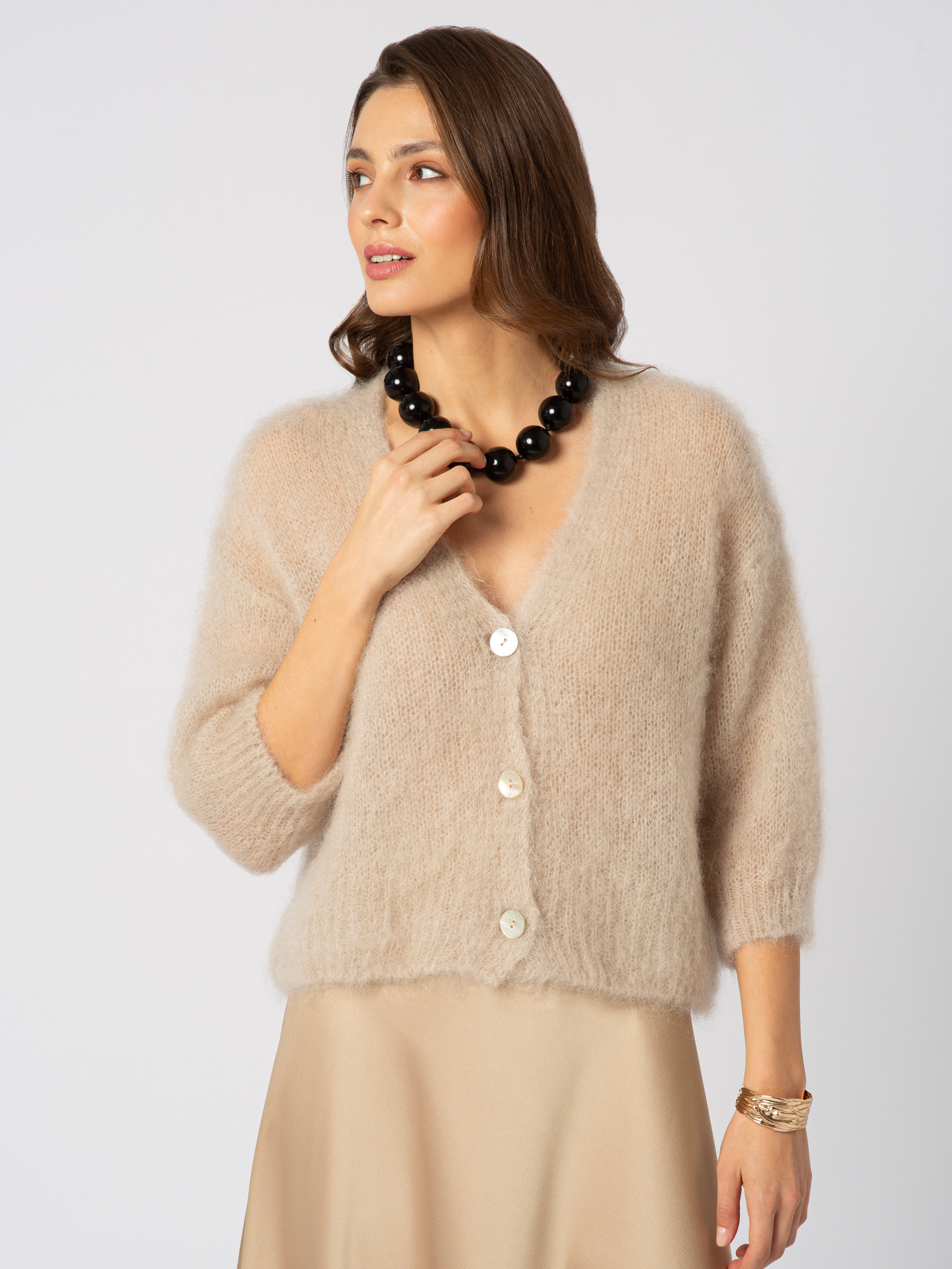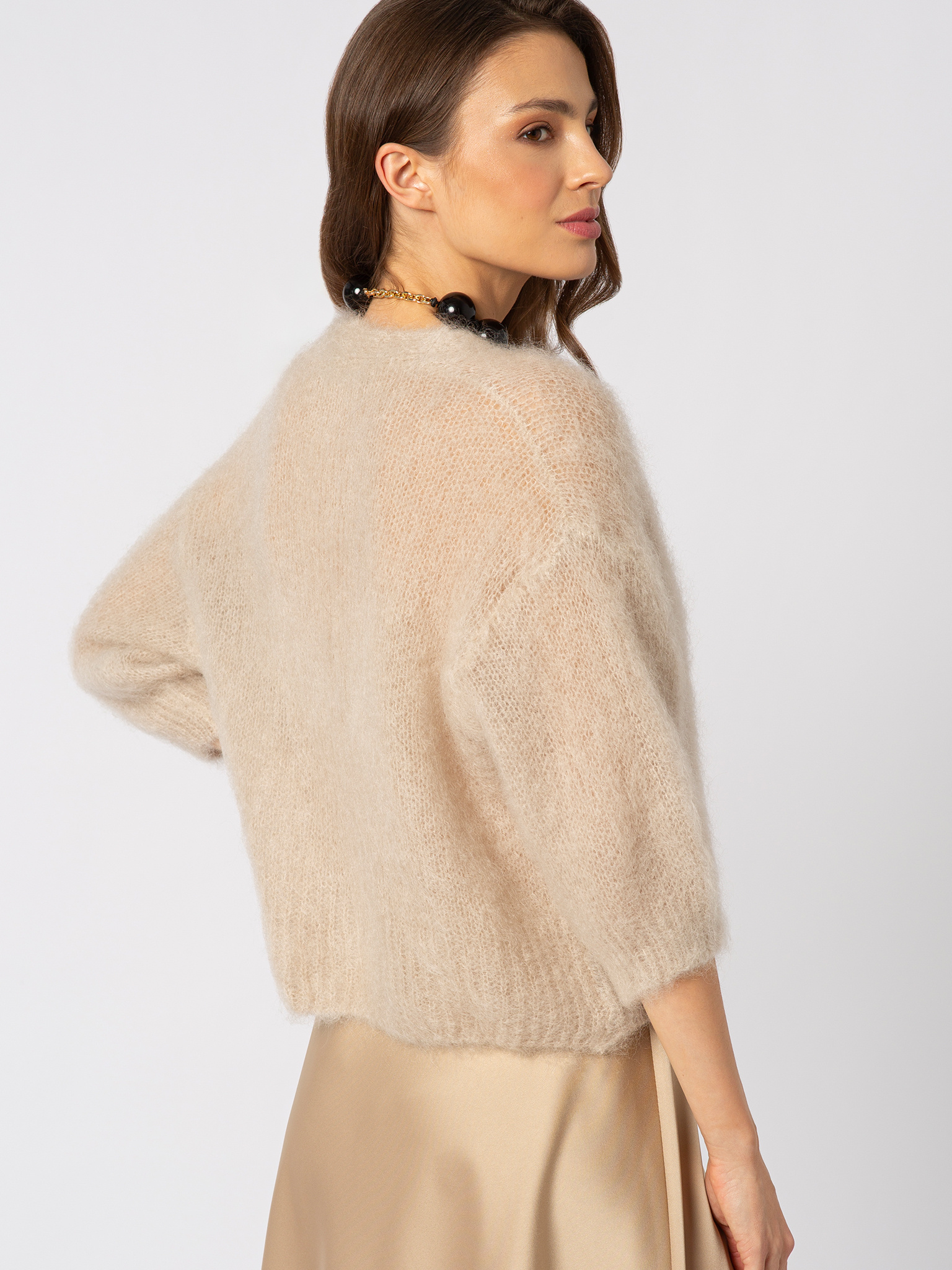 Lekkość, która otula. Ten beżowy sweter z moherem ma miękki, lekko oversizowy krój, dzięki czemu układa się swobodnie i naturalnie — bez wysiłku tworząc efekt „francuskiej nonszalancji”. Dekolt w kształcie V delikatnie wysmukla szyję, a rękaw 3/4 dodaje mu lekkości i nowoczesnego charakteru. Jest zapinany na guziki, dlatego możesz nosić go na dwa sposoby: