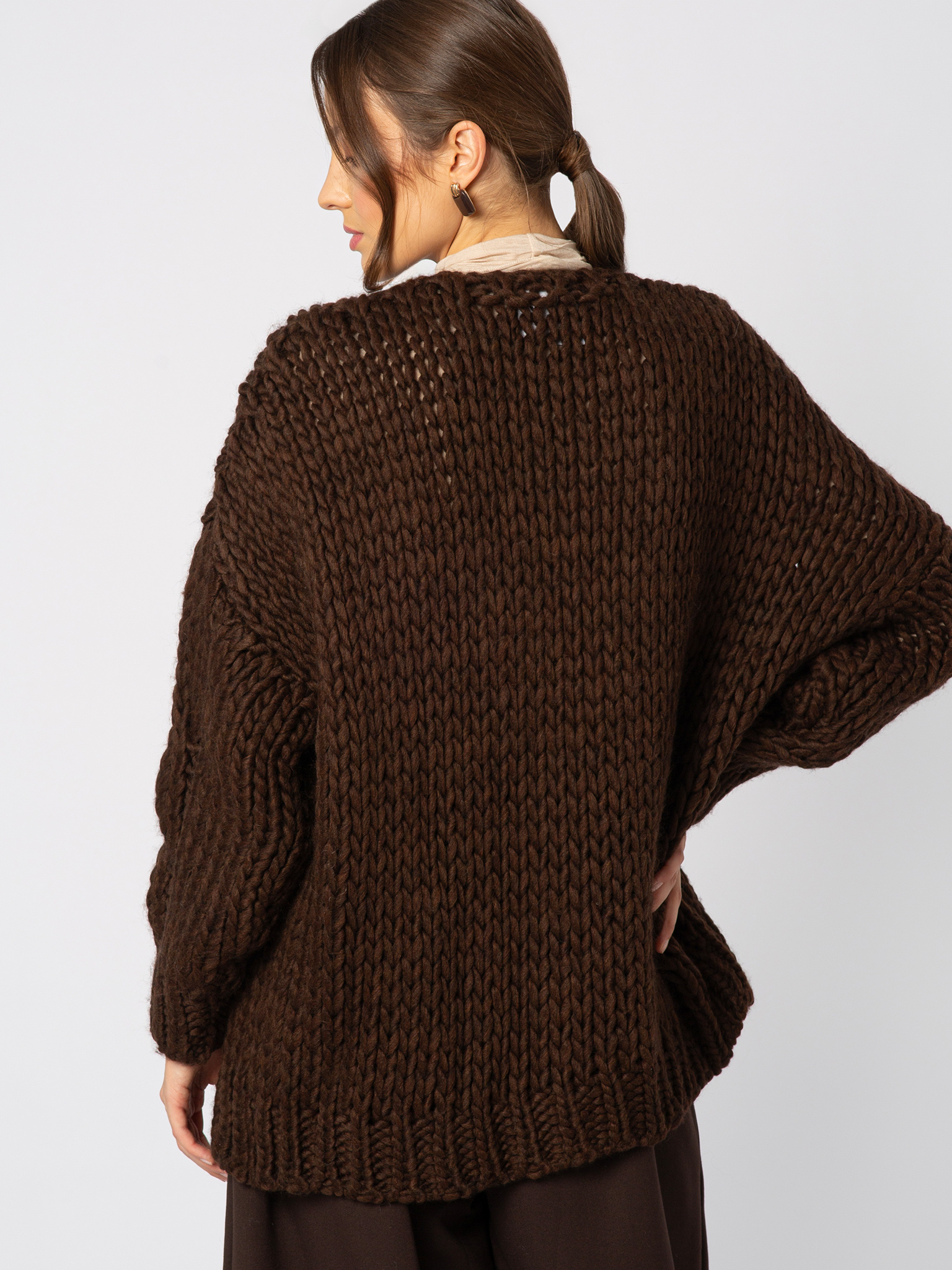 Otula jak ciepłe ramiona w chłodny dzień. Ten brązowy sweter o wyrazistym warkoczowym splocie został wykonany z mięsistej, przyjemnej w dotyku przędzy z wełną, która trzyma ciepło, a jednocześnie układa się miękko na sylwetce. Bez zapięcia — nosisz go tak, jak lubisz: nonszalancko narzucony na ramiona, do sukienki, albo z ulubionymi dżinsami dla cozy look’u z klasą. To sweter, który zostaje w szafie na lata, bo pasuje zawsze.
