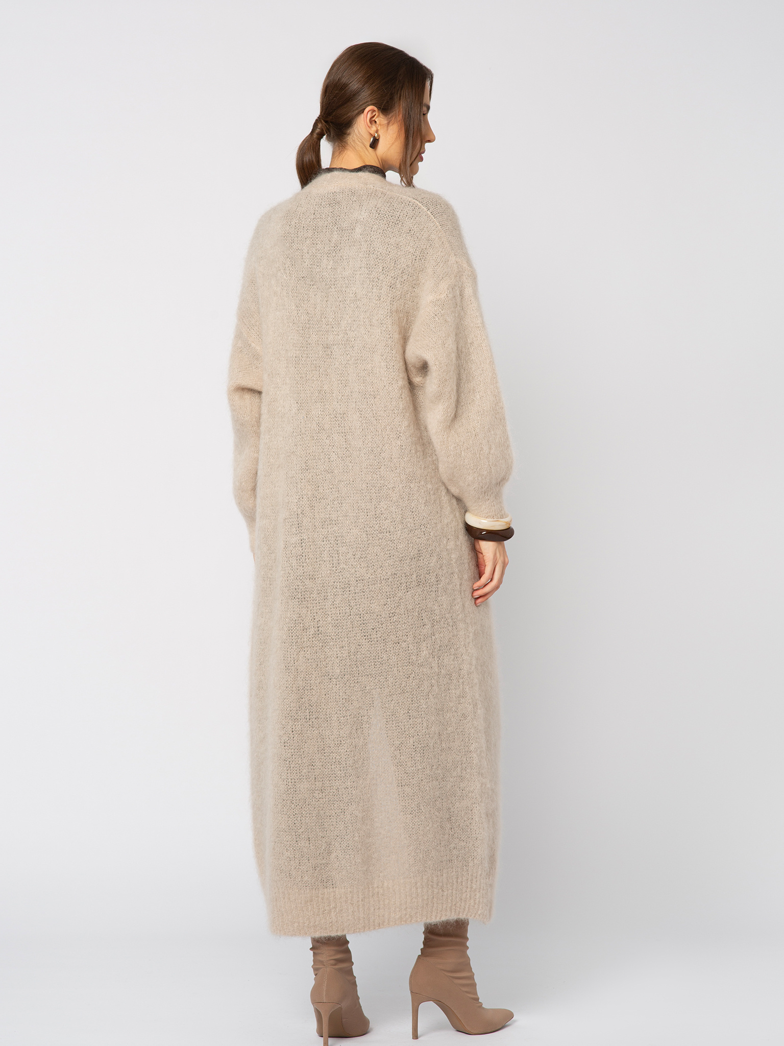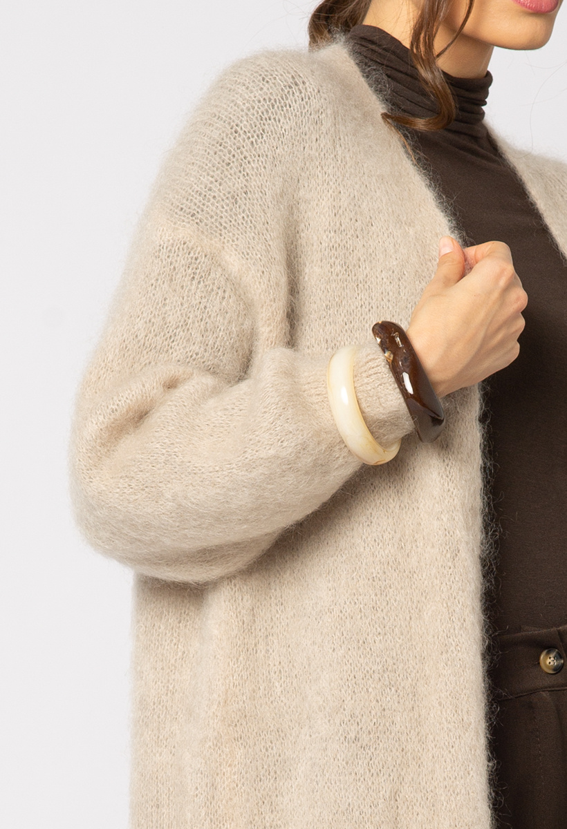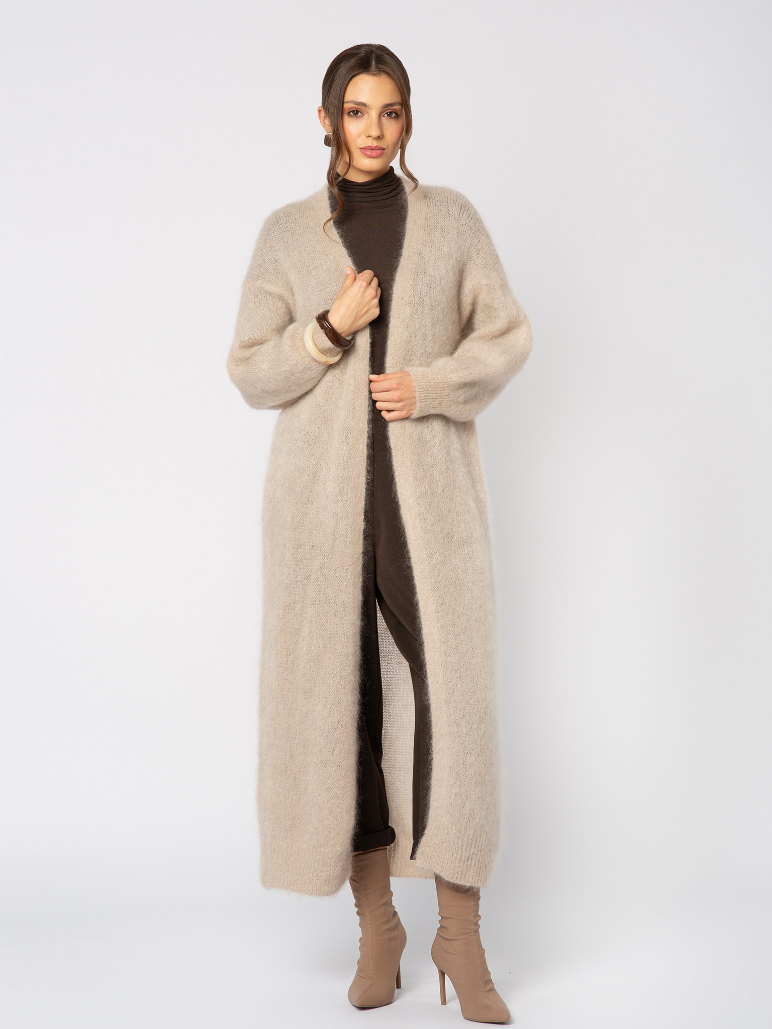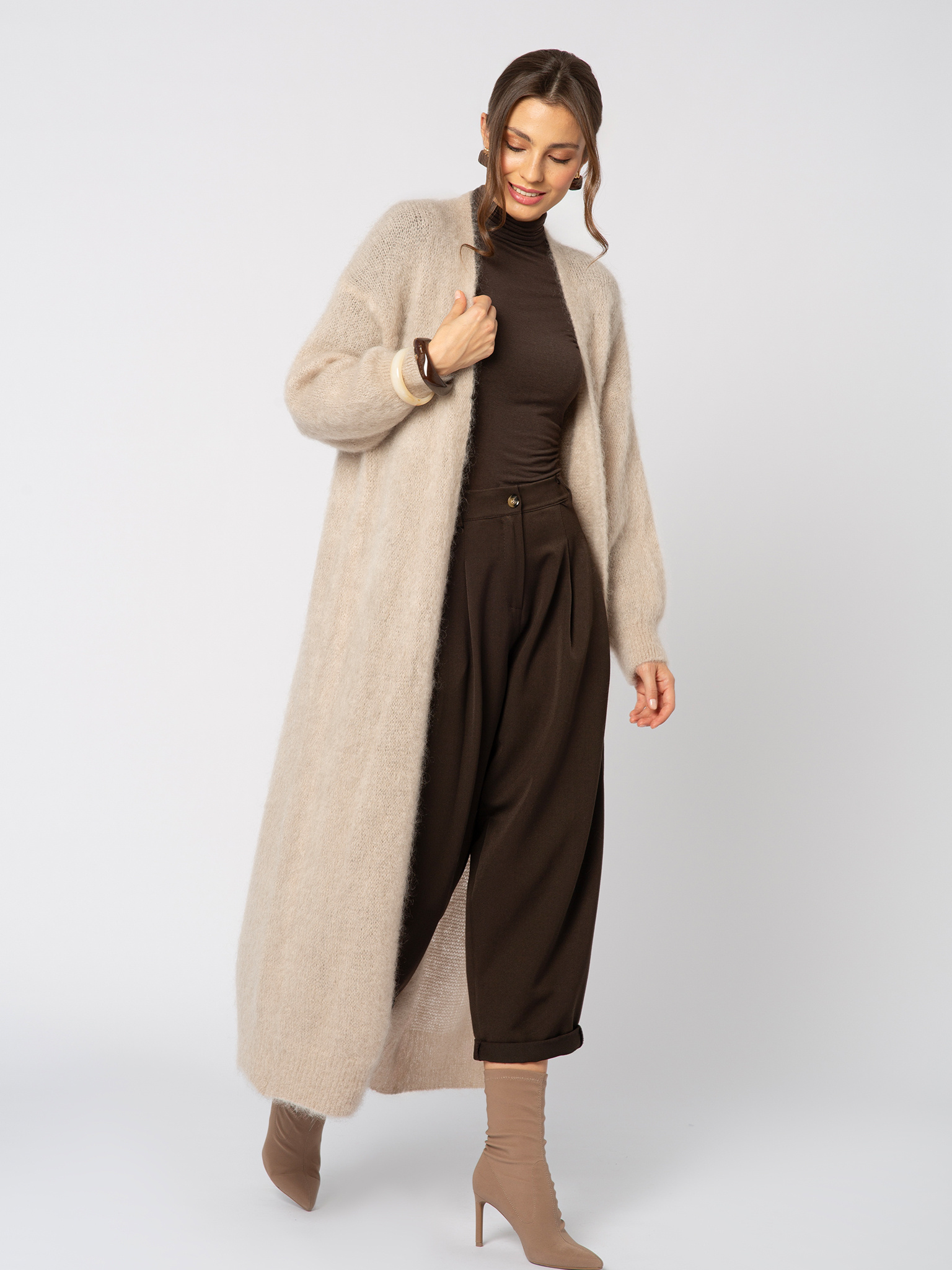- Otul się subtelnym luksusem. Prosty krój i brak zapięcia sprawiają, że miękko opływa sylwetkę, niczym delikatny kocyk – ciepły, a zarazem niezwykle elegancki. Jego jasny, kremowo-beżowy odcień dodaje blasku każdej stylizacji.