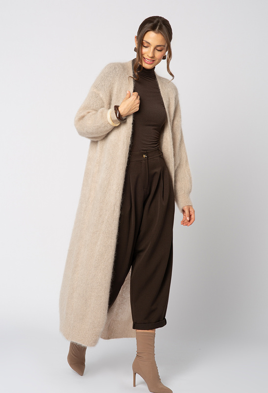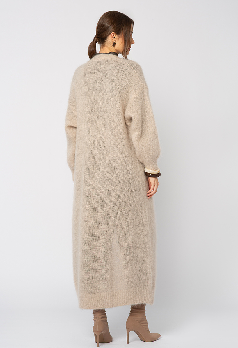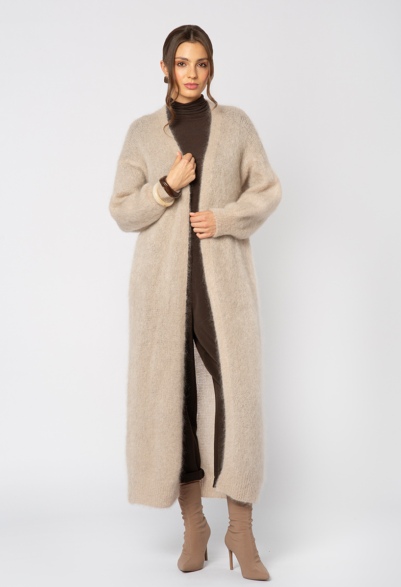 Beżowy mohairowy długi sweter bez zapięcia