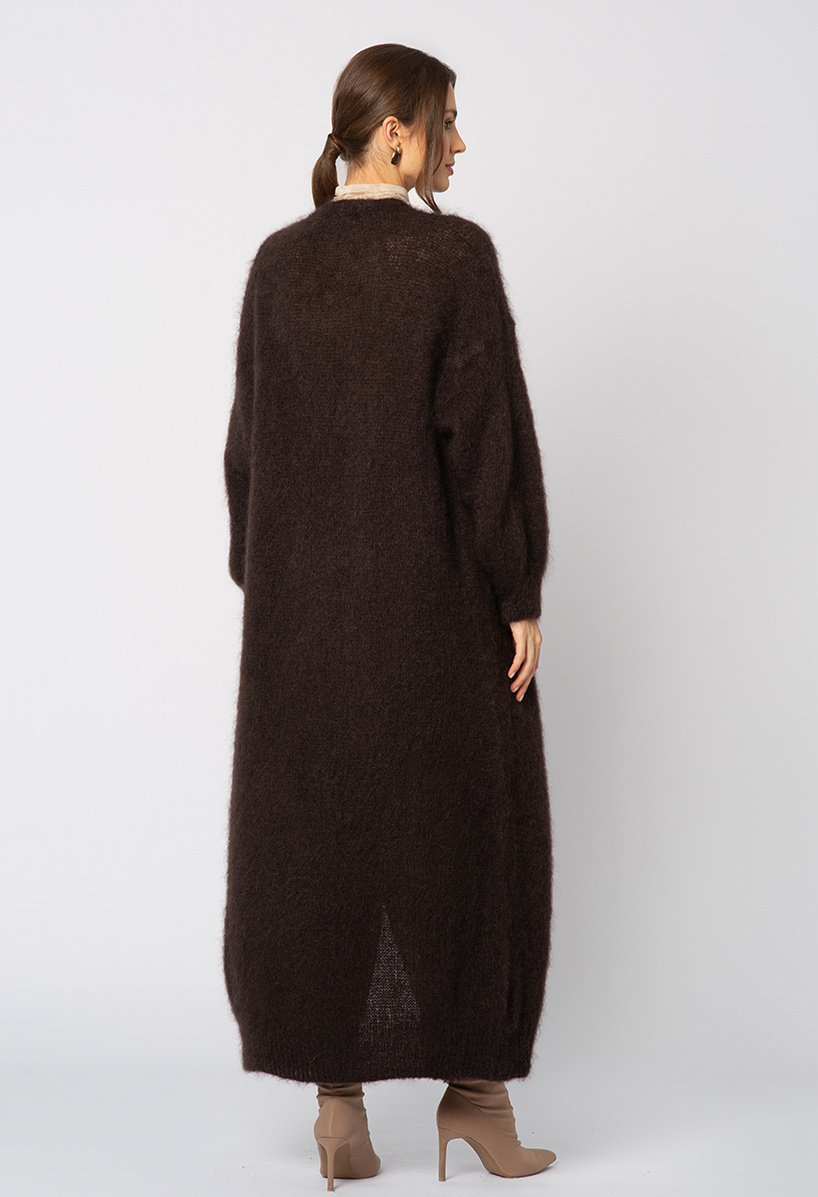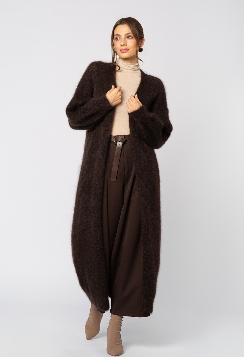 Miękki jak kocyk, stylowy jak Paryż jesienią. Długi mohairowy sweter w odcieniu gorzkiej czekolady otula ciepłem nawet w najchłodniejsze dni. Ma prosty krój, nie posiada zapięcia, dzięki czemu miękko układa się na sylwetce, dodając jej lekkości i nonszalancji. To idealne połączenie wygody i elegancji — pasuje zarówno do spodni, jak i do sukienek, tworząc stylizacje, które zachwycają naturalnym wdziękiem.