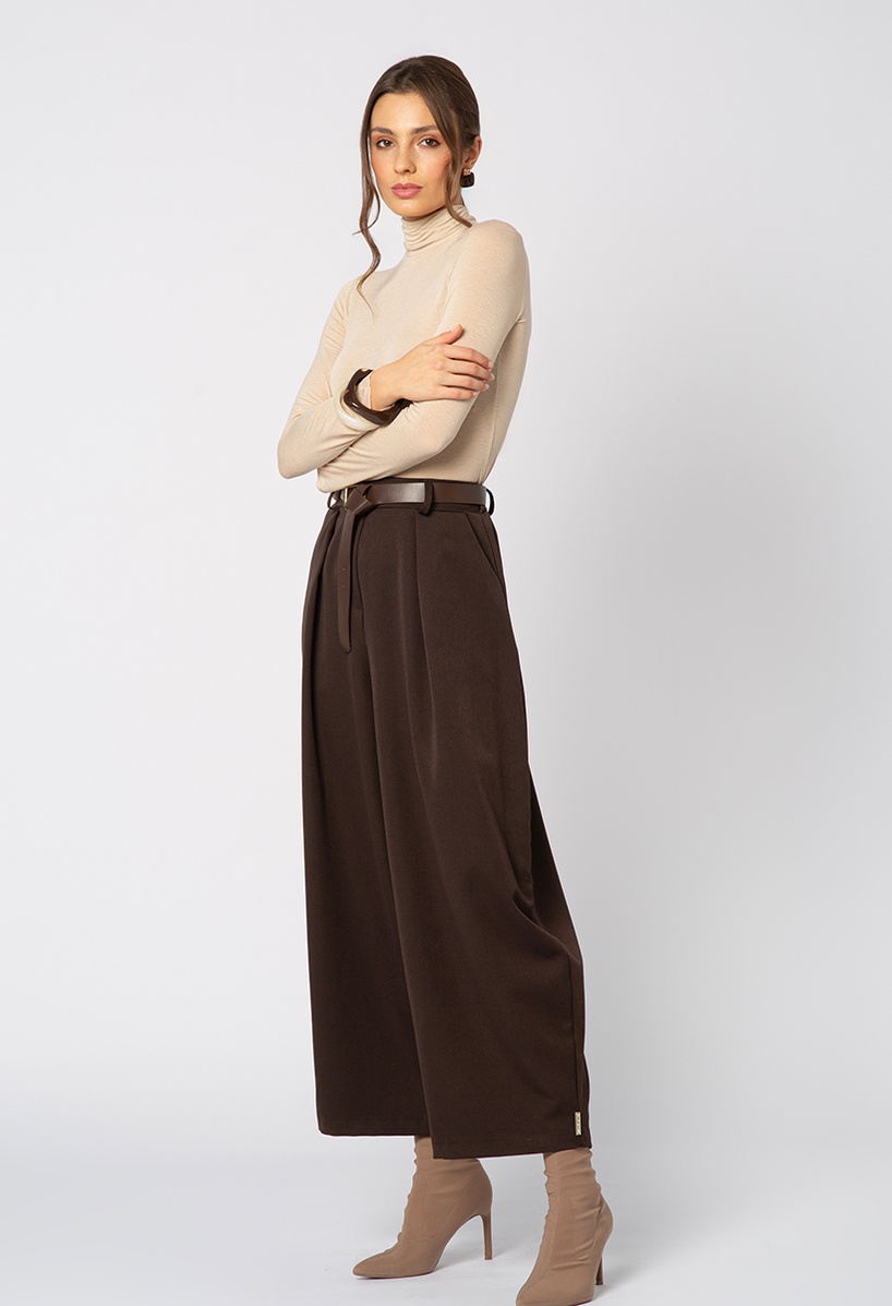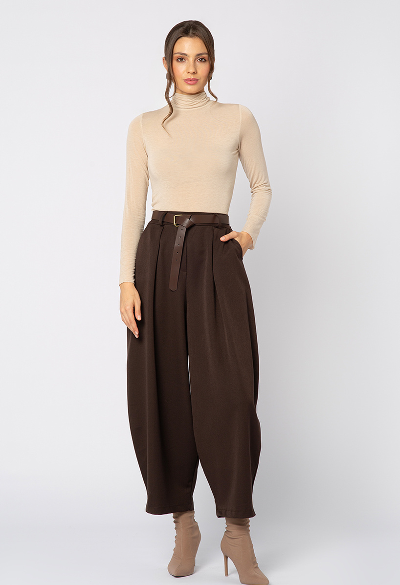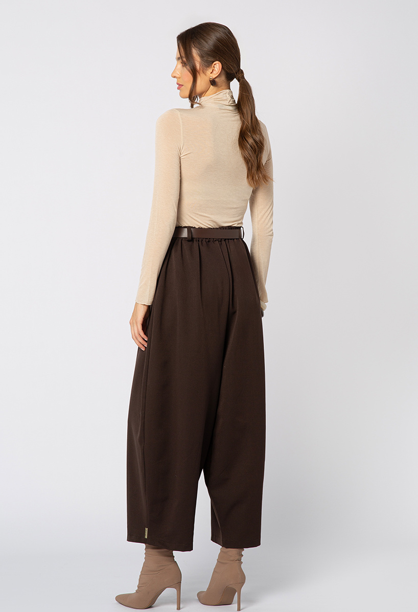 Styl, wygoda i nonszalancja. Brązowe spodnie typu balloon to współczesna interpretacja klasyki – mają wysoki stan, szerokie nogawki lekko zwężane ku dołowi i pasek, który pięknie podkreśla talię. Uszyte z tkaniny o idealnej strukturze, układają się miękko i elegancko, a przy tym są niezwykle komfortowe w noszeniu. Świetnie wyglądają z botkami, koszulą lub dopasowanym golfem – tworząc stylizacje pełne luzu i szyku. To model, który udowadnia, że jesień może być równie stylowa, co wygodna.