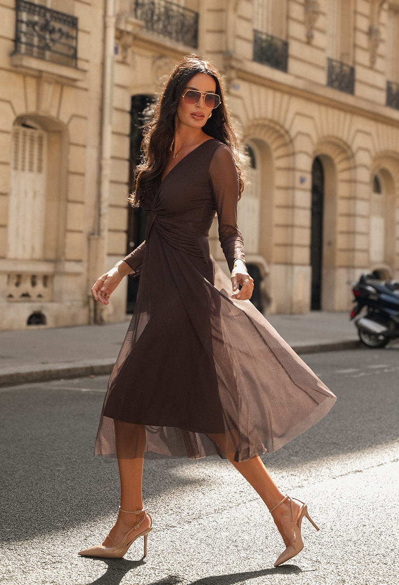 Magia połysku i subtelnej formy – sukienka Philomène w odcieniu głębokiego brązu została stworzona dla kobiet, które kochają elegancję z artystycznym pazurem. Drapowanie w talii podkreśla sylwetkę i nadaje sukience wyjątkowego charakteru. Długość midi sprawia, że całość prezentuje się szykownie i ponadczasowo. Lekko błyszcząca siatka pięknie pracuje w ruchu, sprawiając, że każda chwila nabiera wyjątkowego blasku. To kreacja, która nie tylko zdobi, ale i opowiada Twoją historię.