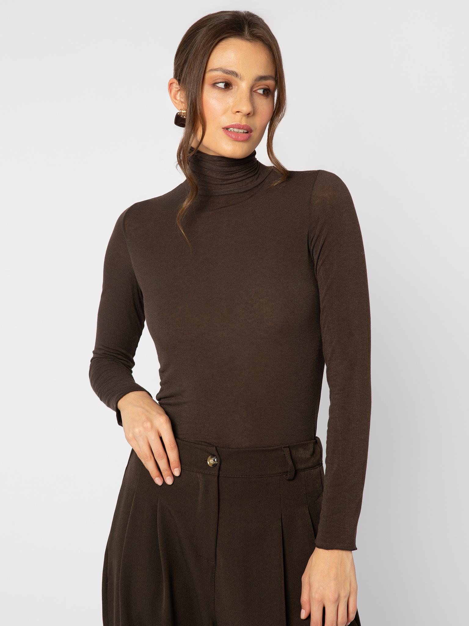 Minimalistyczna baza, która robi różnicę. Ten czekoladowy golf z miękkiej wiskozowej dzianiny z dodatkiem kaszmiru jest wyjątkowo przyjemny dla skóry i pięknie układa się na sylwetce. To taka rzecz w szafie, która po prostu pasuje do wszystkiego.