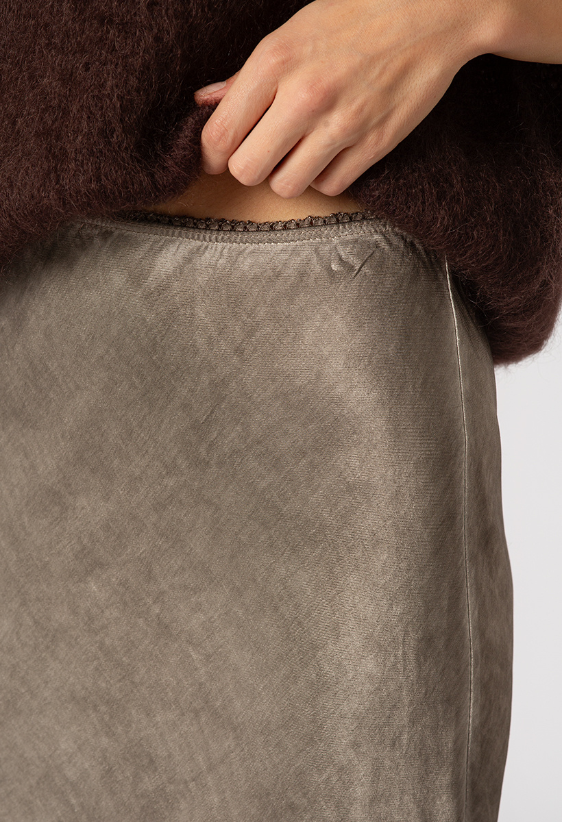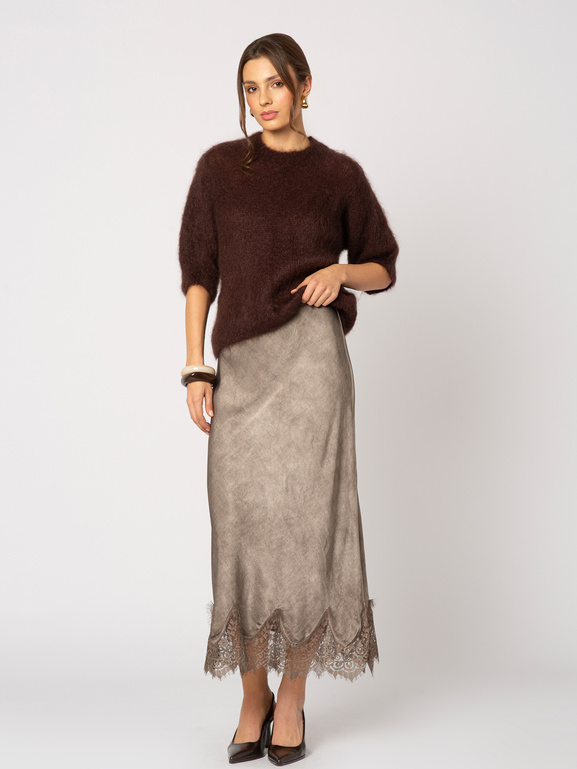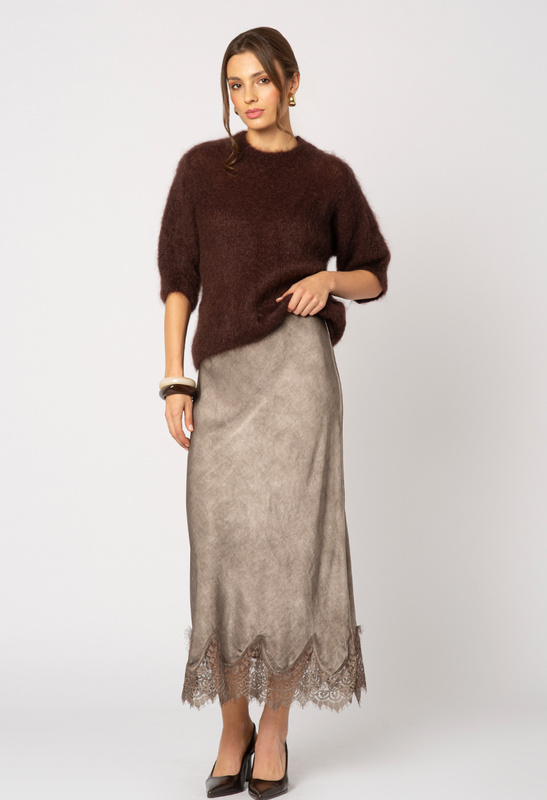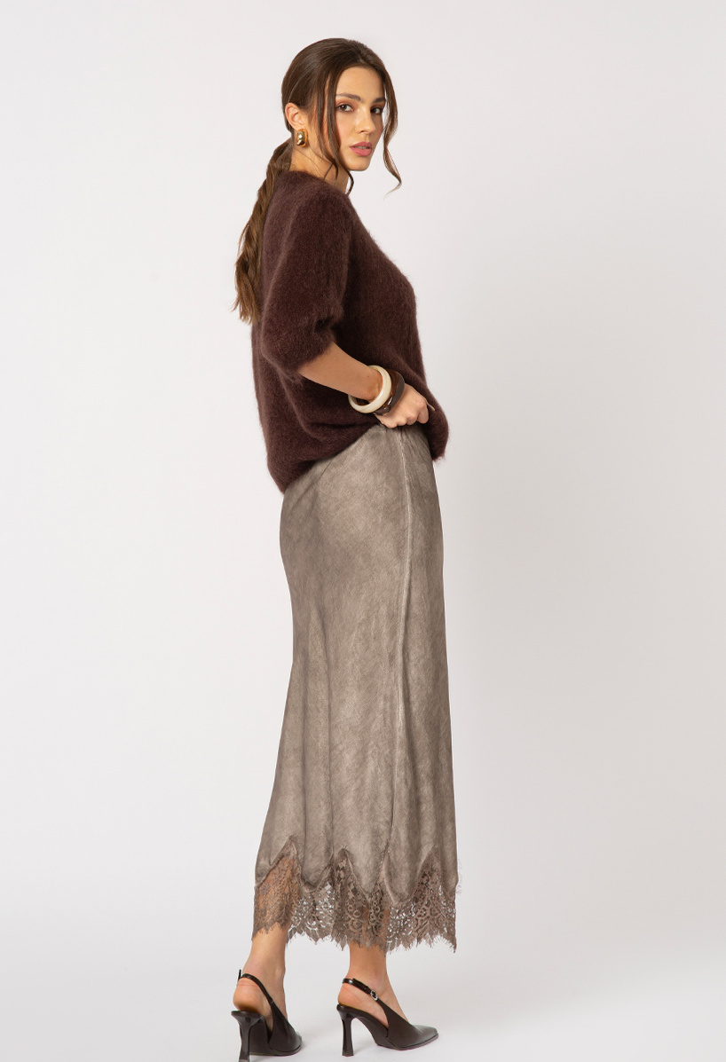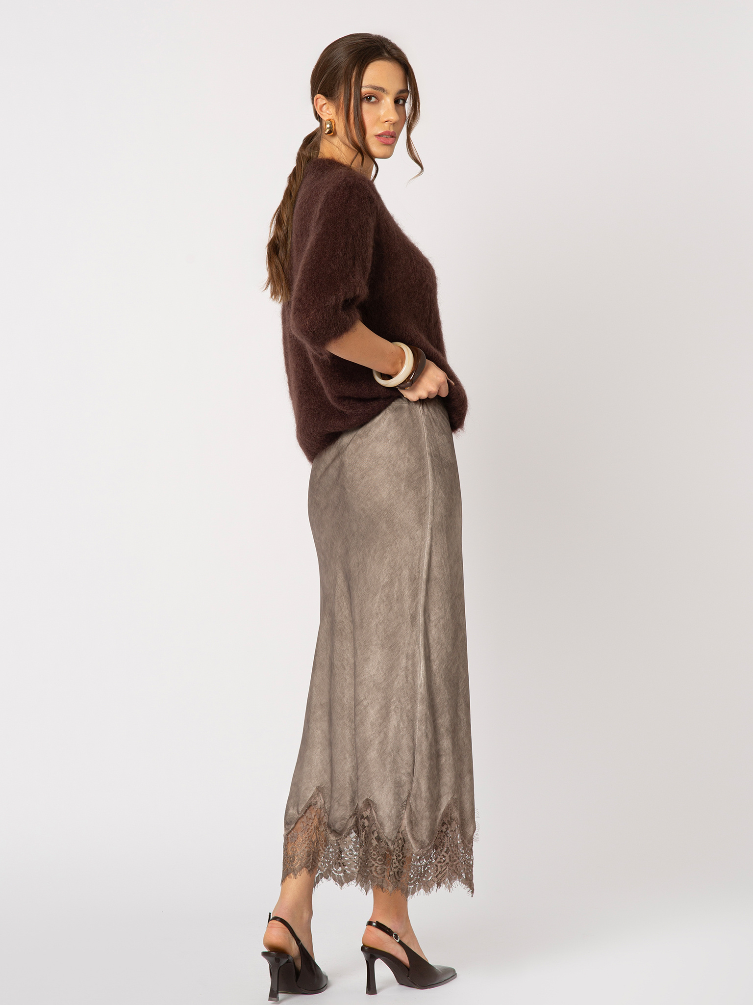 Satynowa wiskozowa spódnica z koronką w kolorze fango