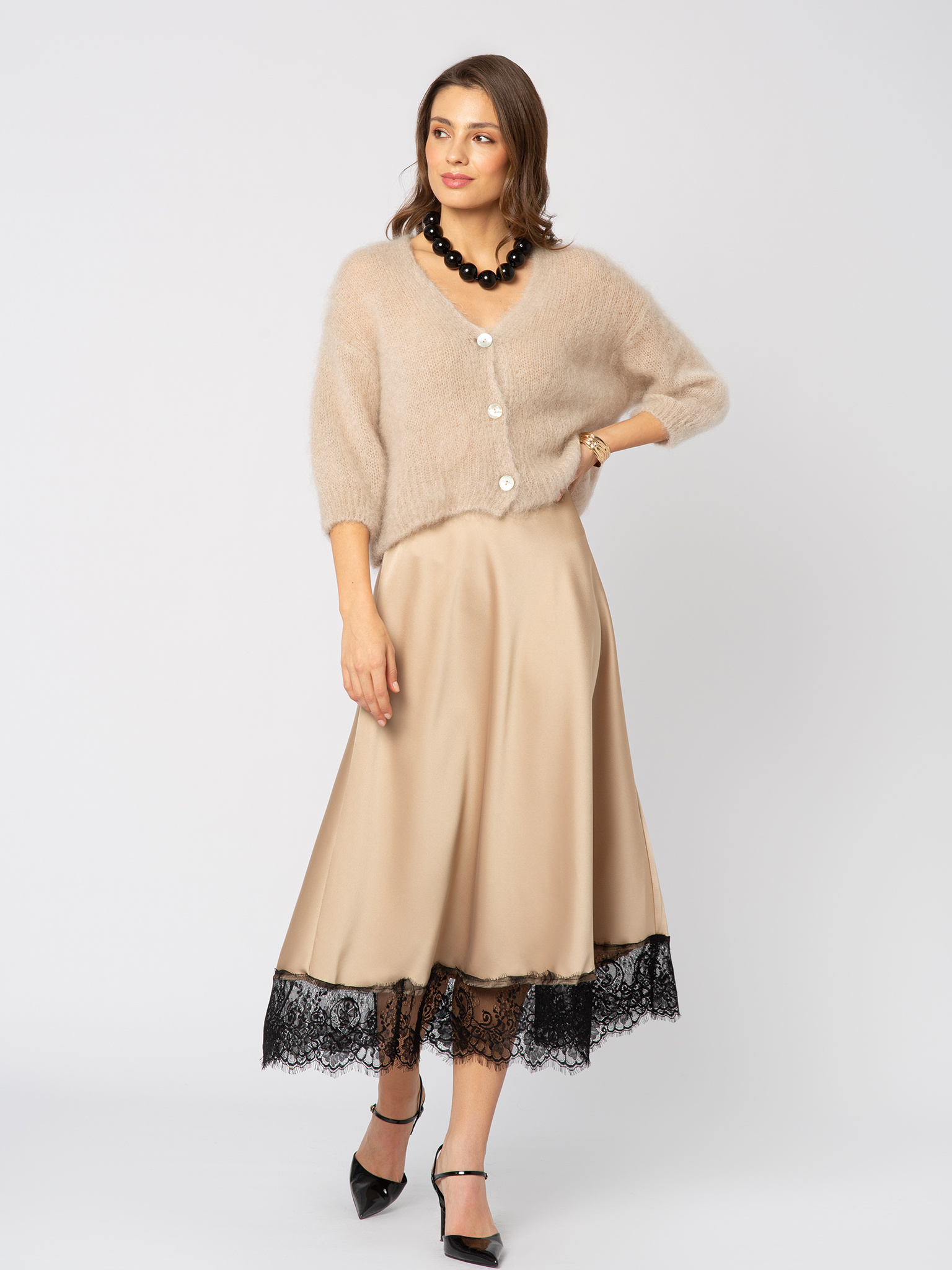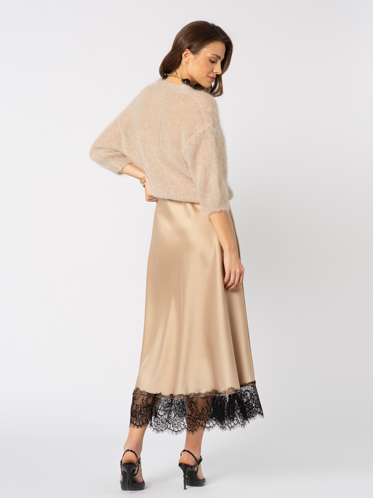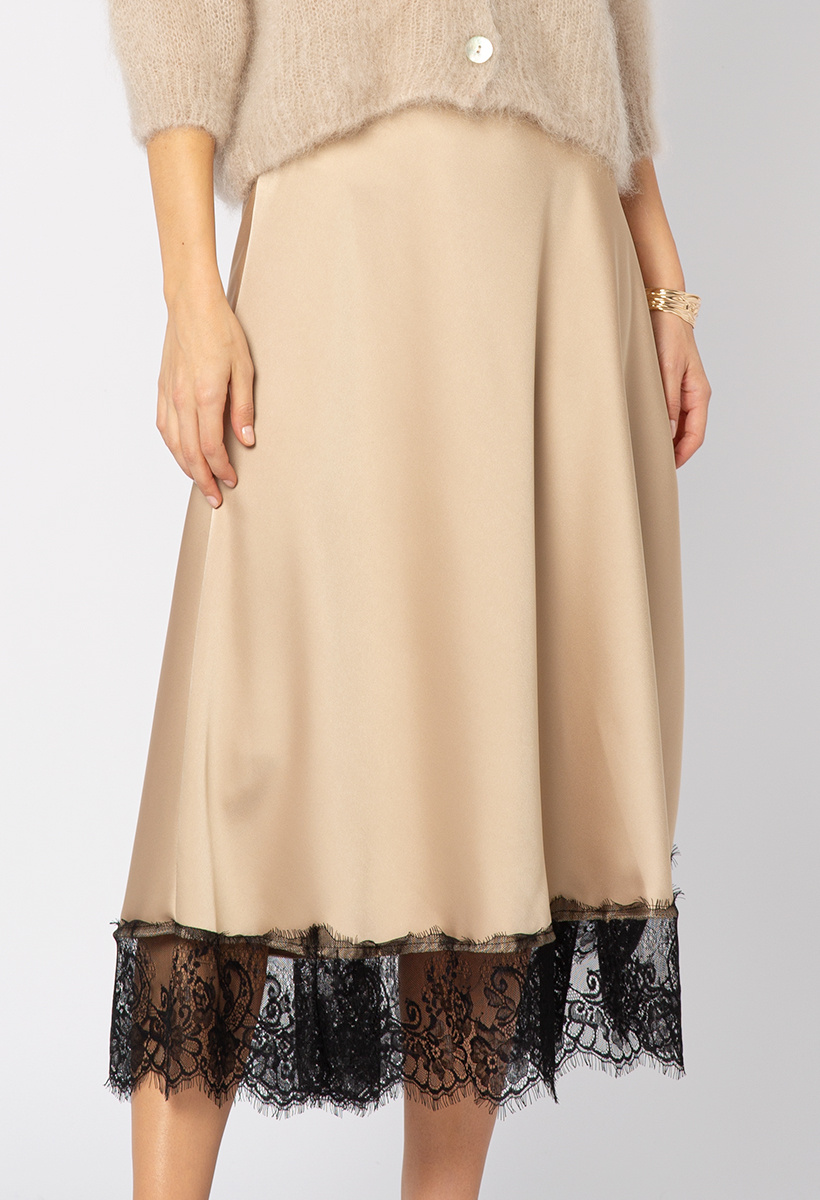 Zmysłowa, ale nie przesadzona. Ta beżowa satynowa spódnica z wiskozy miękko układa się na sylwetce, subtelnie połyskując przy ruchu. Dół wykończony koronką dodaje jej lekkości i kobiecej finezji — to ten detal, który robi efekt bez wysiłku.