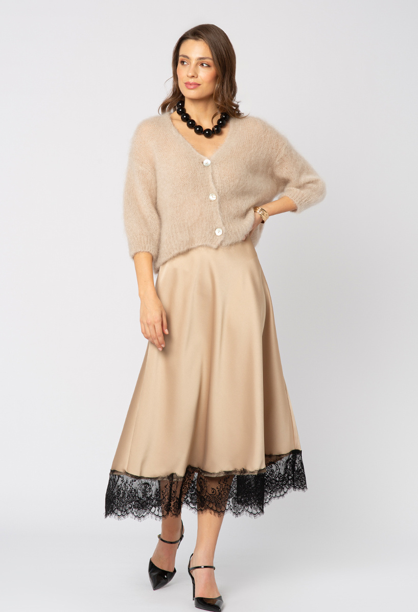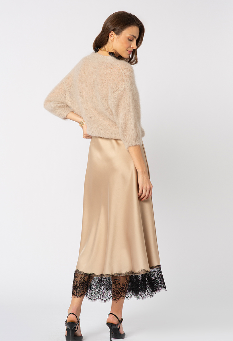 Beżowa satynowa wiskozowa spódnica z koronką
