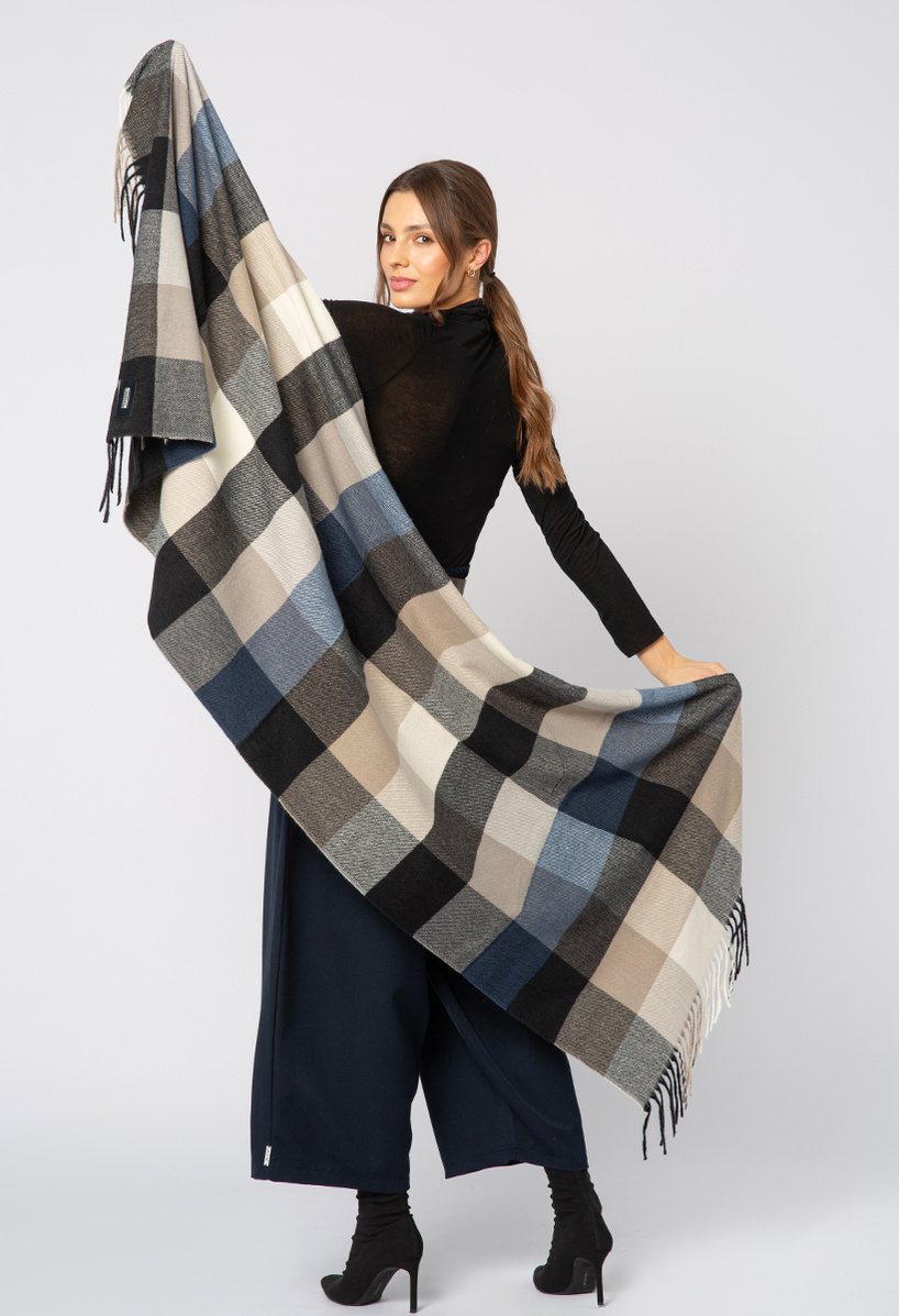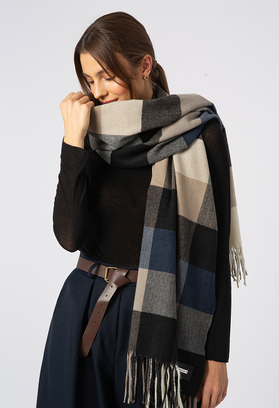 Wiskozowy szal w beżowo-granatową kratę