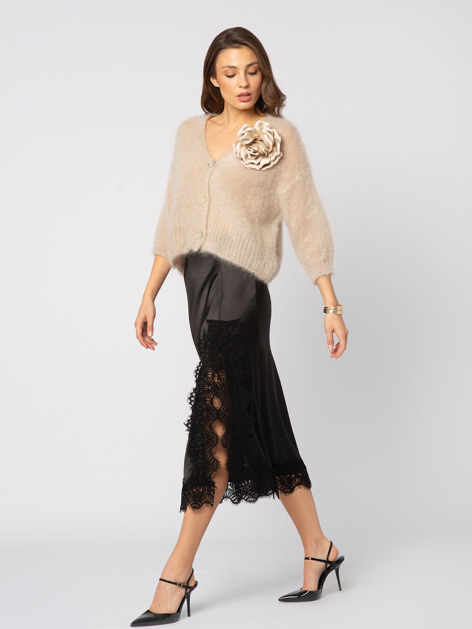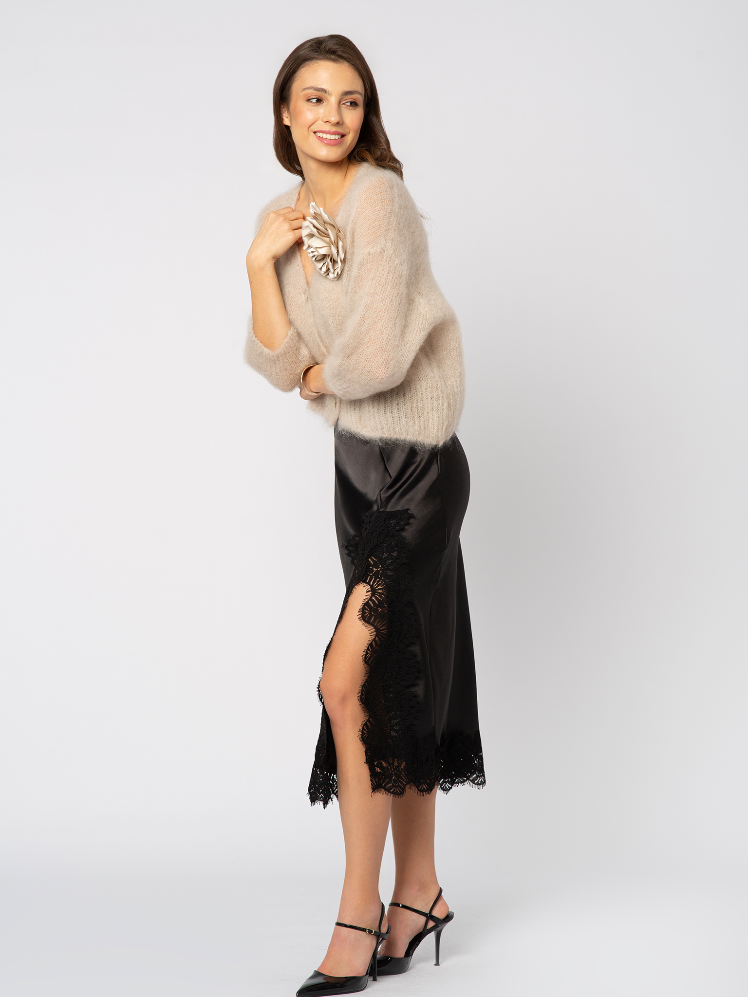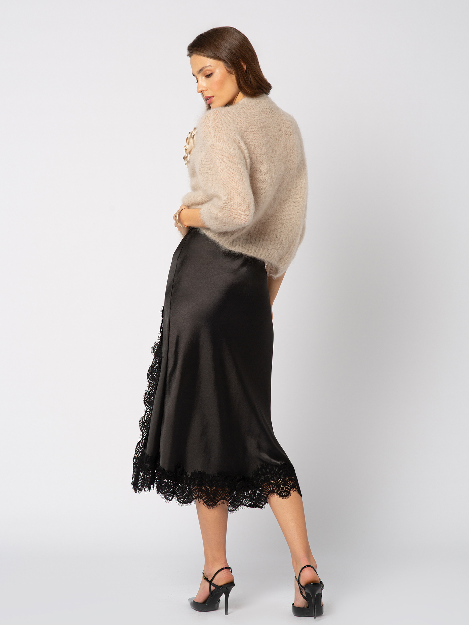 Czarna satynowa spódnica, która porusza się razem z Tobą. Miękka, lekko połyskująca tkanina pięknie układa się na sylwetce, a subtelna koronka przy dolnej krawędzi dodaje jej kobiecej finezji. Z przodu rozcięcie odsłania nogę dokładnie w tym miejscu, które robi efekt — zmysłowe, ale wciąż z klasą.
