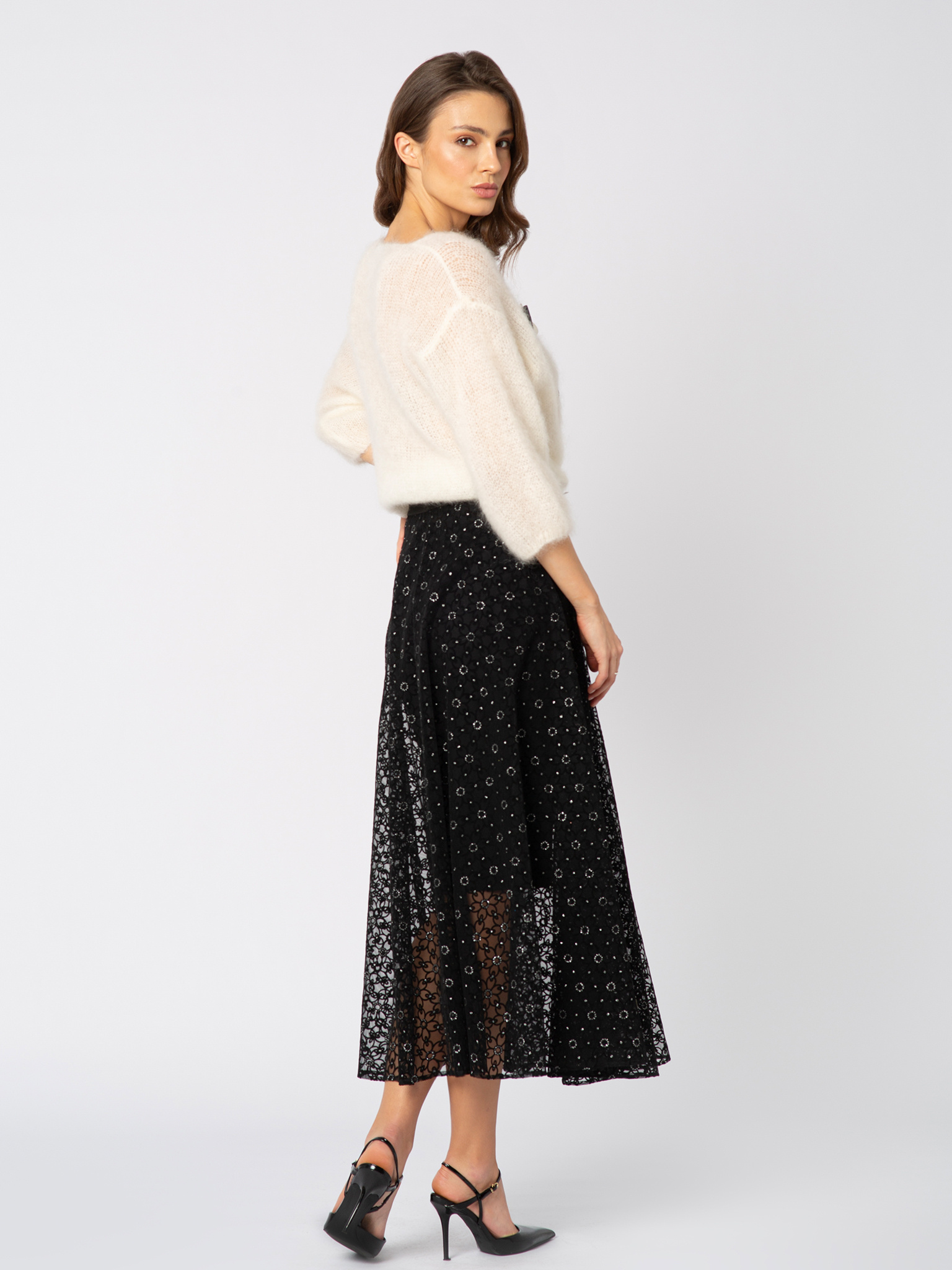 Dopasowana podszewka zapewnia komfort i elegancję, a delikatna gumka w talii pozwala spódnicy idealnie dopasować się do figury i swobodnie układać. Długość do połowy łydki jest ponadczasowa, nowoczesna i niezwykle kobieca.