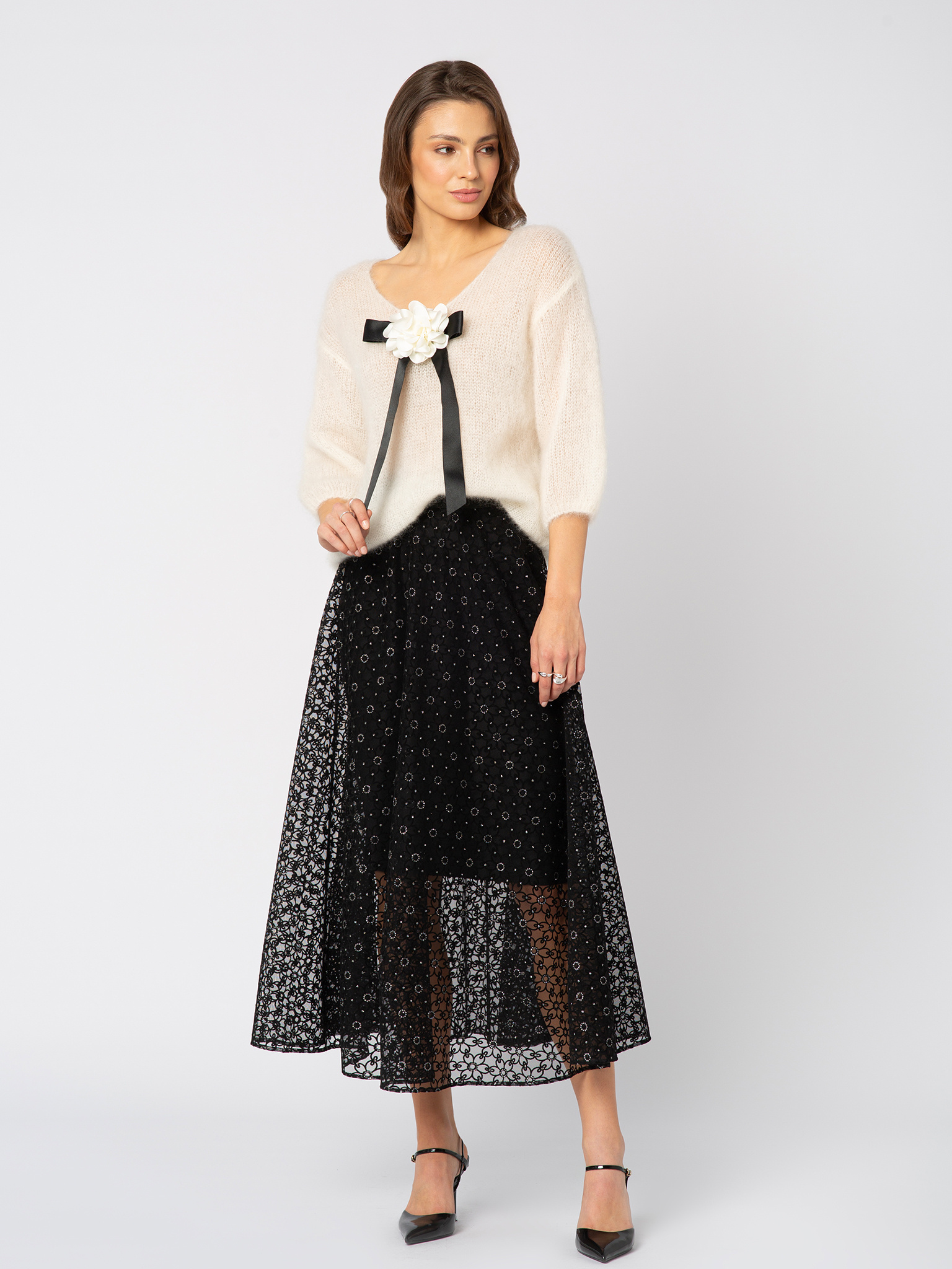 To spódnica, która od razu dodaje stylizacji lekkości i wyjątkowego charakteru. Manon została uszyta z czarnego, półtransparentnego tiulu, na którym flokowe, aksamitne kwiaty tworzą subtelny, trójwymiarowy wzór. Materiał pięknie zachowuje się w ruchu, a rozkloszowany krój miękko podkreśla linię sylwetki.